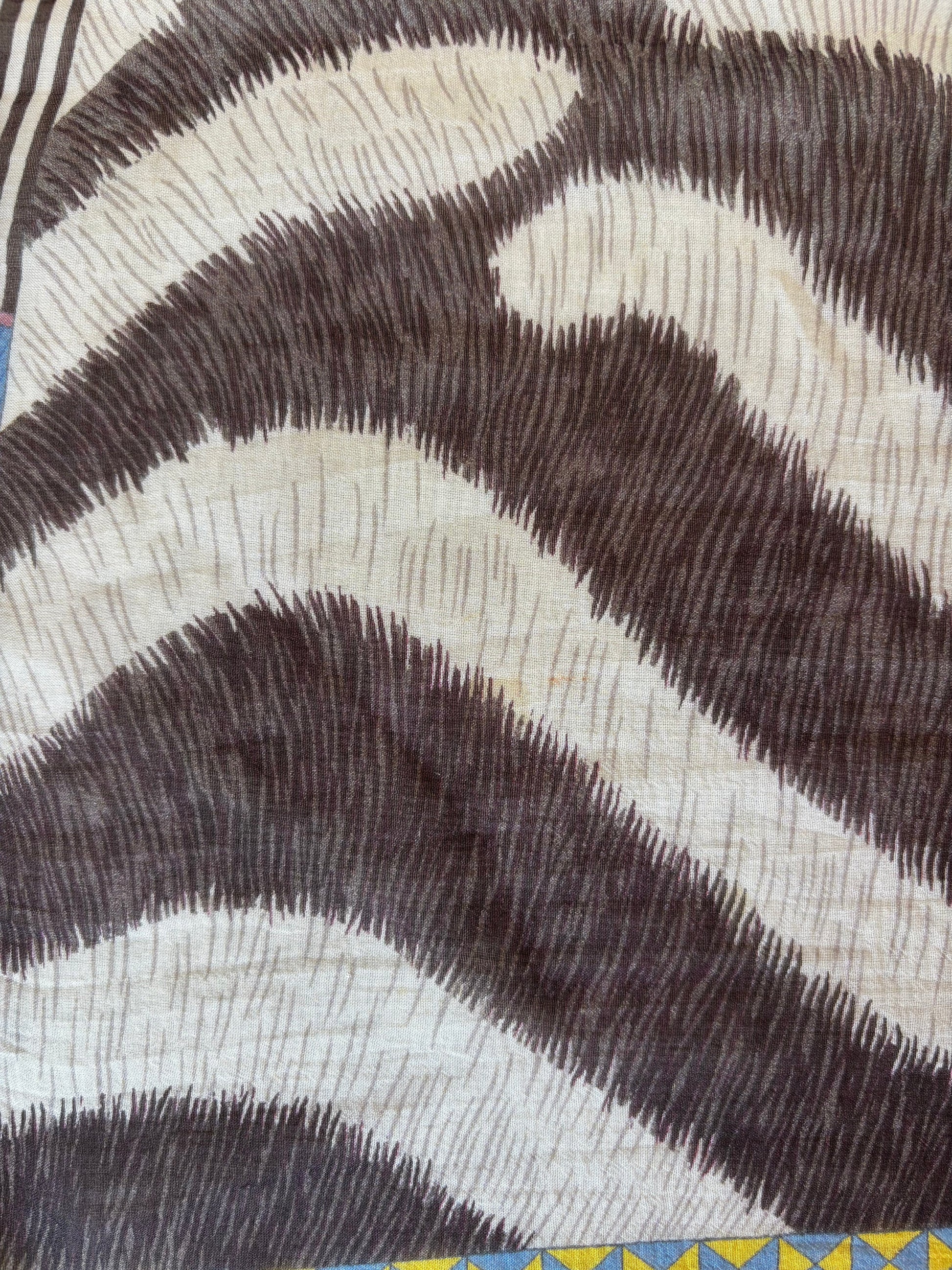 Hermes 'Pelages et Camouflage' silk chiffon scarf in black and white animal print with muticolour geometric accents and a pink trim.