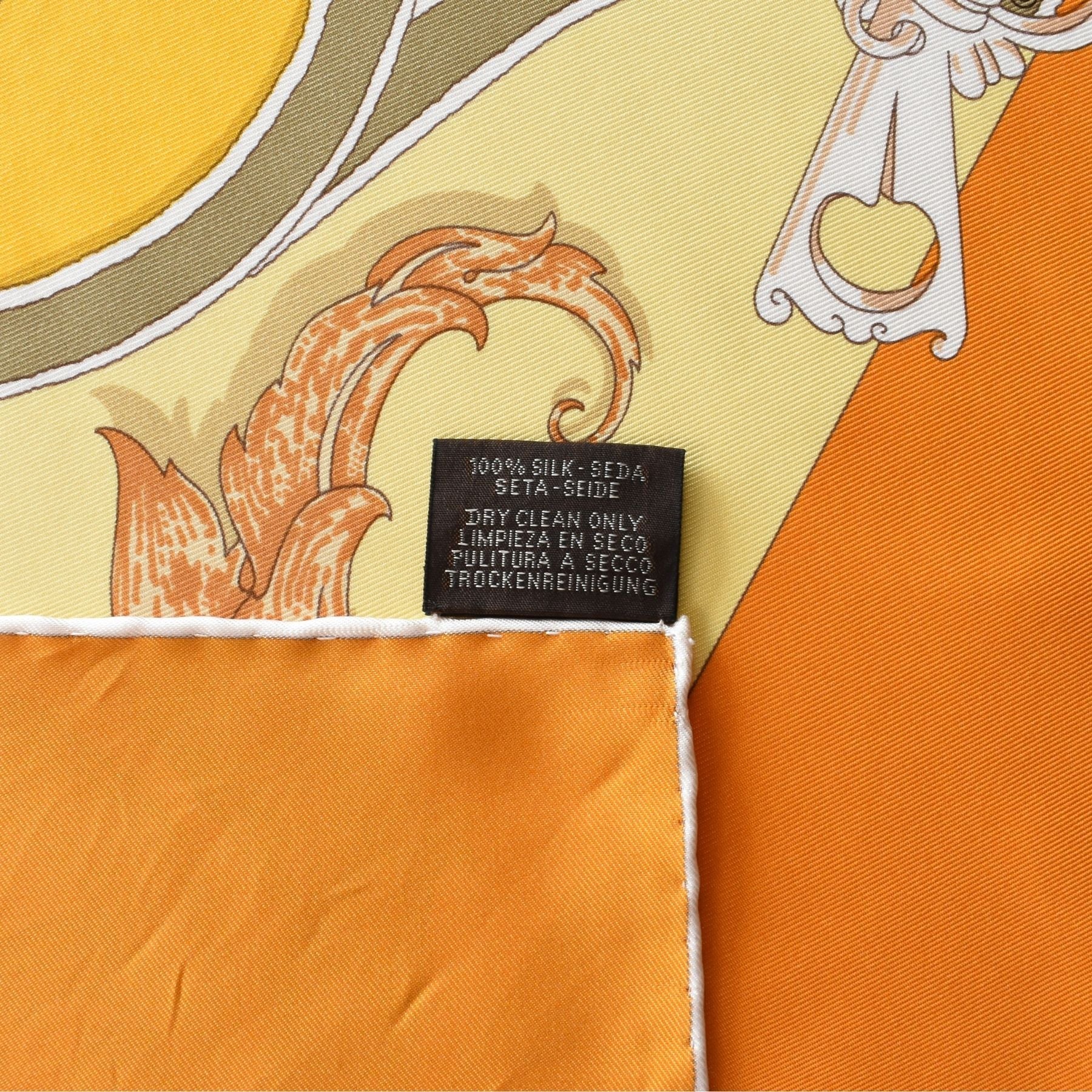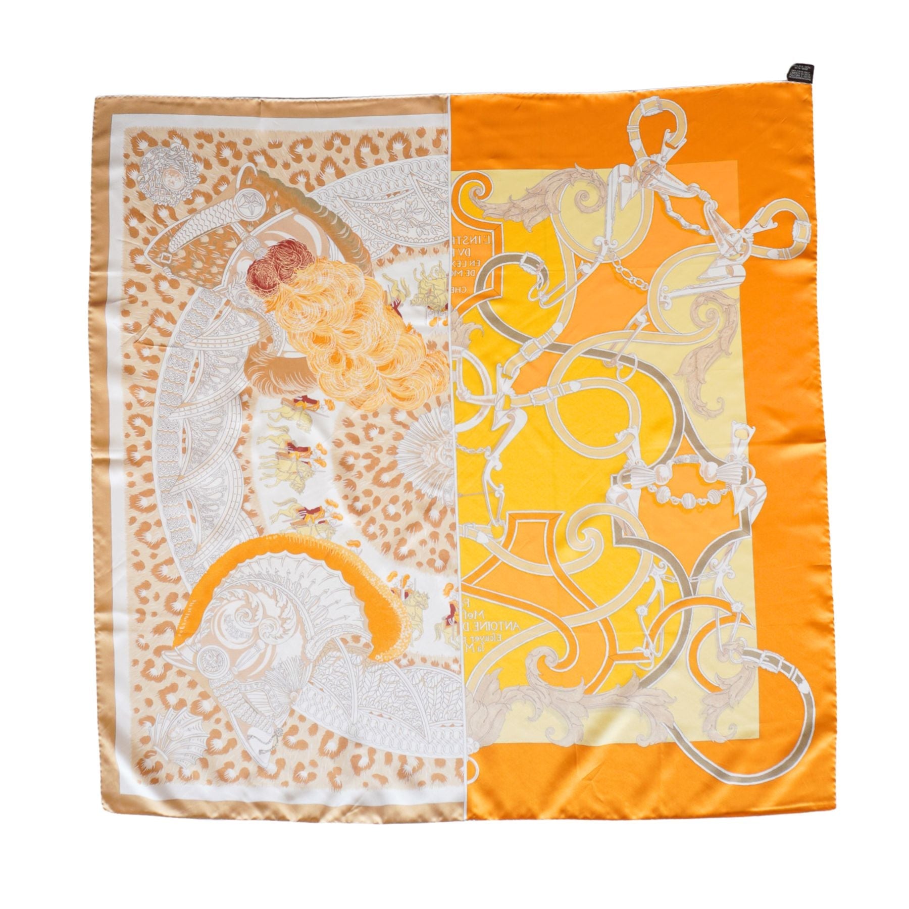 Hermes 'Plumets Du Roy' scarf in orange, white, and yellow silk with a split design featuring two iconic prints: L'Instructions du Roy by Henri d'Origny and Casques et Plumets by Julie Abadie.