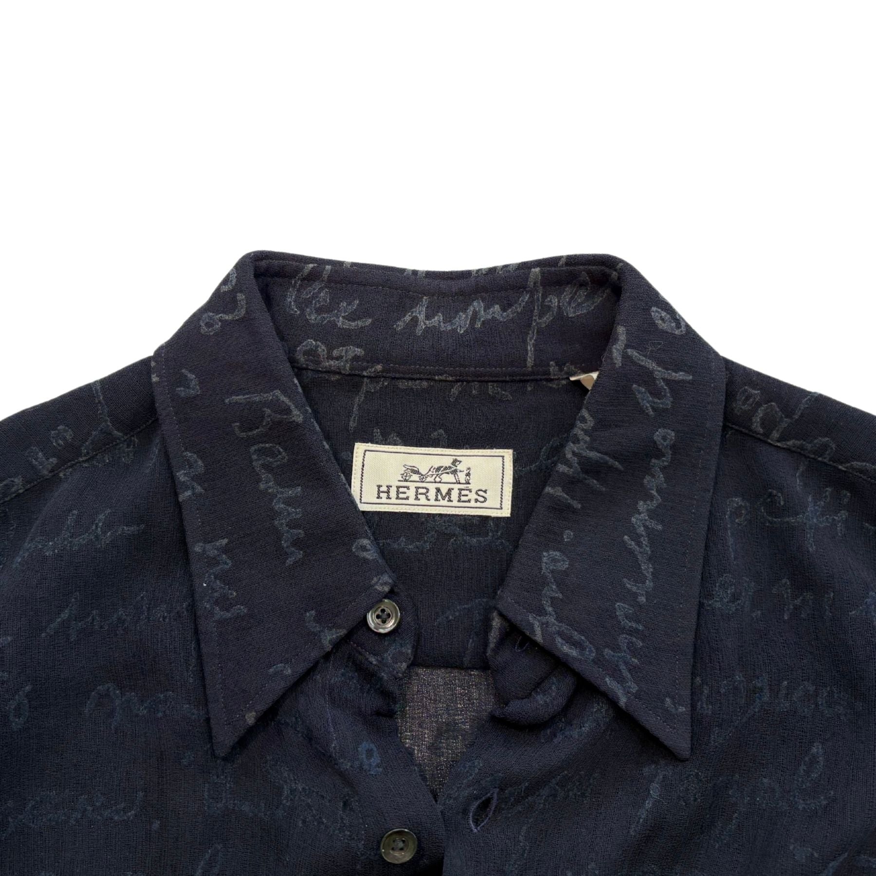 Hermes vintage button-down shirt in navy blue semi-sheer viscose with velour cursive writing graphics woven throughout, small buttons, and a point collar. The shirt has small gold logo-embossed buttons on the cuffs.