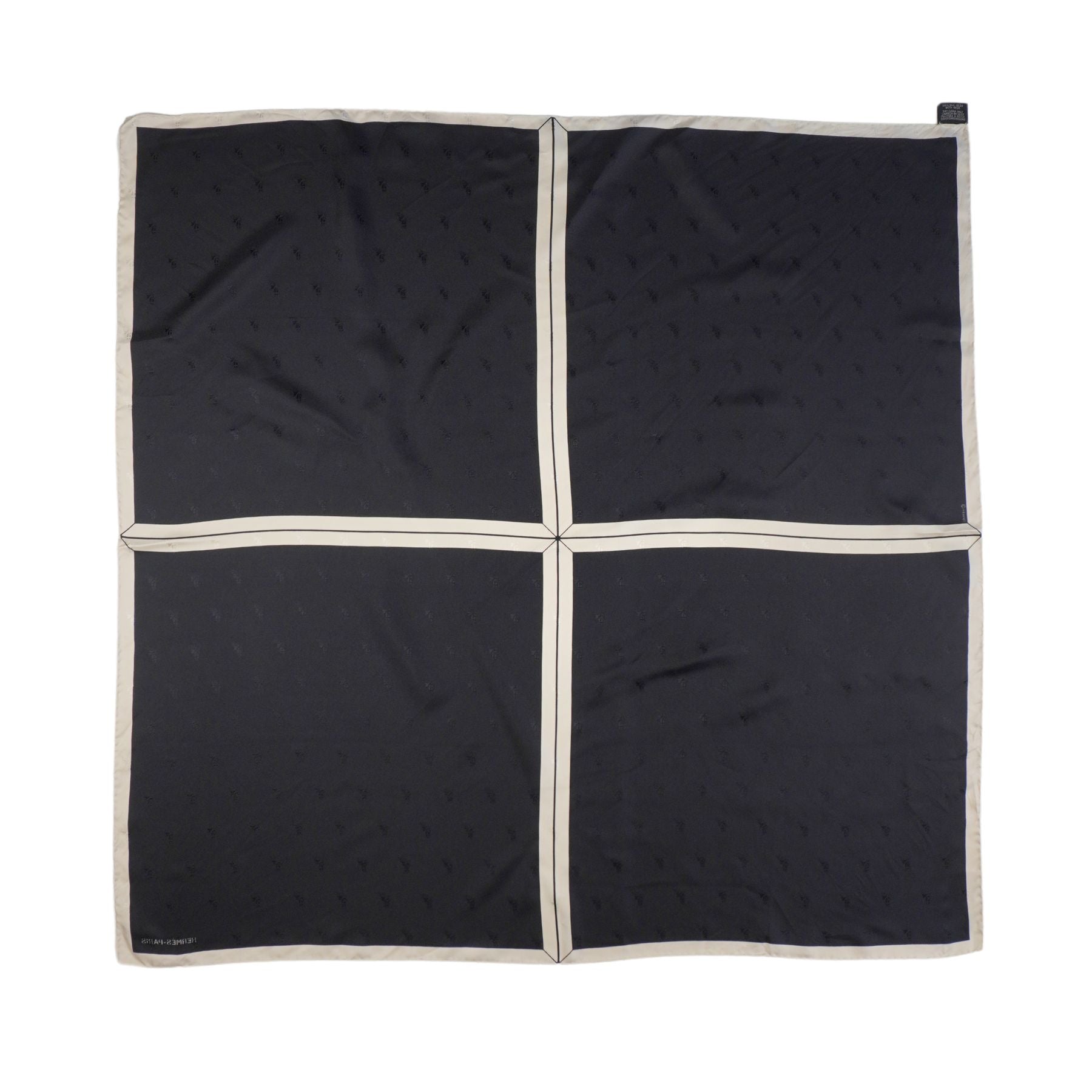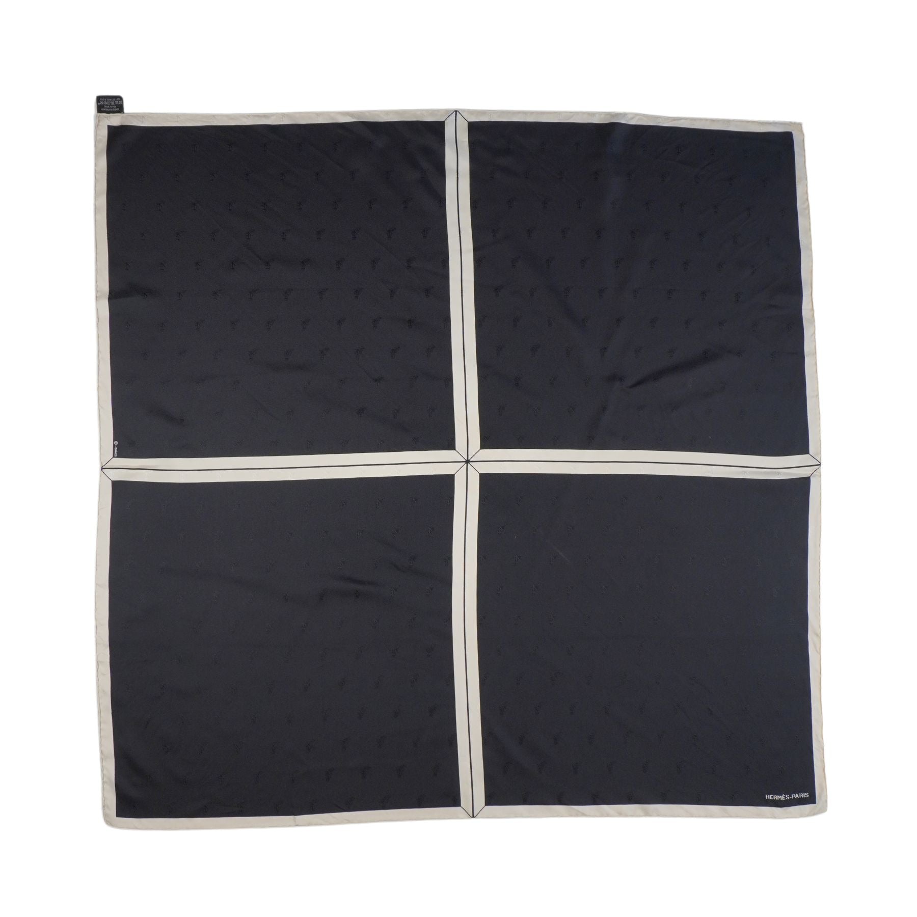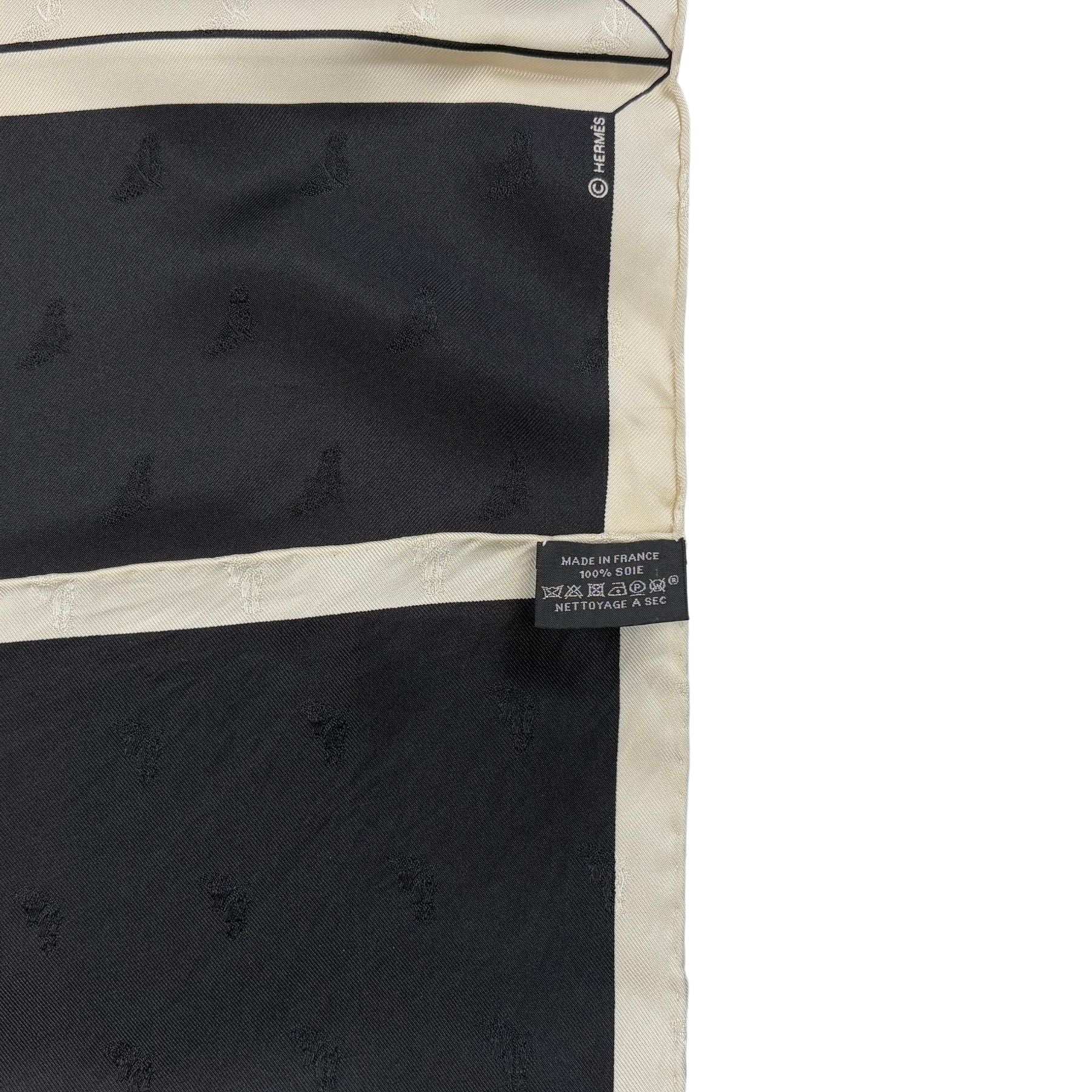 Hermes quadrant scarf in black silk with white borders and featuring a jacquard horse head detail throughout.