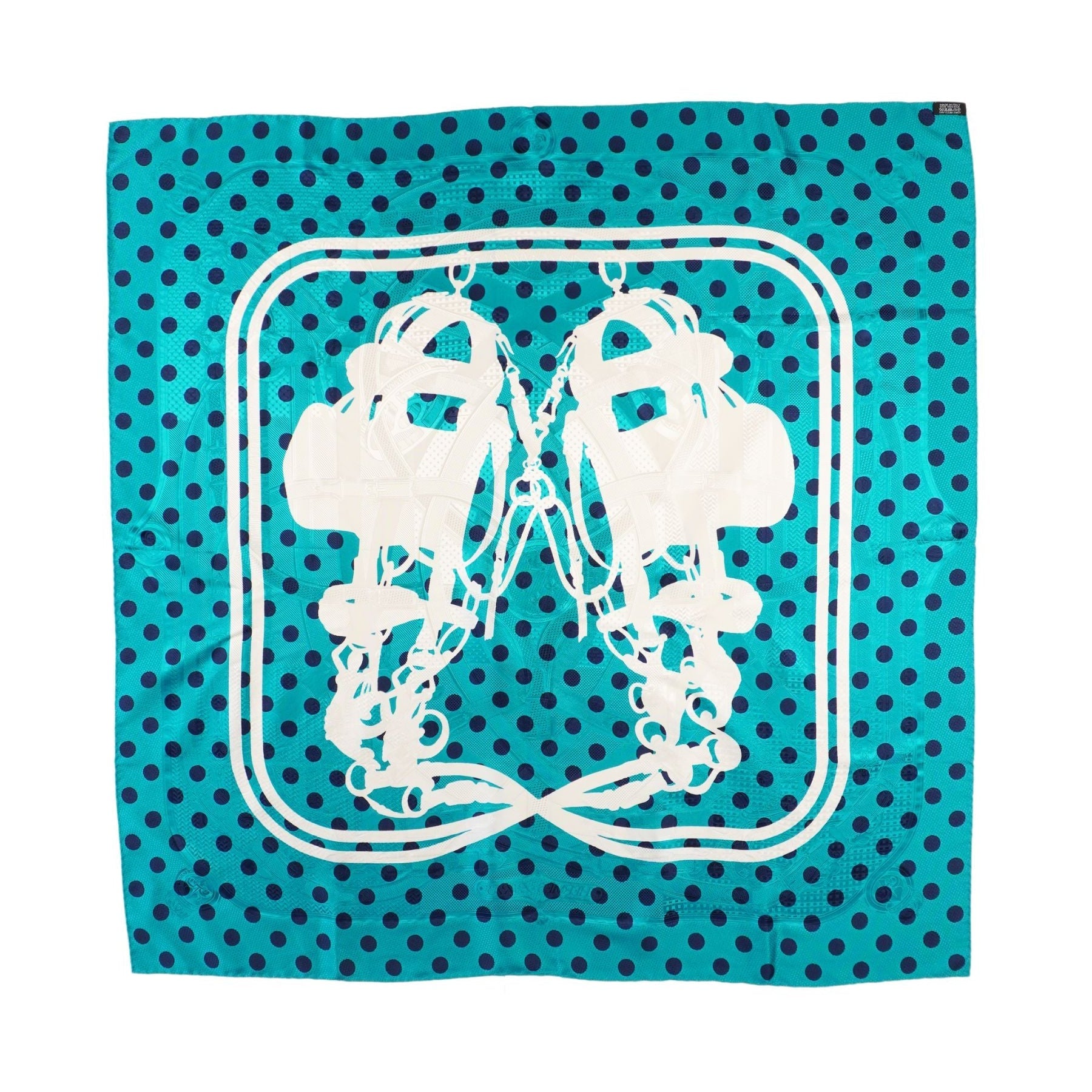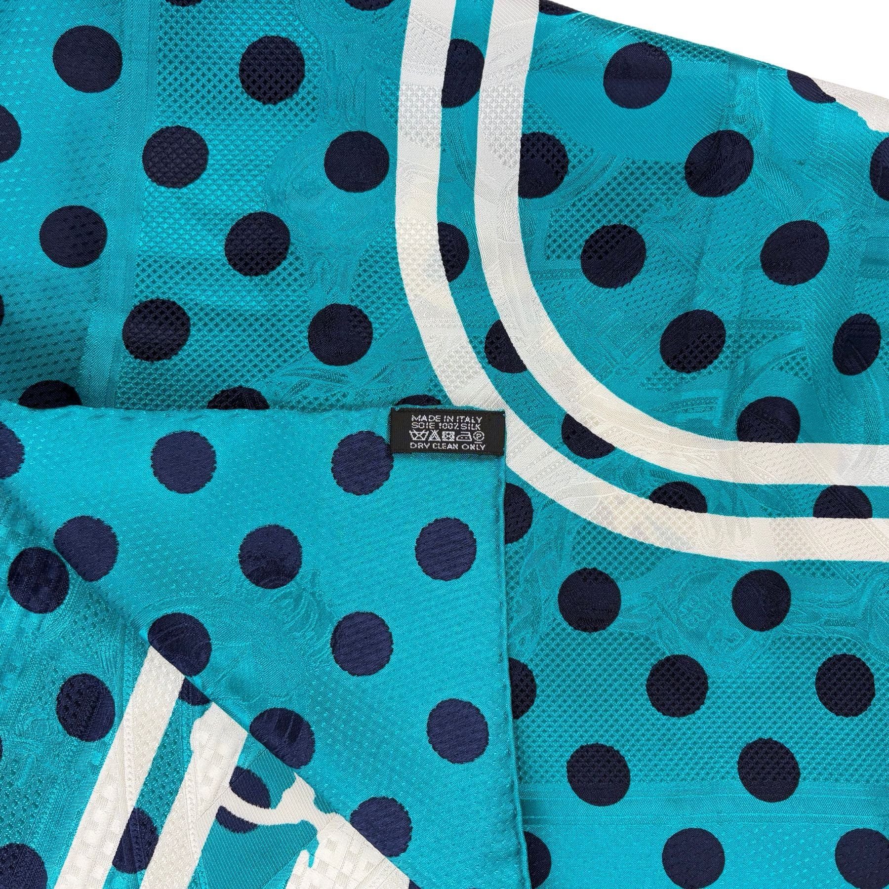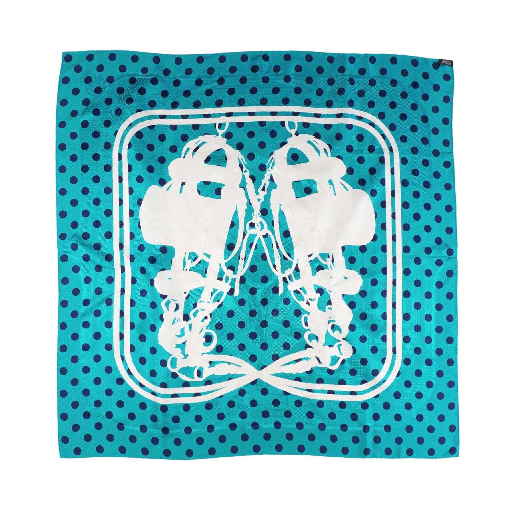 Hermes 'Brides de Gala Cavalcadour à Pois' scarf in turquoise and navy polka dot silk white white 'Brides de Gala' silhouette design. The silk features the 'Cavalcadour' design in a jacquard weave. Designed by Hugo Grygkar and originally released in 2016.