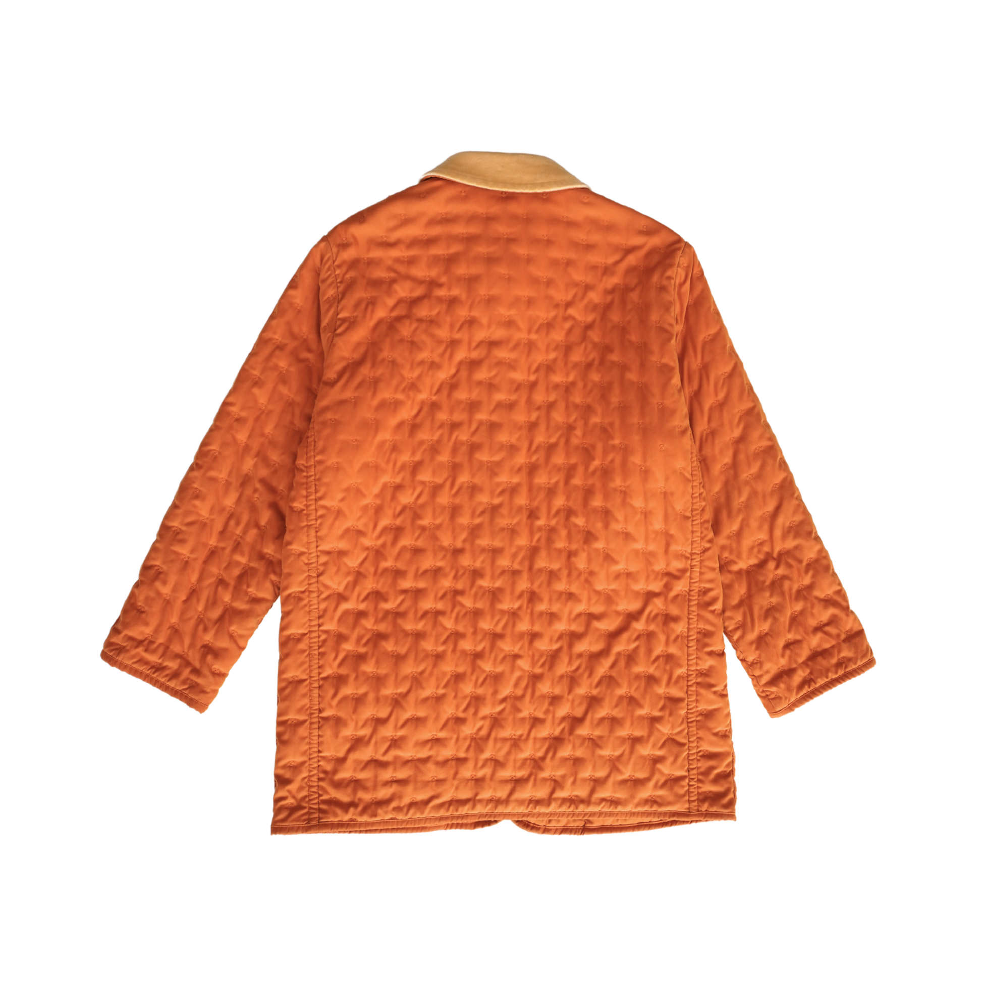 Hermes 'Caban' vintage jacket in an orange tufted poly-blend with gold snap buttons, large front pockets, and a yellow velour collar.