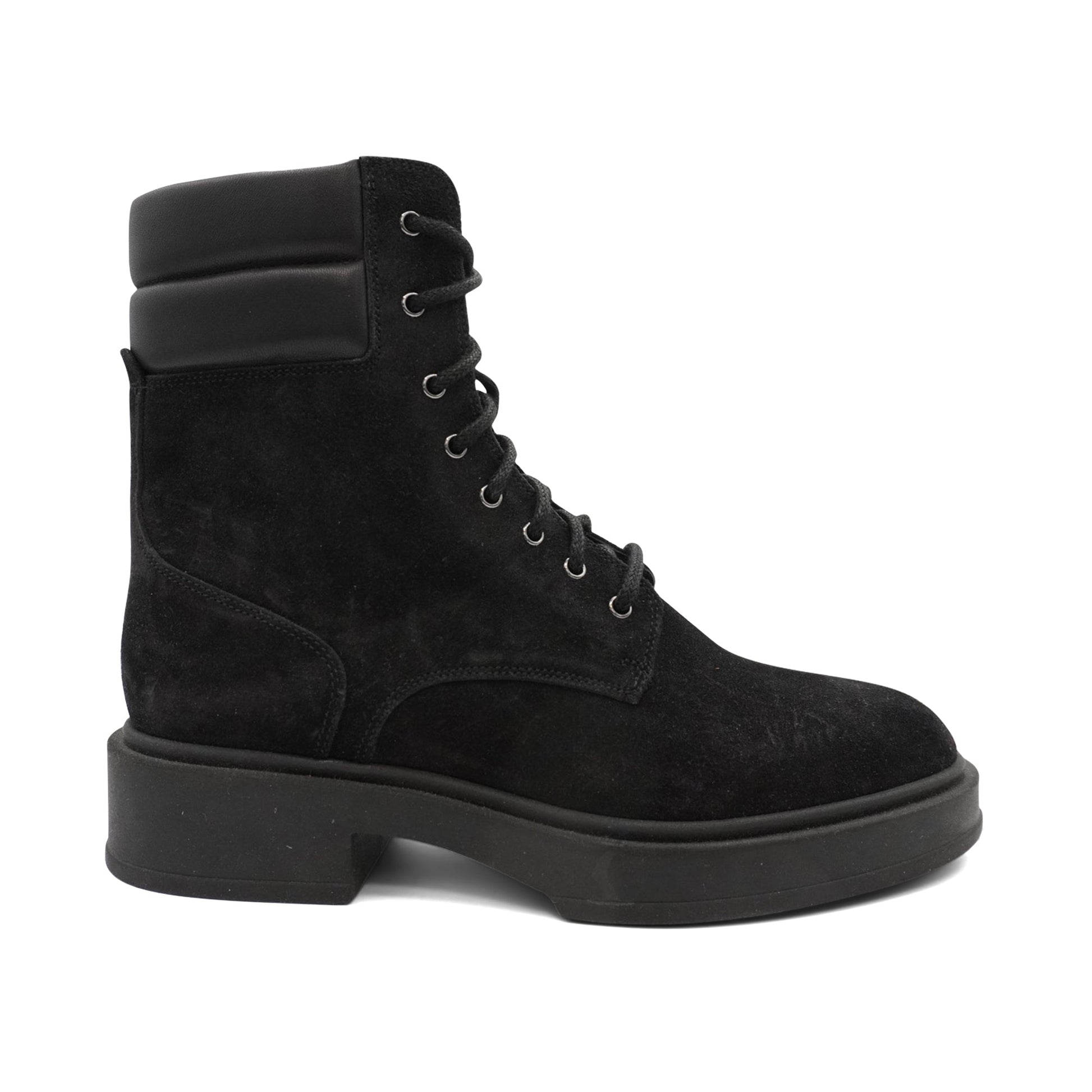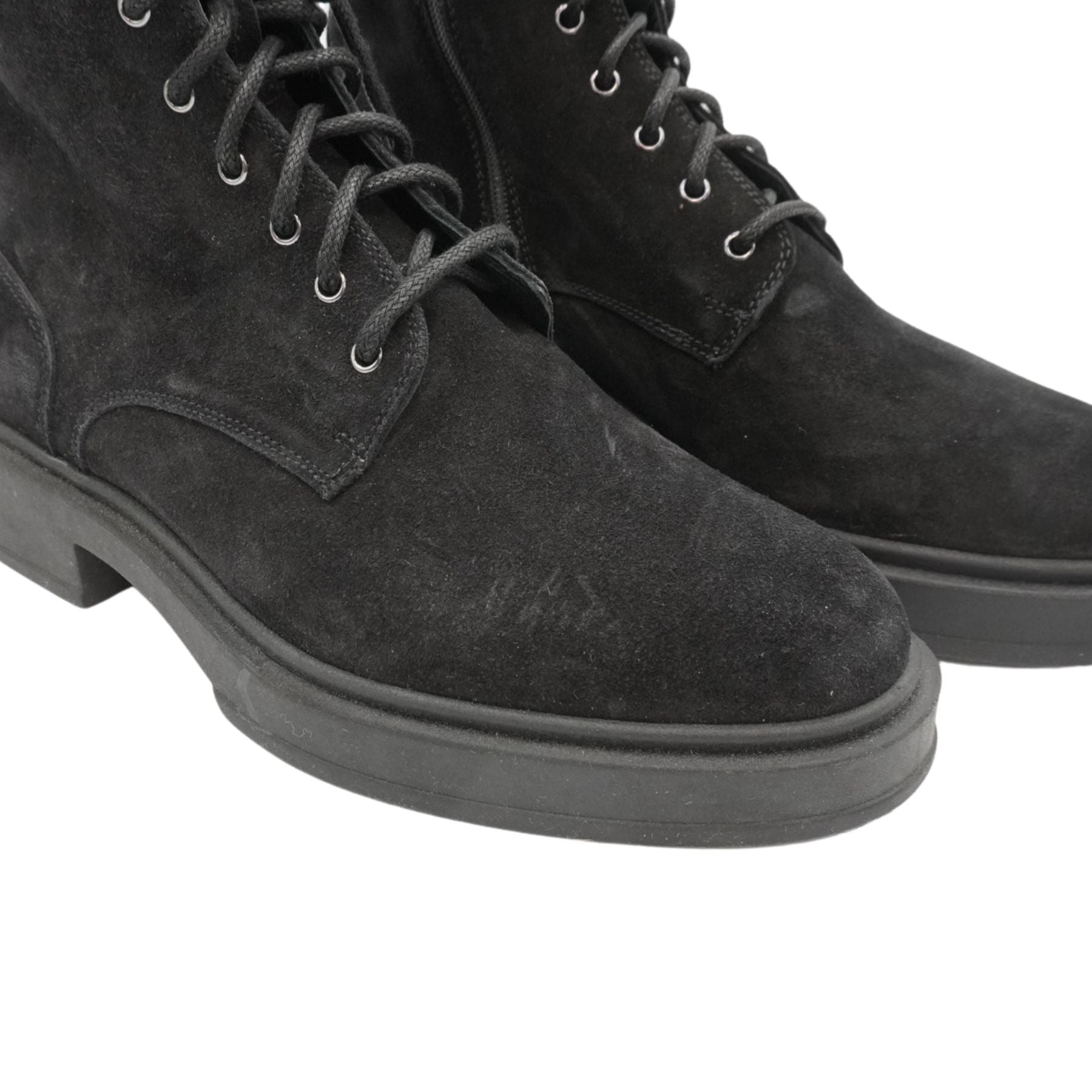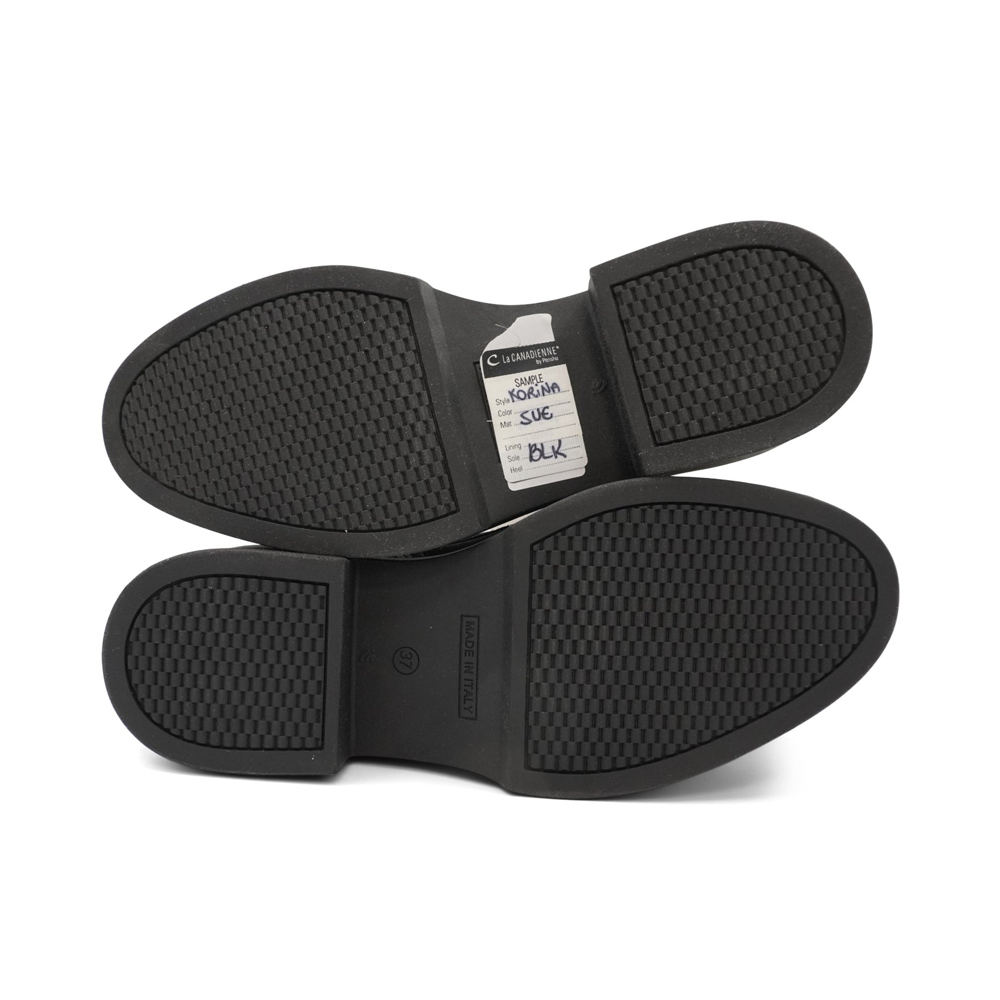La Canadienne 'Korina' boots in black suede with a ribbed leather ankle, a side-zip opening in gunmetal hardware, and a rubber sole.