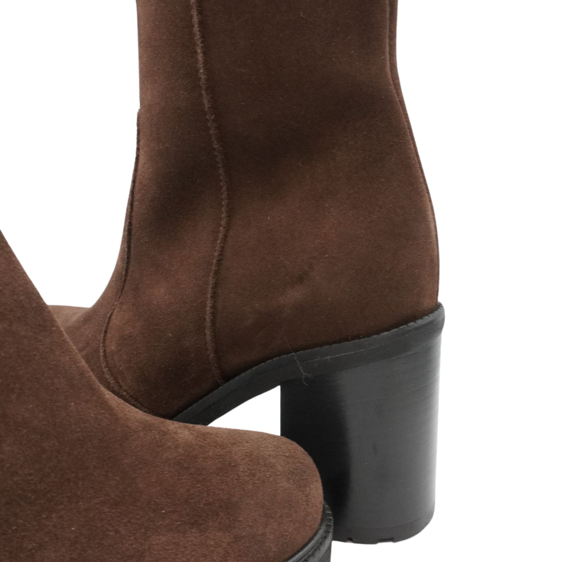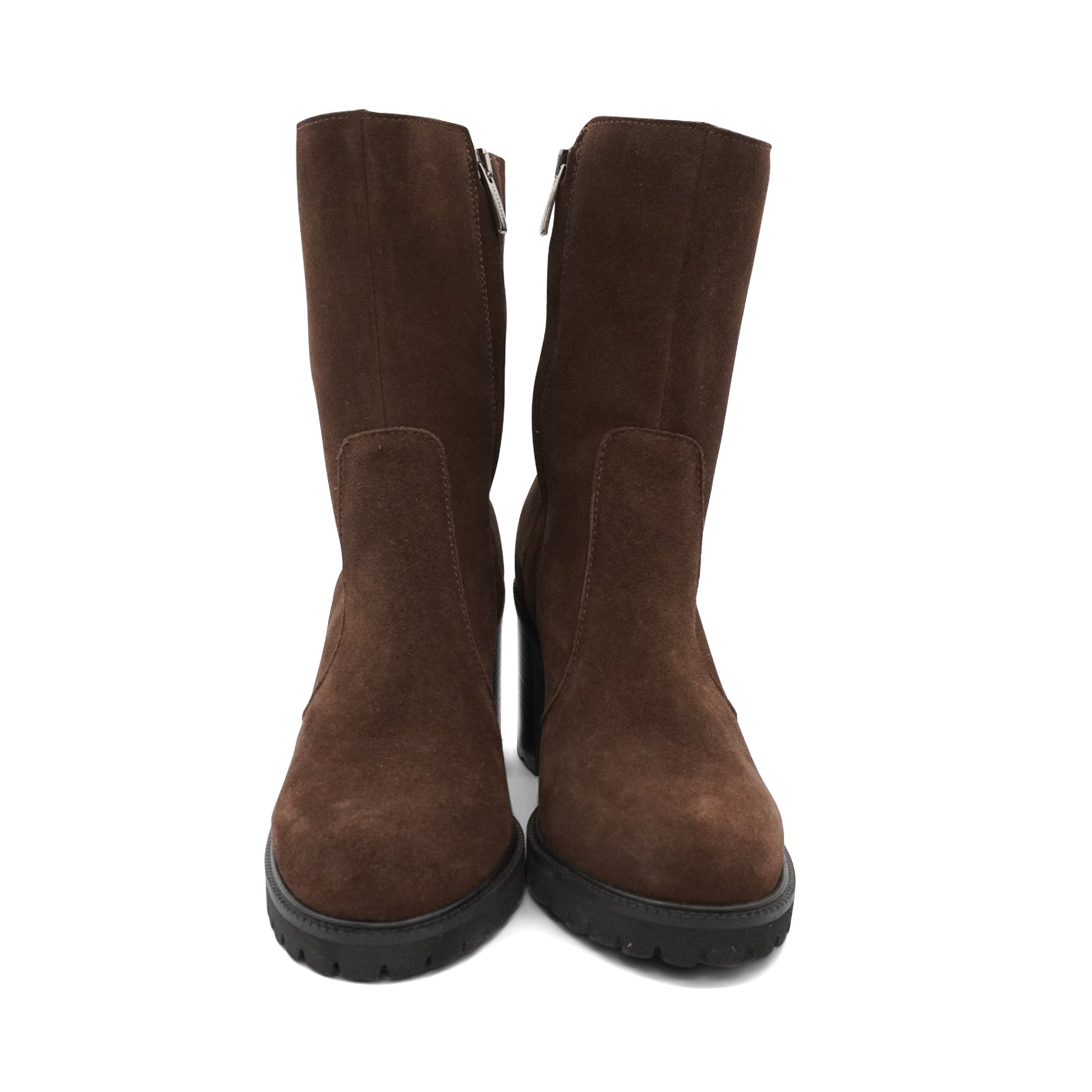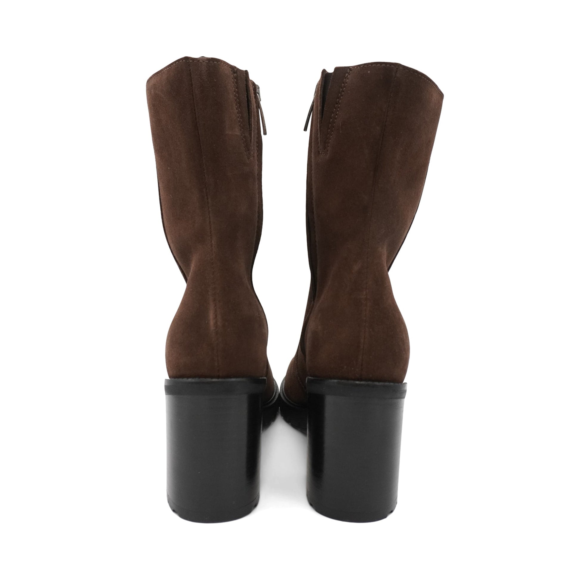 La Canadienne 'Peppa' boots in brown suede with an inner zip opening in gunmetal hardware, a black stacked heel, and an almond toe.