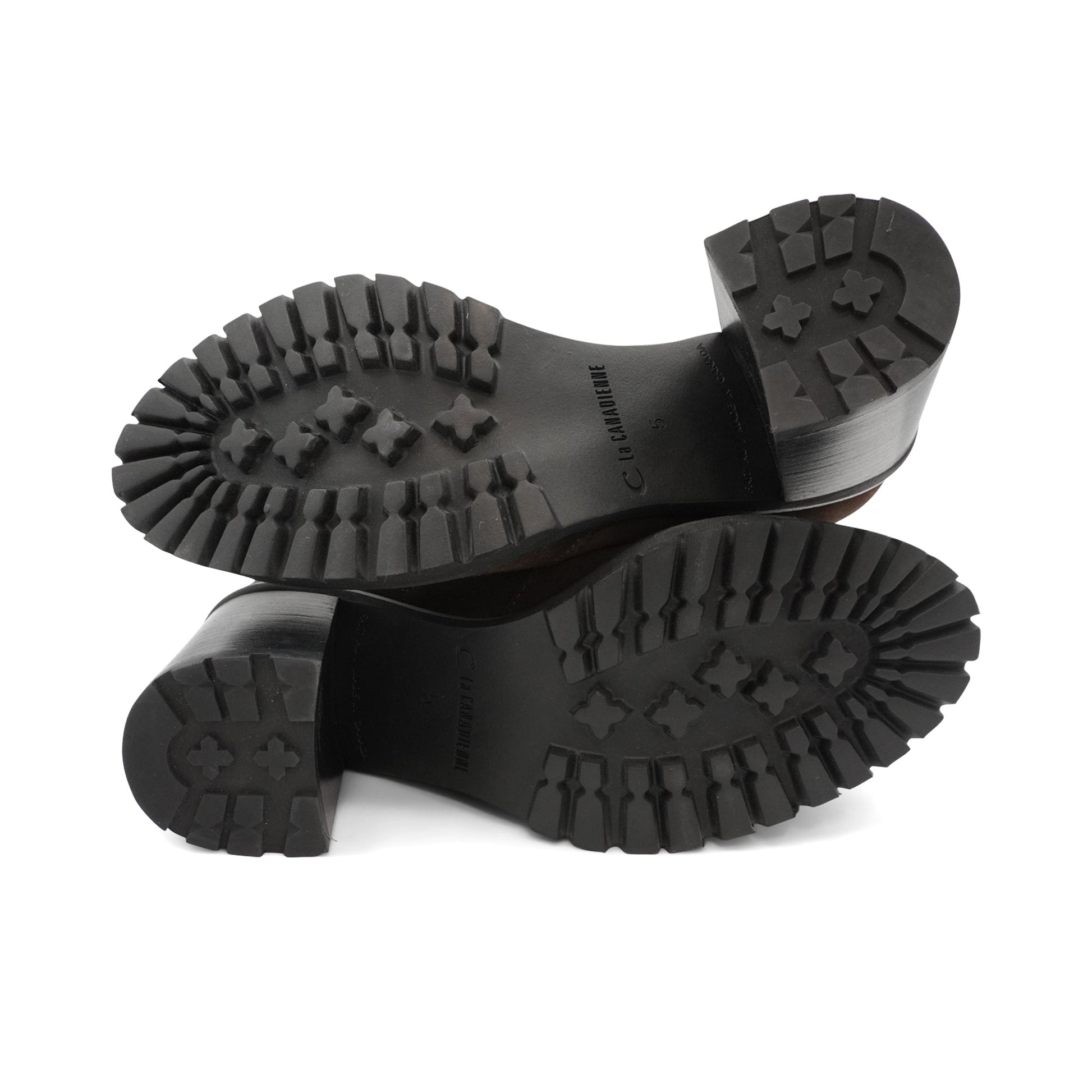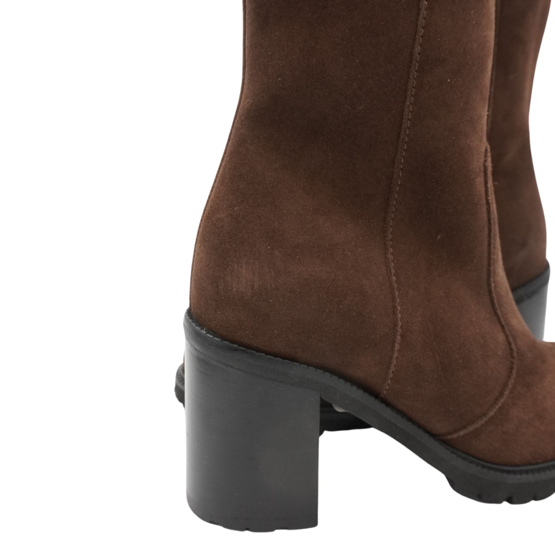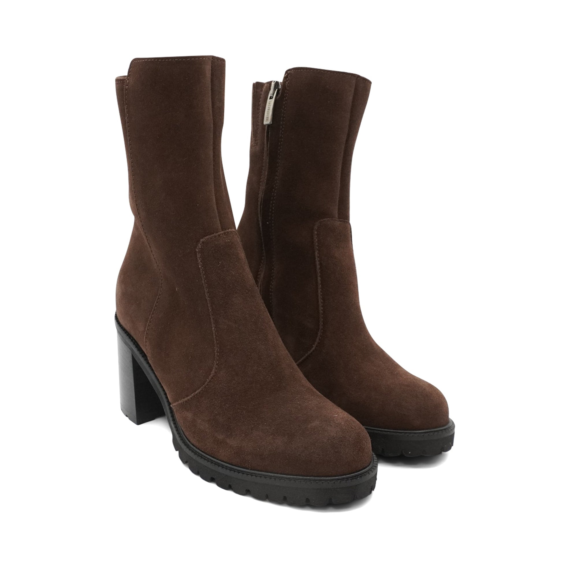 La Canadienne 'Peppa' boots in brown suede with an inner zip opening in gunmetal hardware, a black stacked heel, and an almond toe.