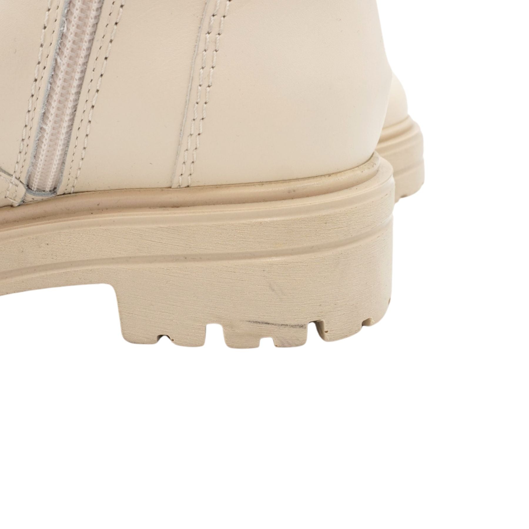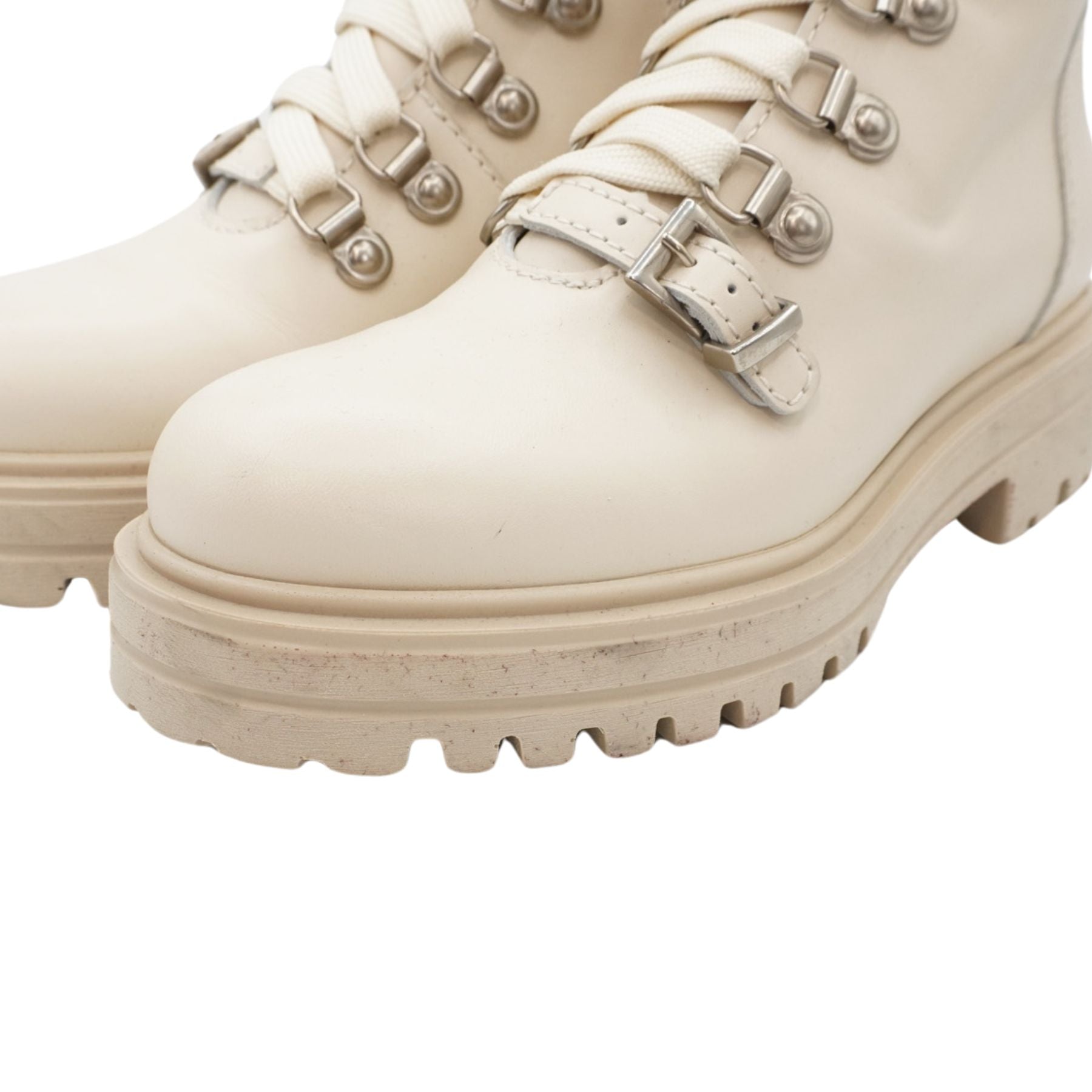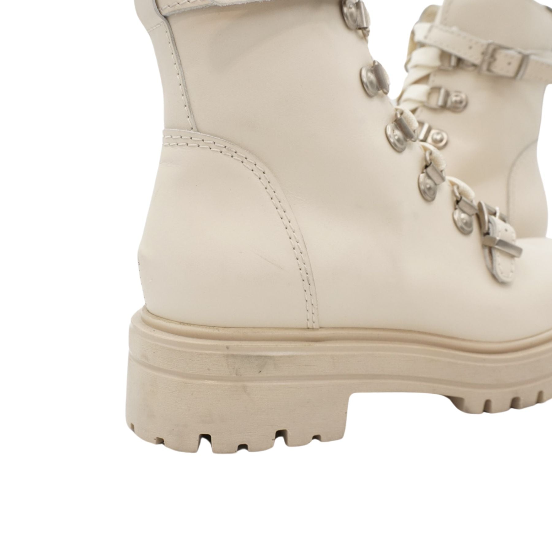 La Canadienne 'Sabel' combat boots in cream leather with a side-zip opening in white hardware, silver buckle details, and a rubber sole.