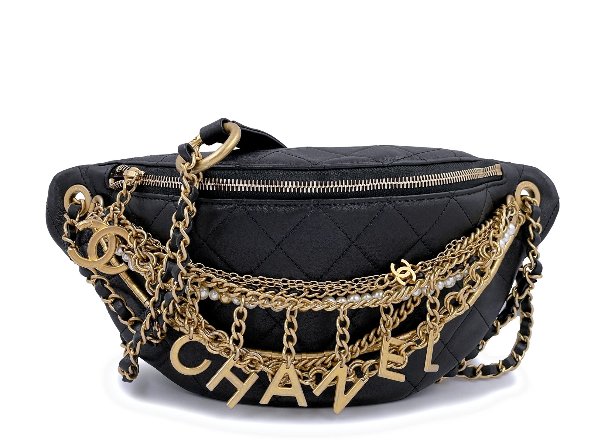 Based off the classic "banana" fanny pack model, this takes it to the next level with brushed gold hardware, a larger silhouette and several and chain charms. Each of the chains are different - one is with faux pearls, another with dangling letter charms that spell "CHANEL," another with the dangling CC logo, a snake chain type chain and others.