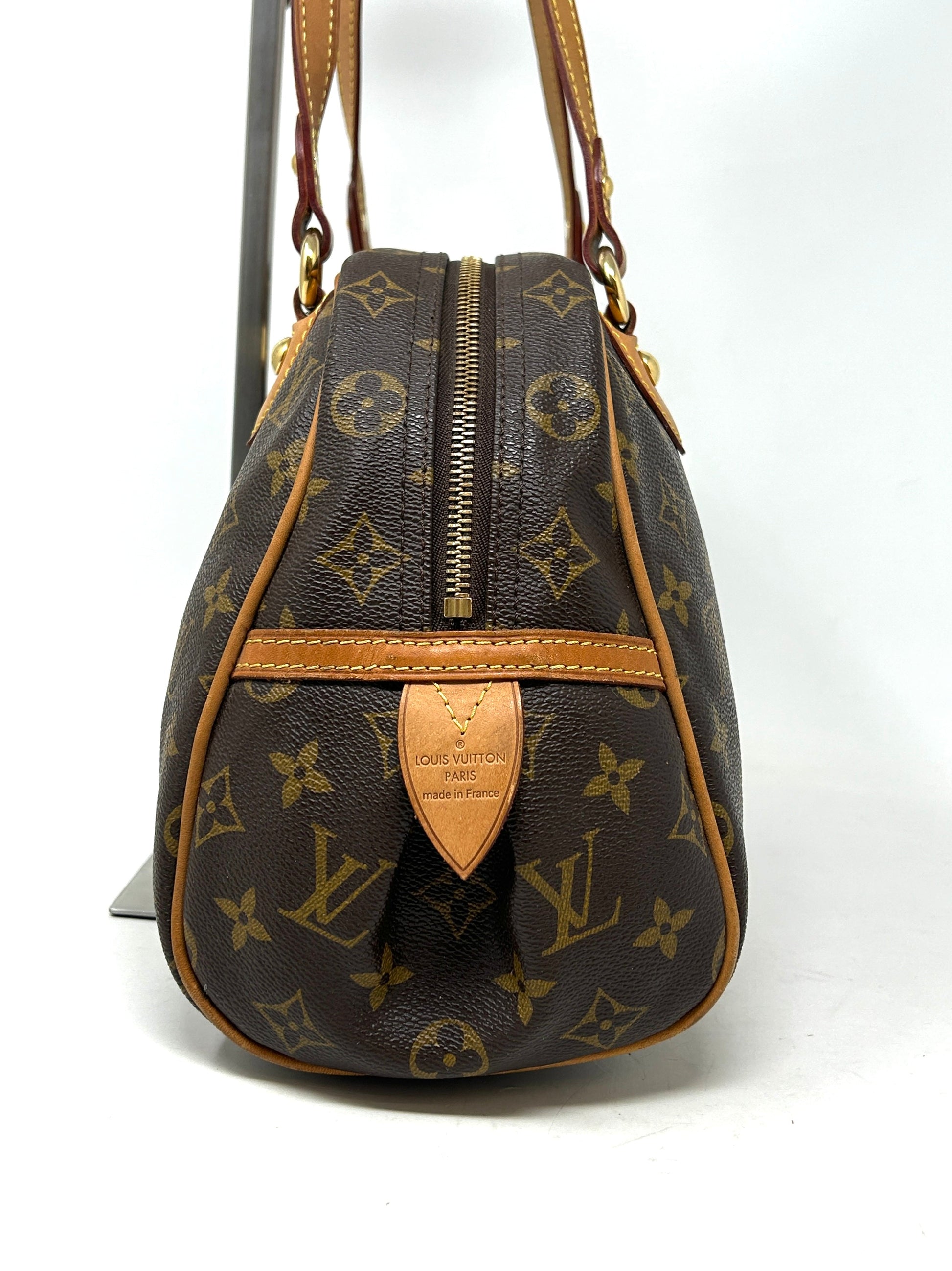 - Brown coated canvas handbag crafted in the iconic LV monogram pattern, featuring cowhide leather trim, gold tone vintage style logo plaque on the front and two leather top handles