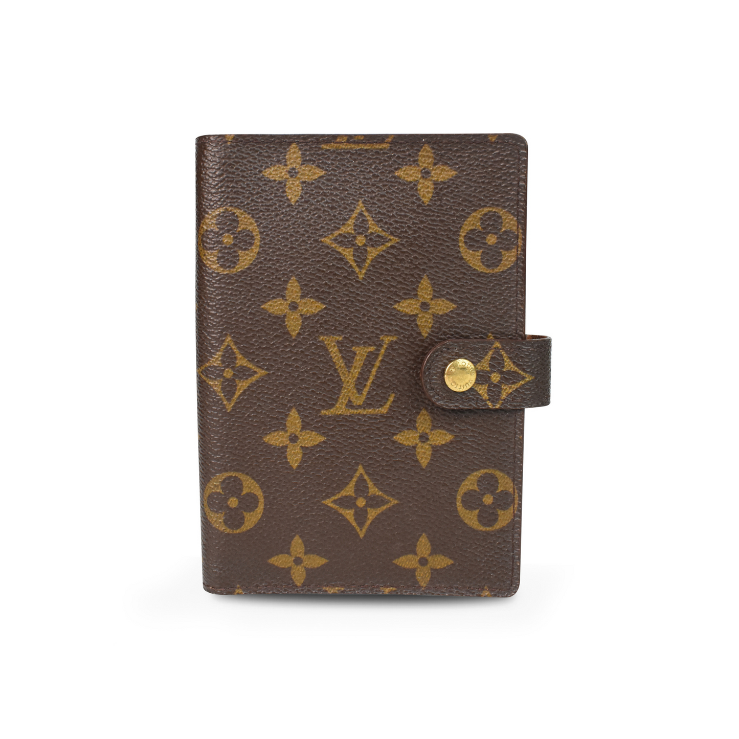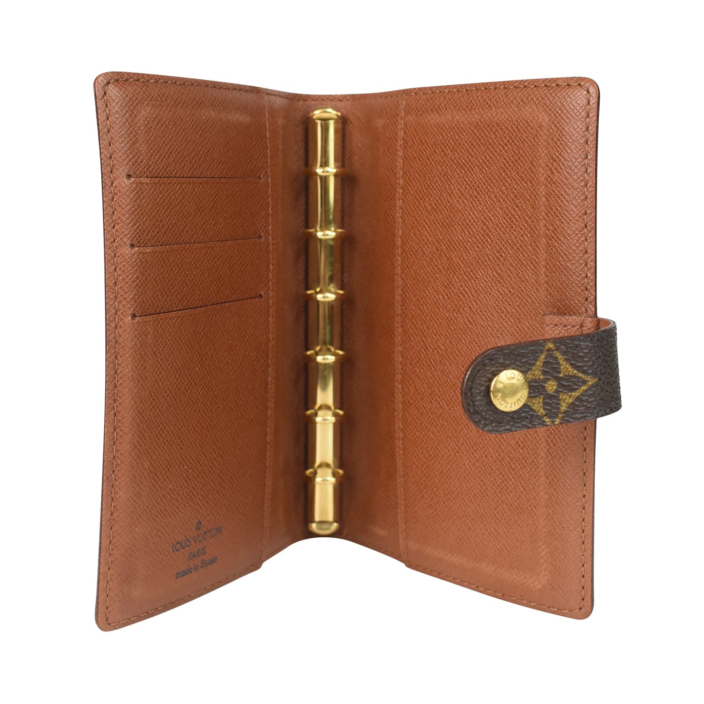 Louis Vuitton 'Agenda' wallet in brown monogram coated canvas with a snap button closure in gold hardware, inner card and cash slots, and book rings for adding pages.