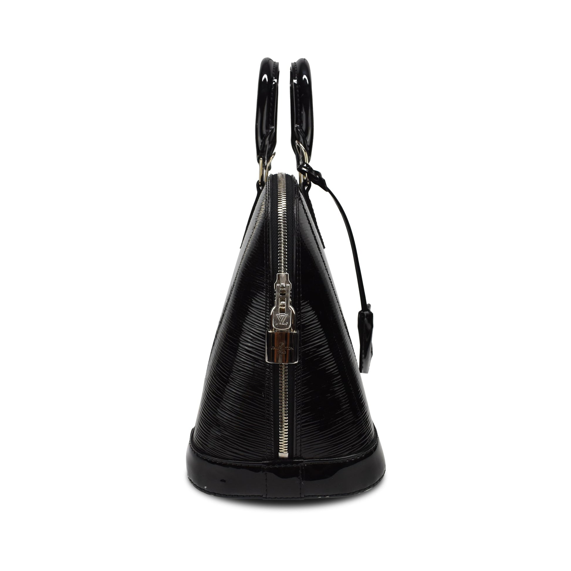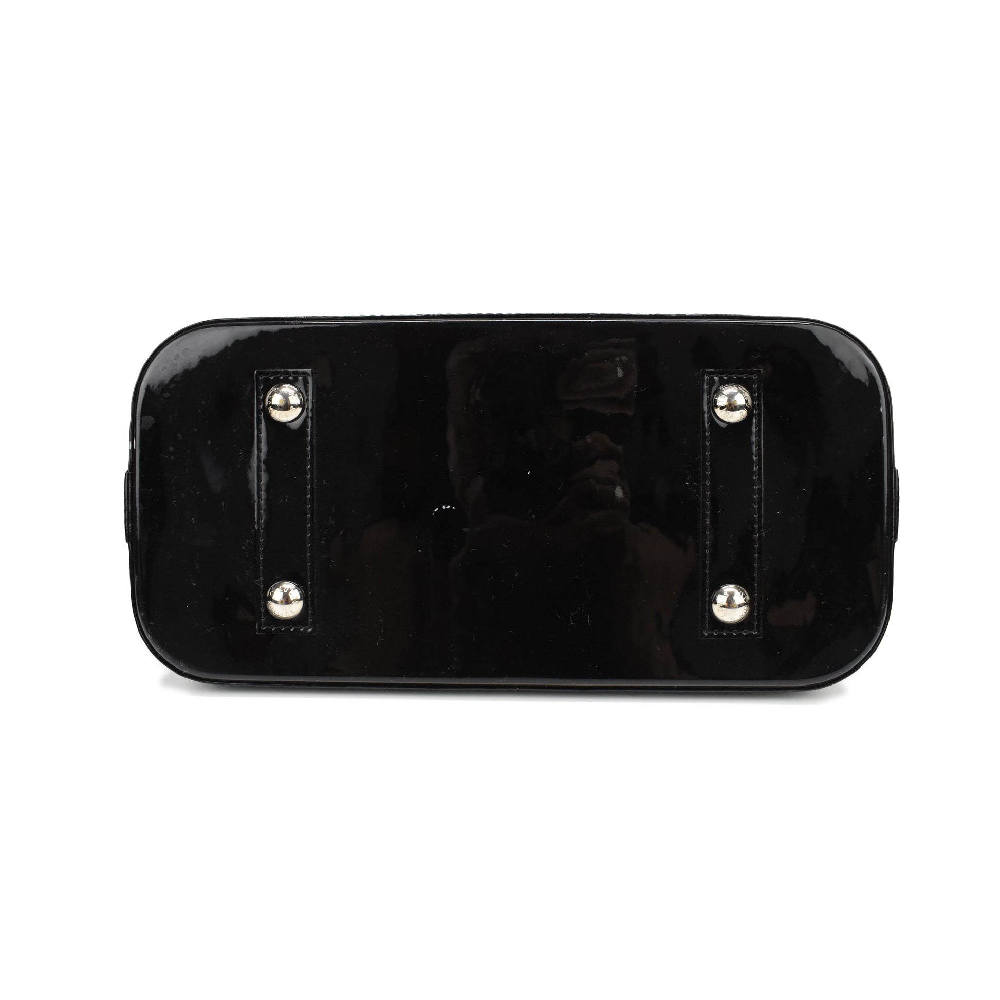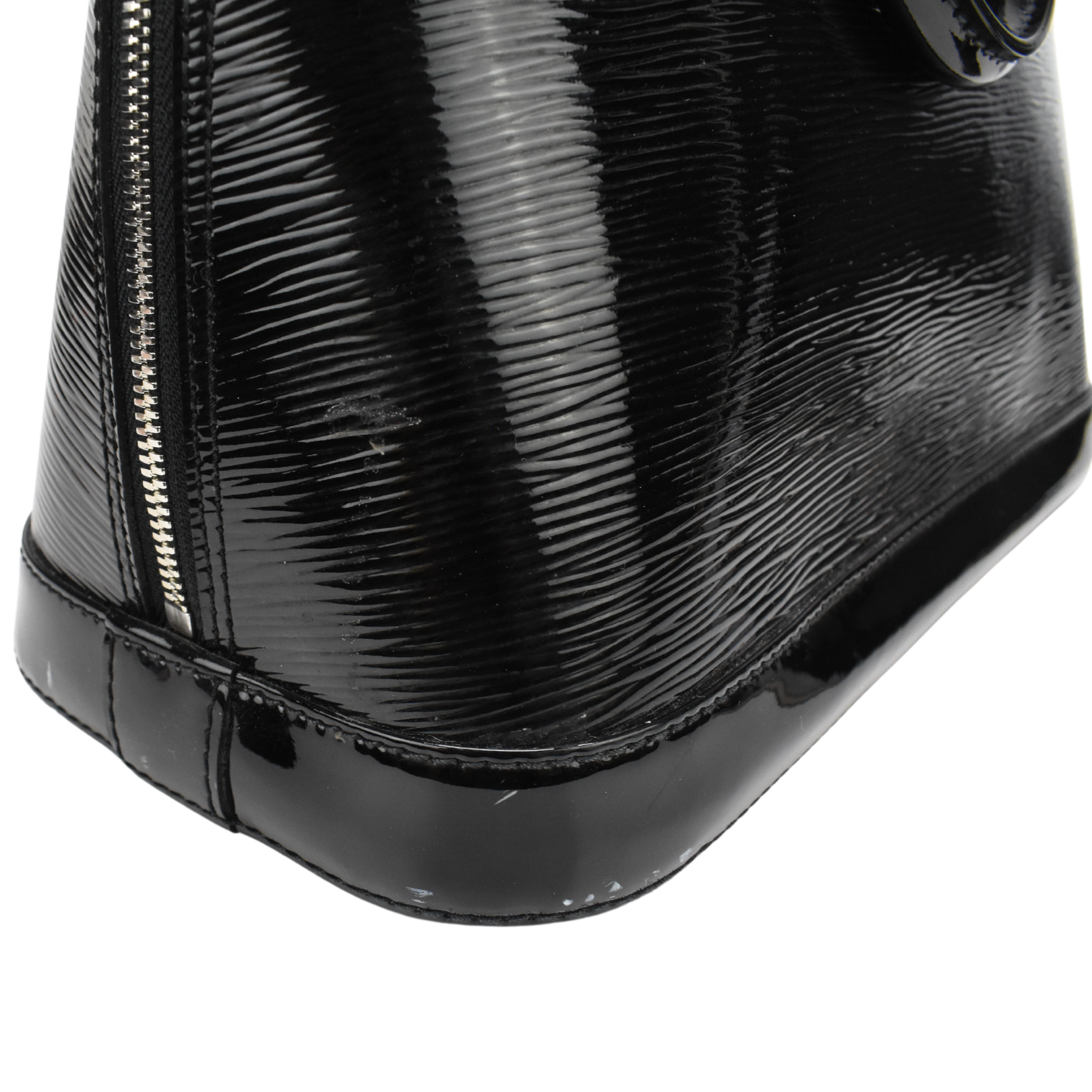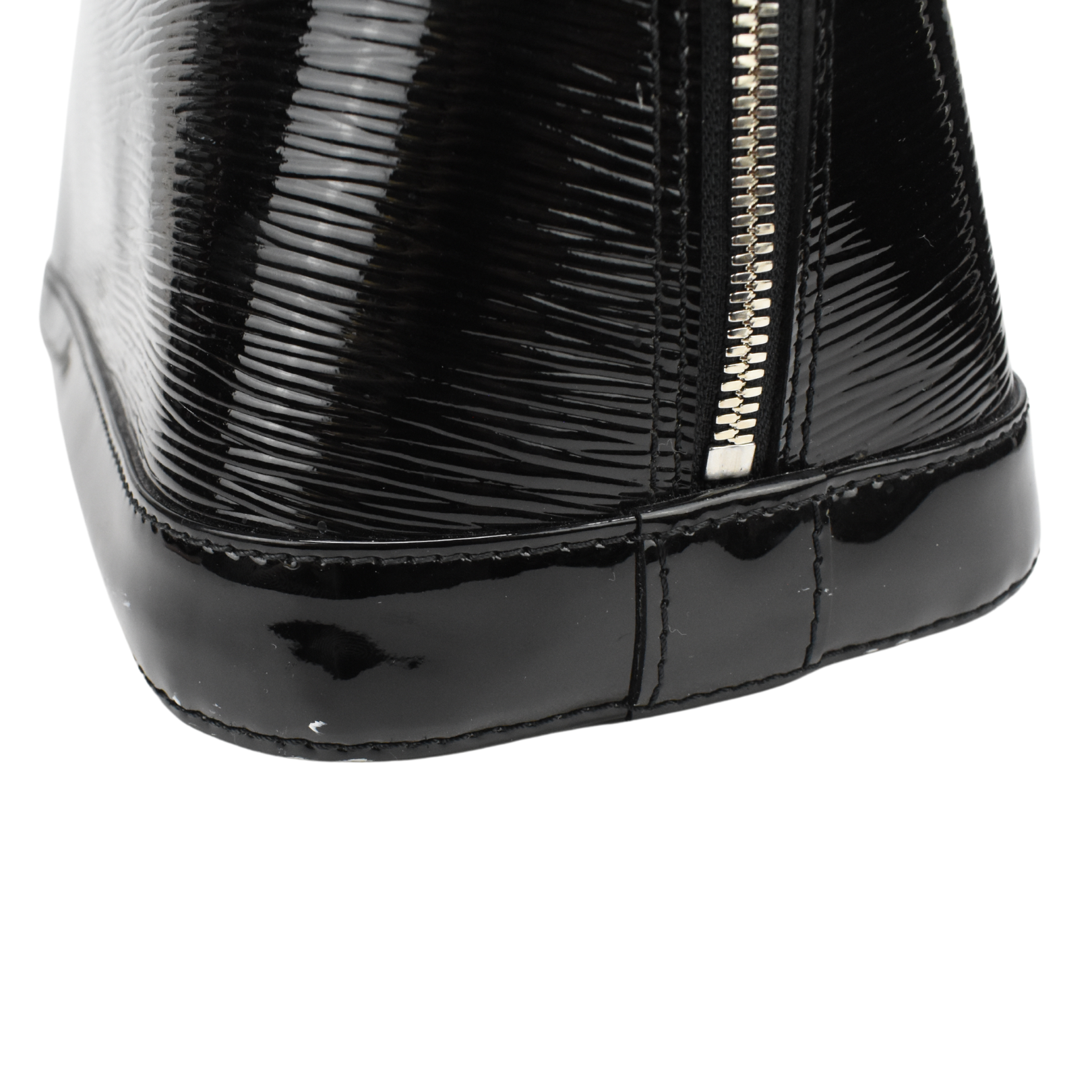 Louis Vuitton 'Alma MM' top handle bag in black vernis patent epi leather with silver hardware. Features two rolled top handles, a double zip closure, metal hardware feet on the base, and keys. The interior is black suede lined with two slip pockets.