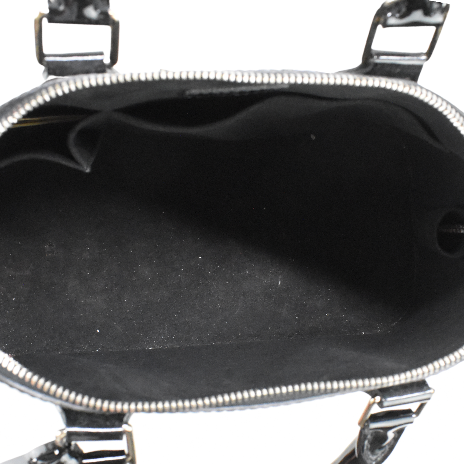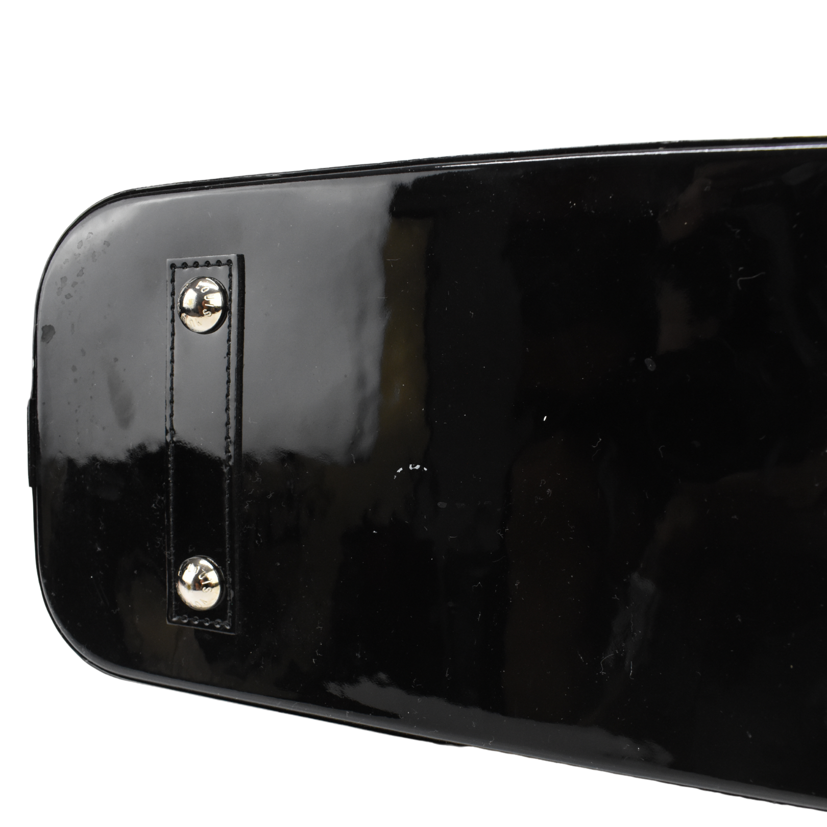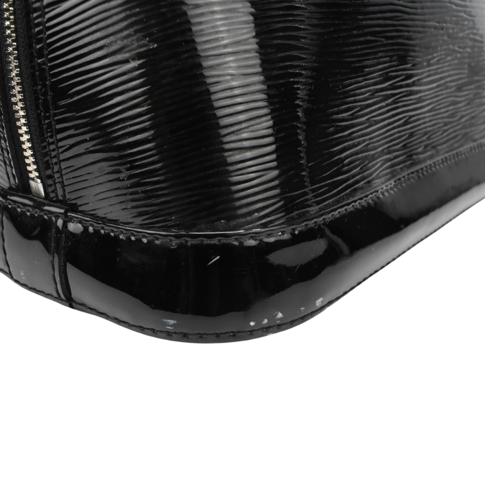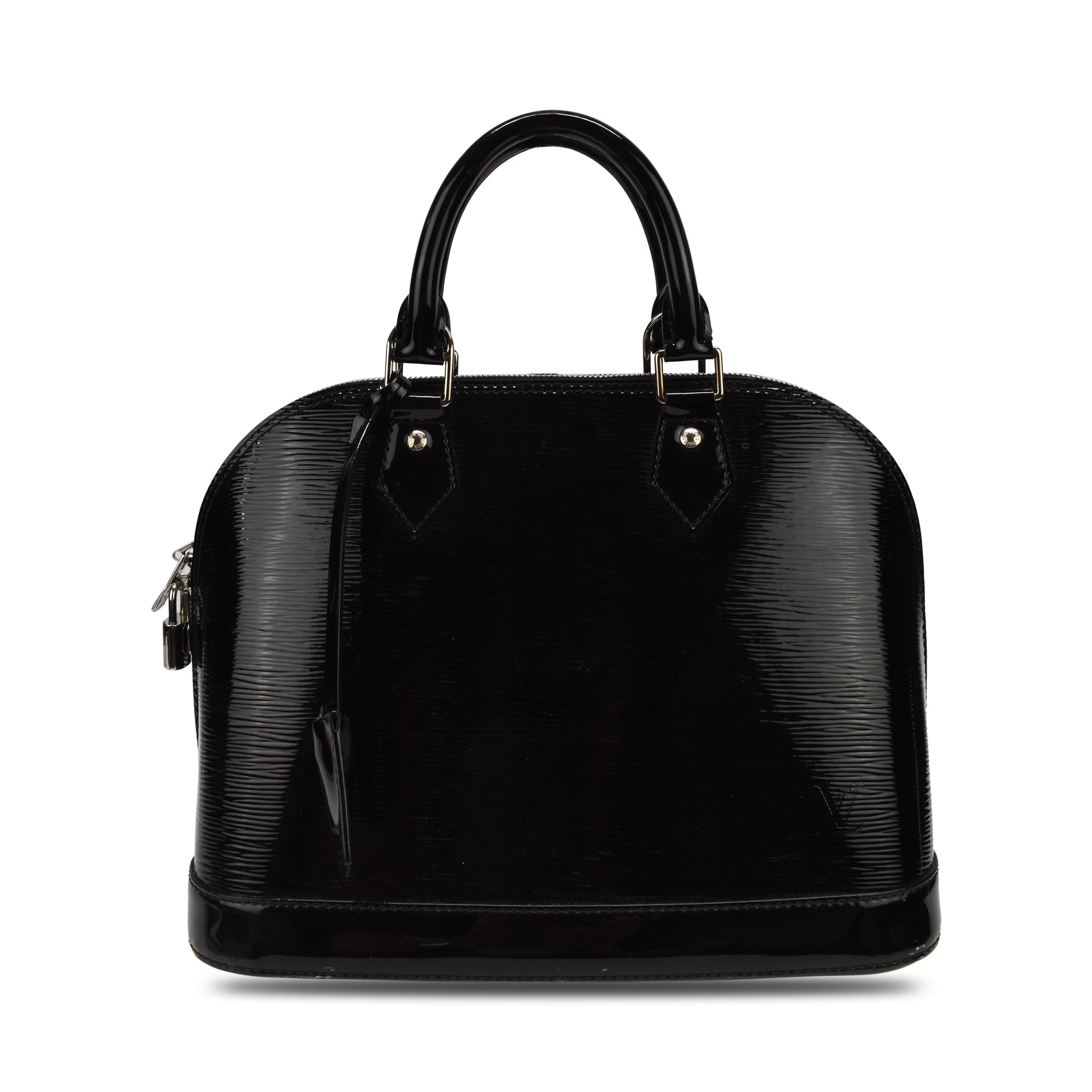 Louis Vuitton 'Alma MM' top handle bag in black vernis patent epi leather with silver hardware. Features two rolled top handles, a double zip closure, metal hardware feet on the base, and keys. The interior is black suede lined with two slip pockets.