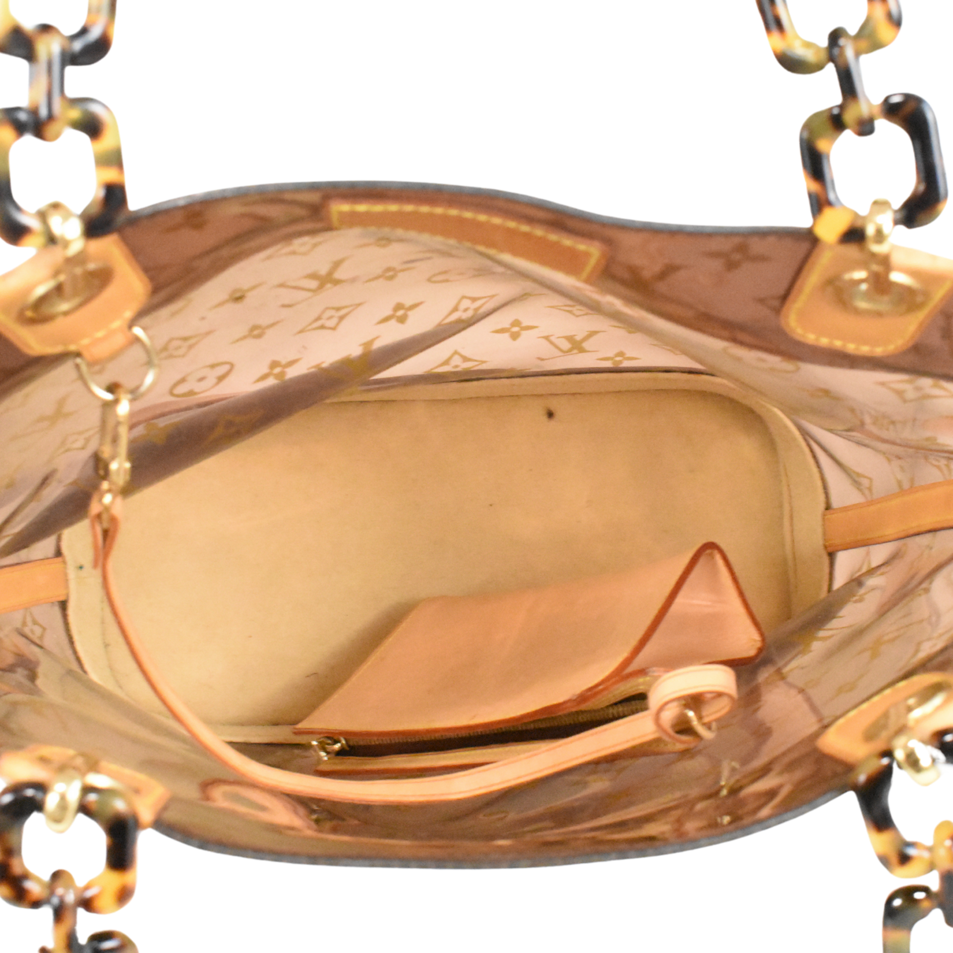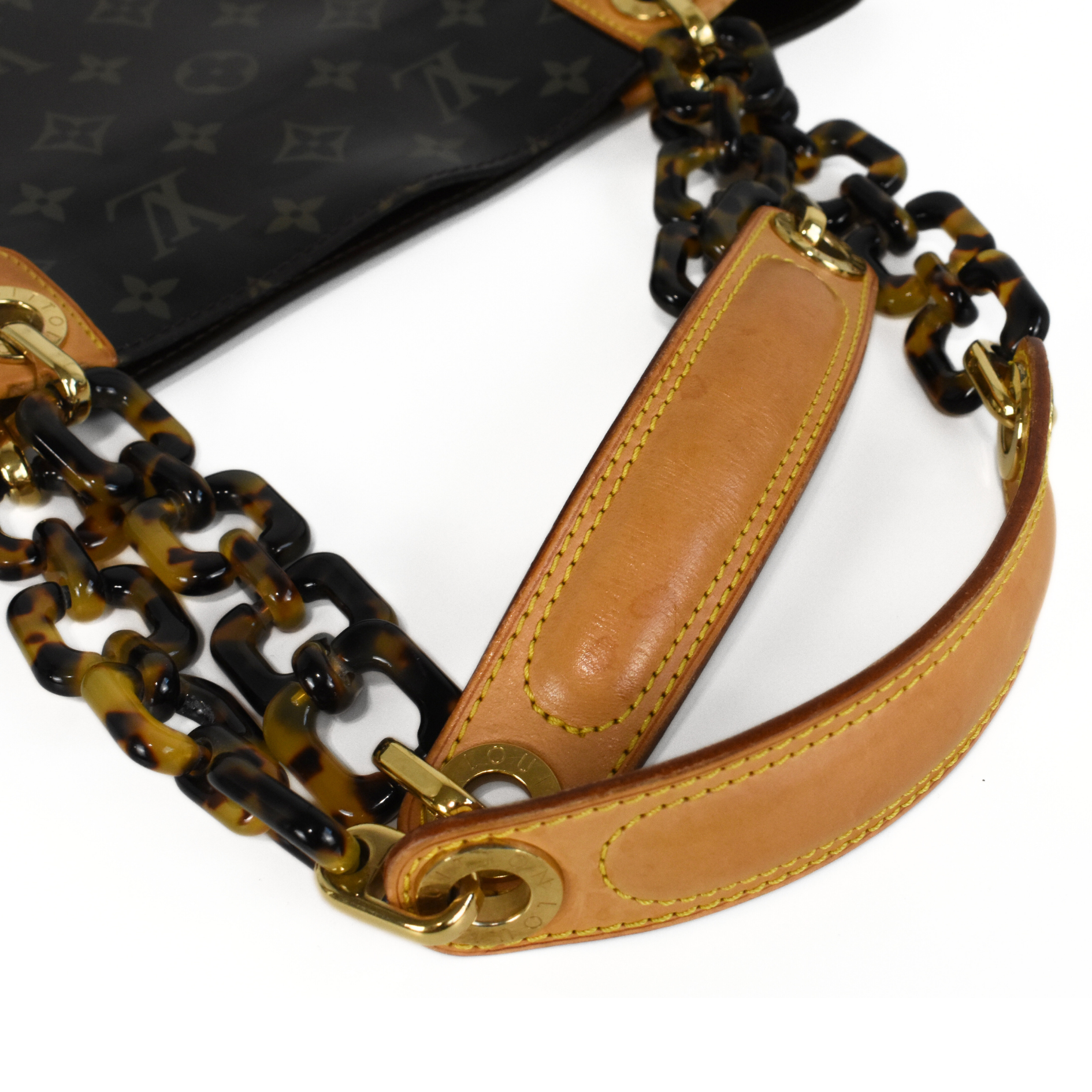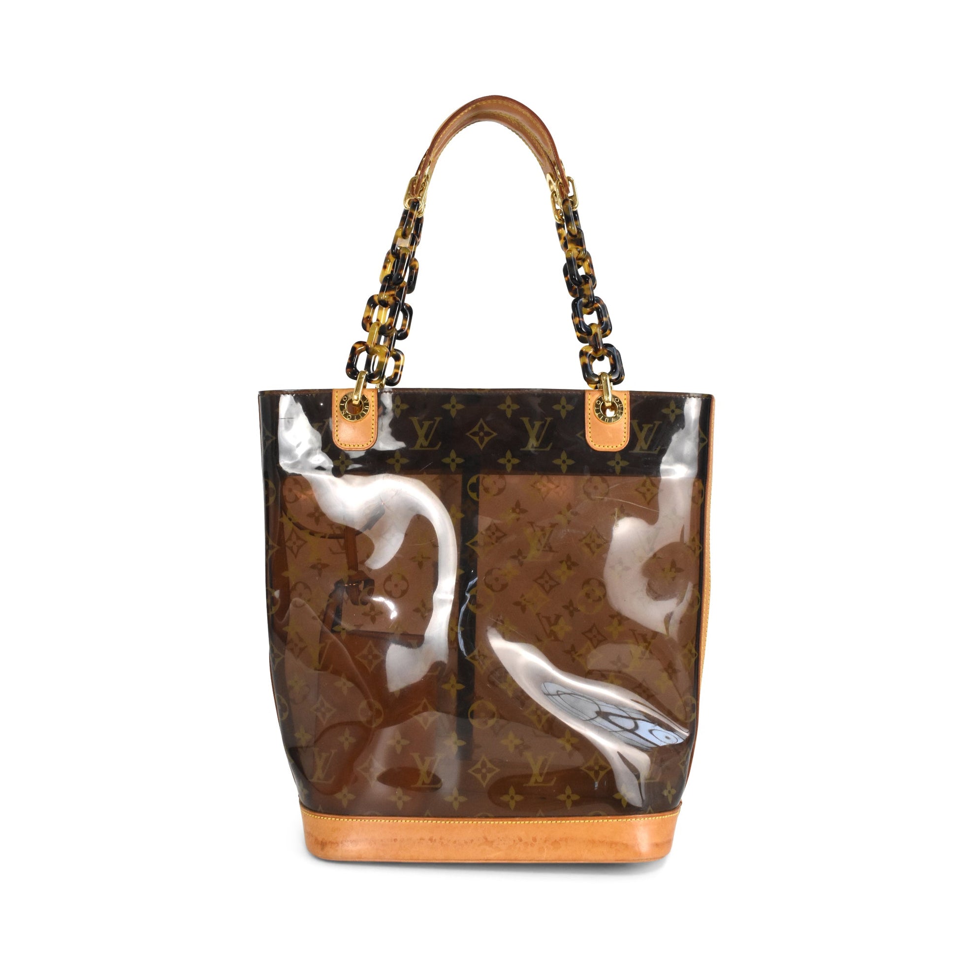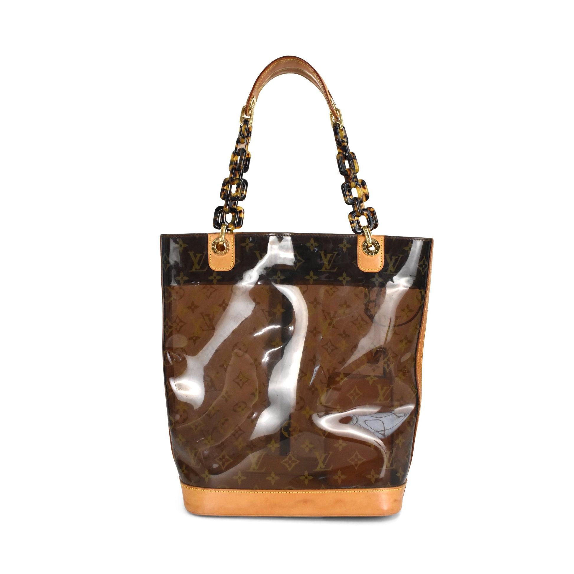 Louis Vuitton 'Ambre MM' bucket bag in monogram printed brown tinted PVC with vachetta leather accents and tortoiseshell chain link straps. Features a vachetta leather zip pouch that attaches to an interior strap.
