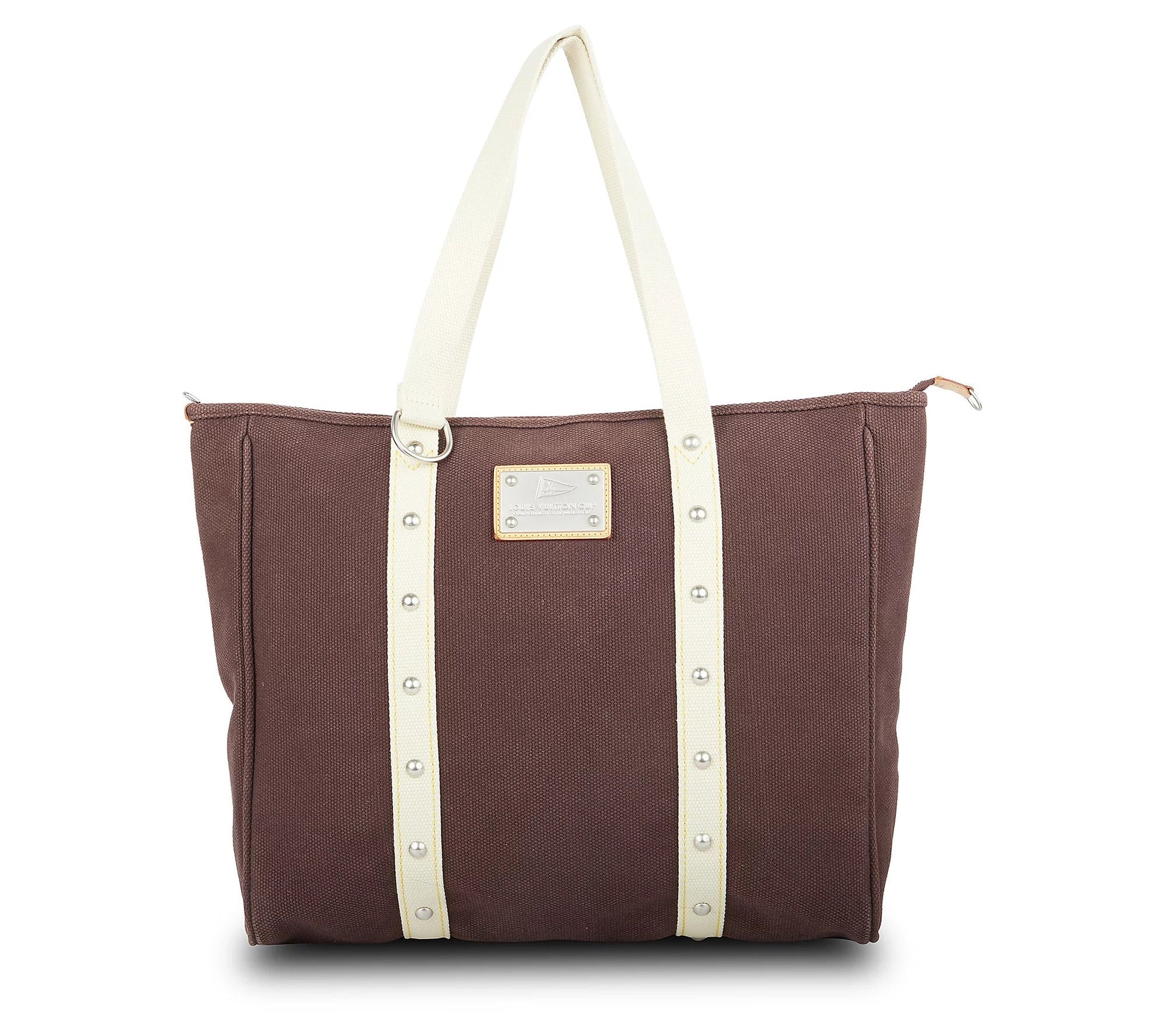 Crafted from durable brown canvas, this tote features contrasting white canvas straps adorned with brass studs that add an element of sophistication and durability.