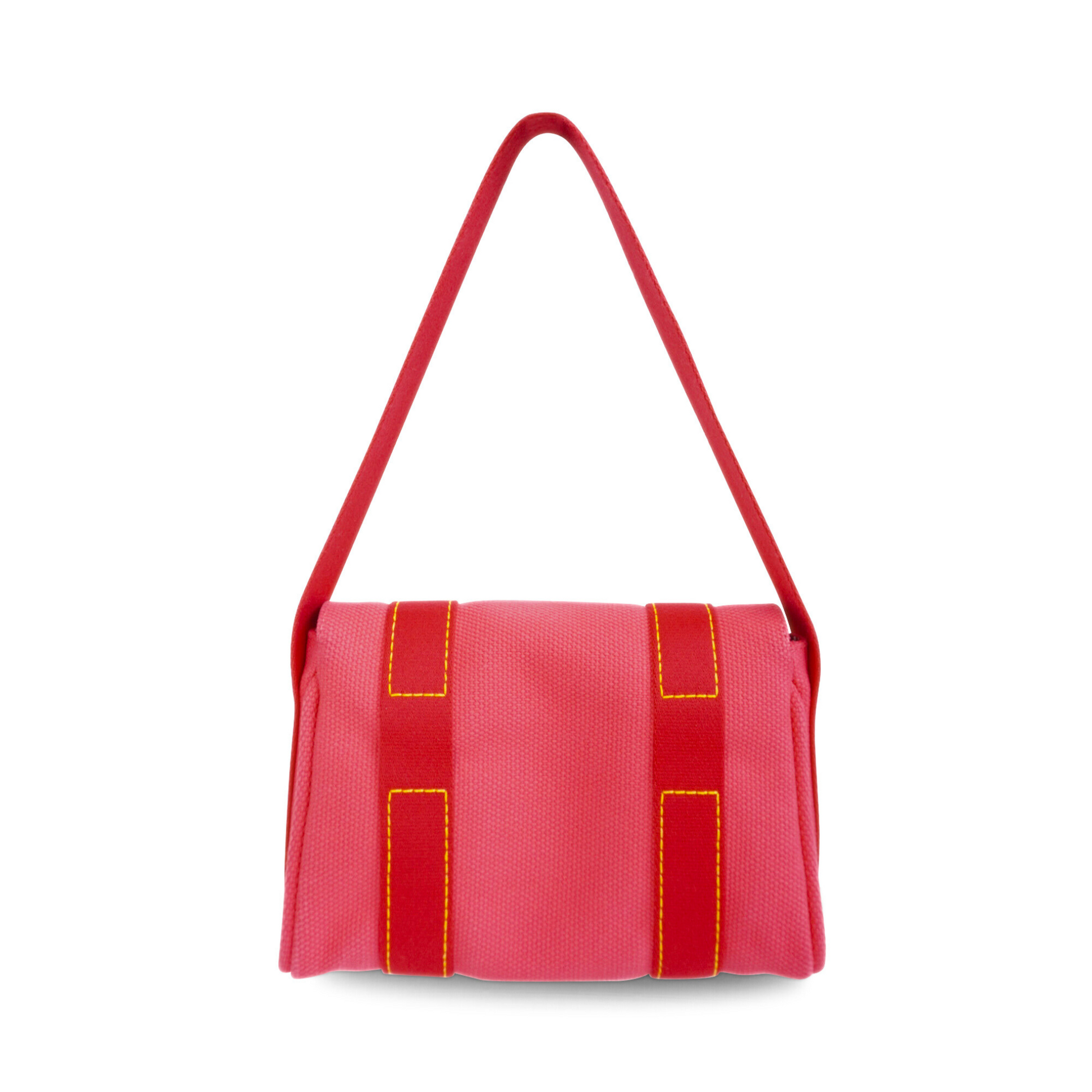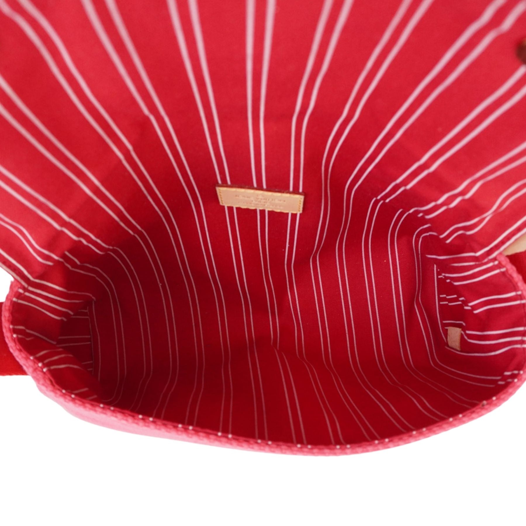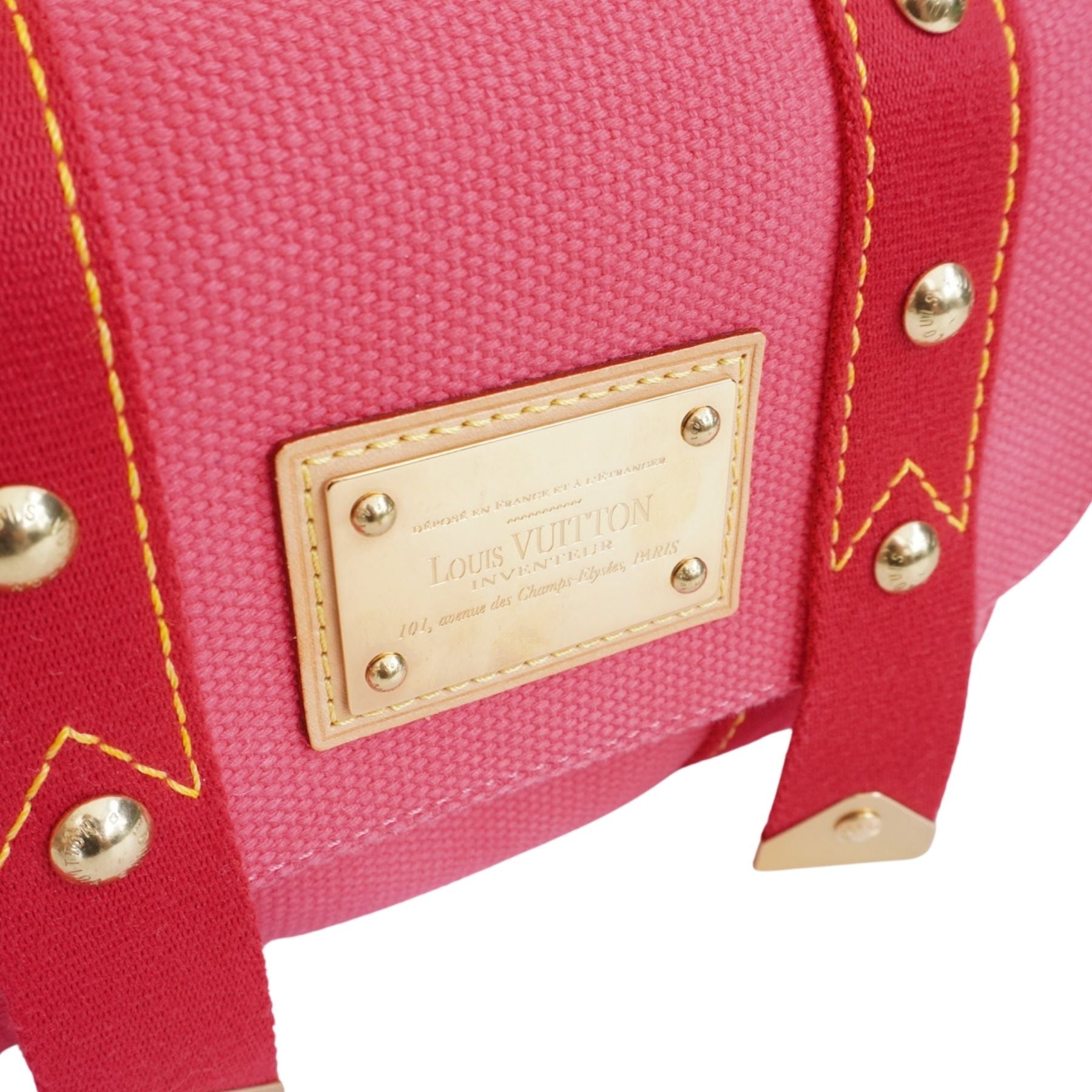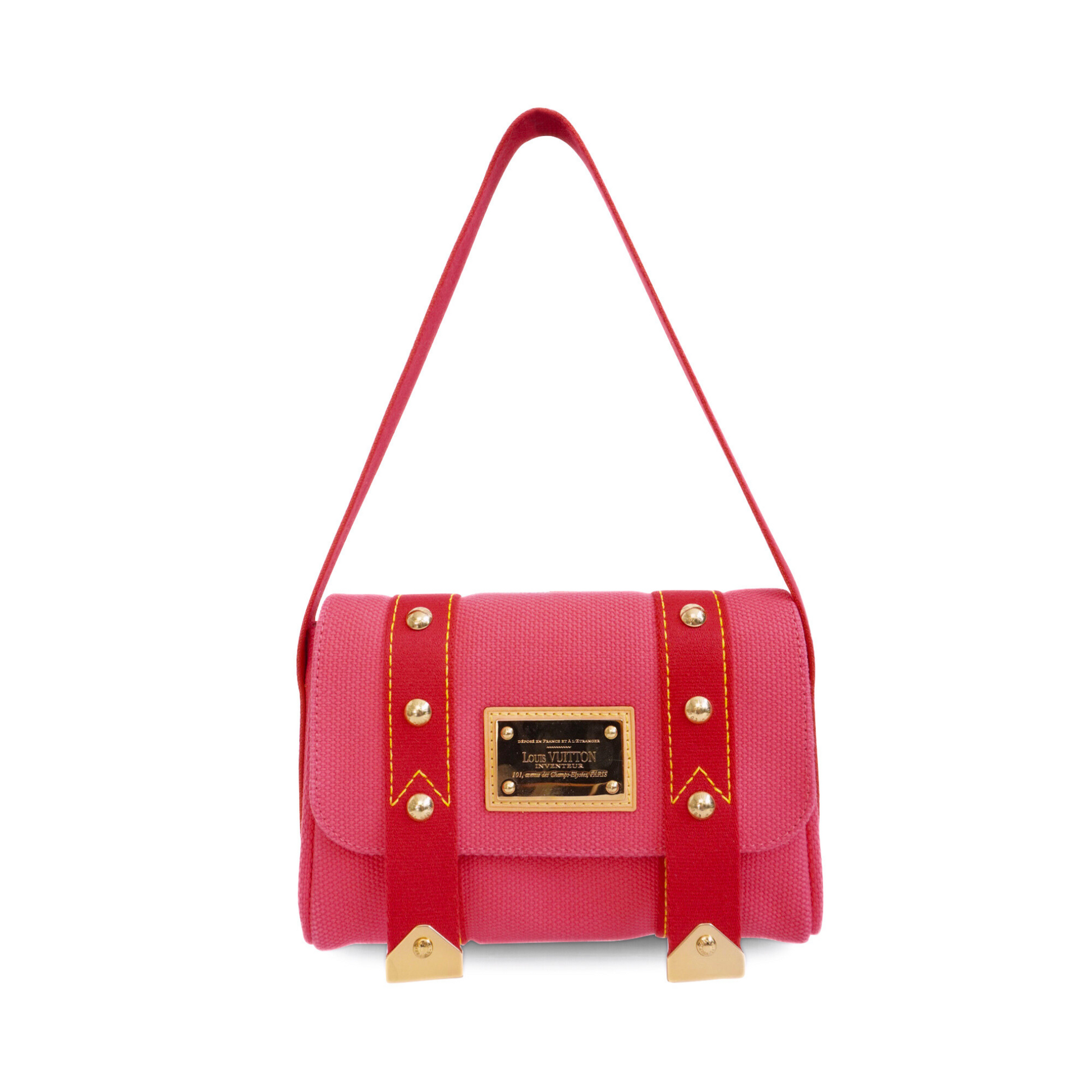 Louis Vuitton 'Antigua Sac Rabat' mini messenger style shoulder bag in bright pink canvas with magenta canvas straps and a large gold logo plaque. Features magnetic button closures and a pink and white striped fabric lining.