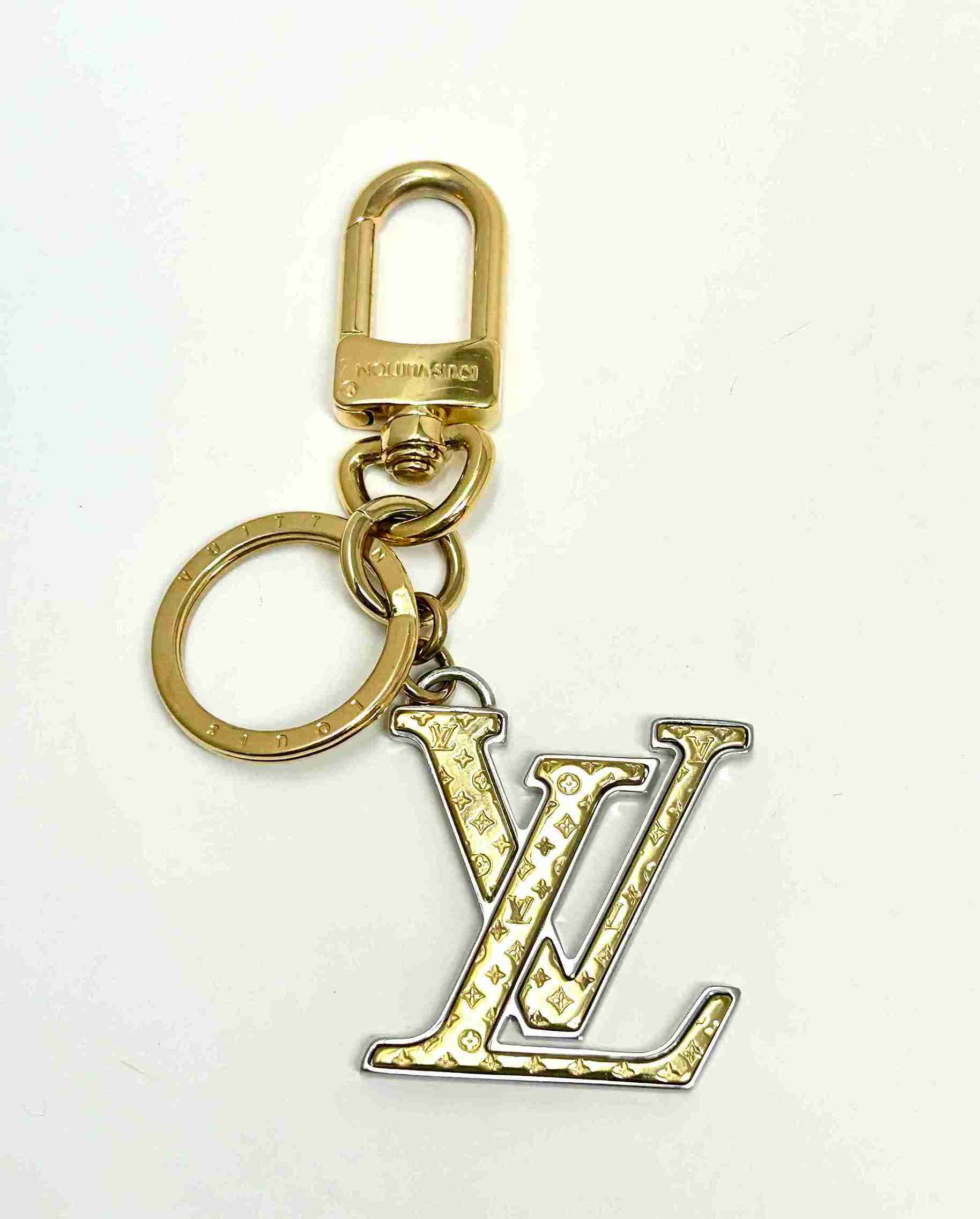 - Gold and silver tone bag charm and key holder featuring an LV shaped charm which is engraved with the brand's iconic Monogram print, a key ring and a snap hook engraved with the Louis Vuitton signature