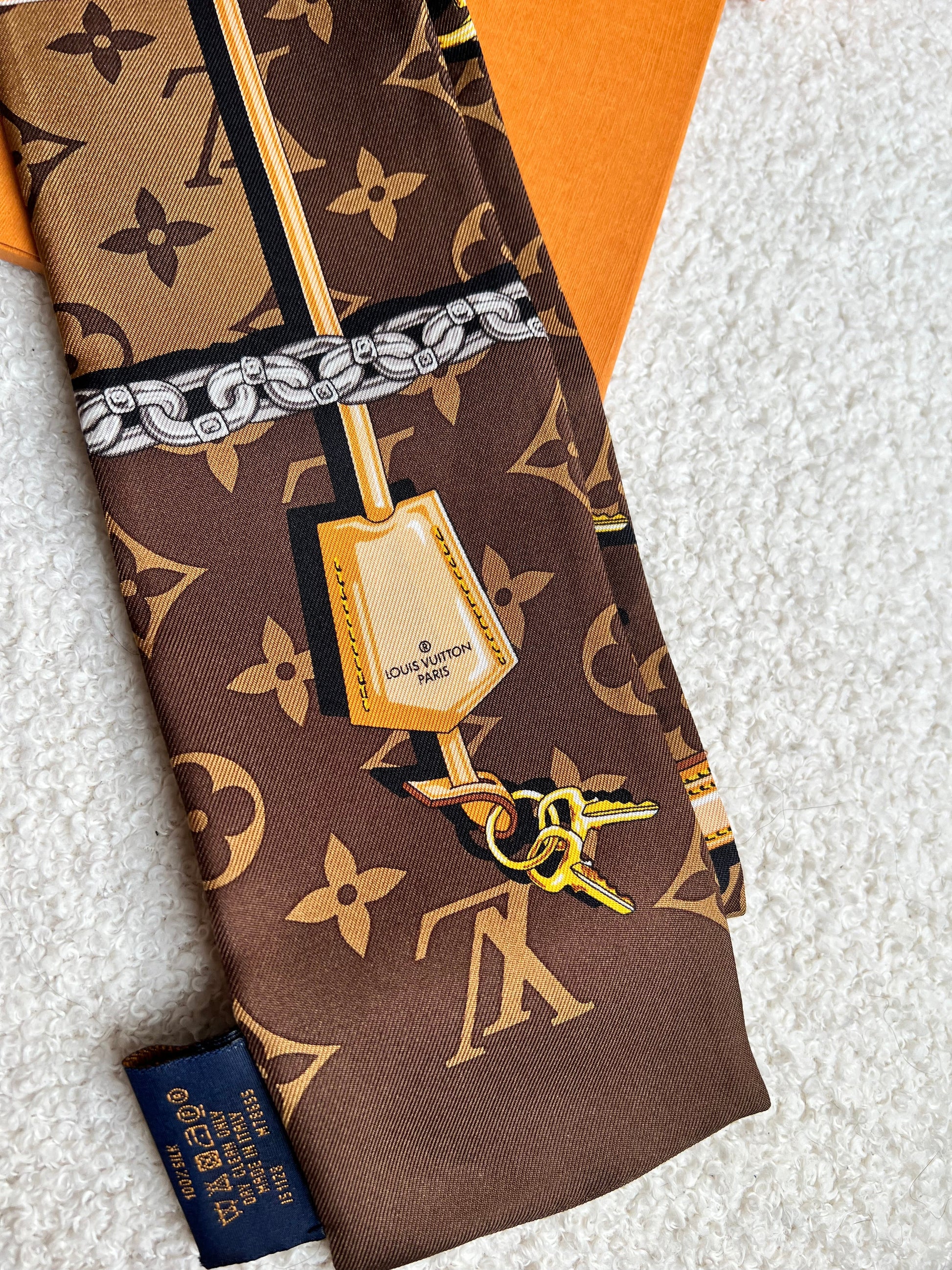 Louis Vuitton Confidential Bandeau. The Monogram Confidential Bandeau is a versatile gift idea. This silk scarf is printed with emblematic House motifs, including leather straps, chains and padlocks, set against a Monogram pattern background. This stylish accessory can be worn around the neck, hair or on the handle of a Louis Vuitton bag.