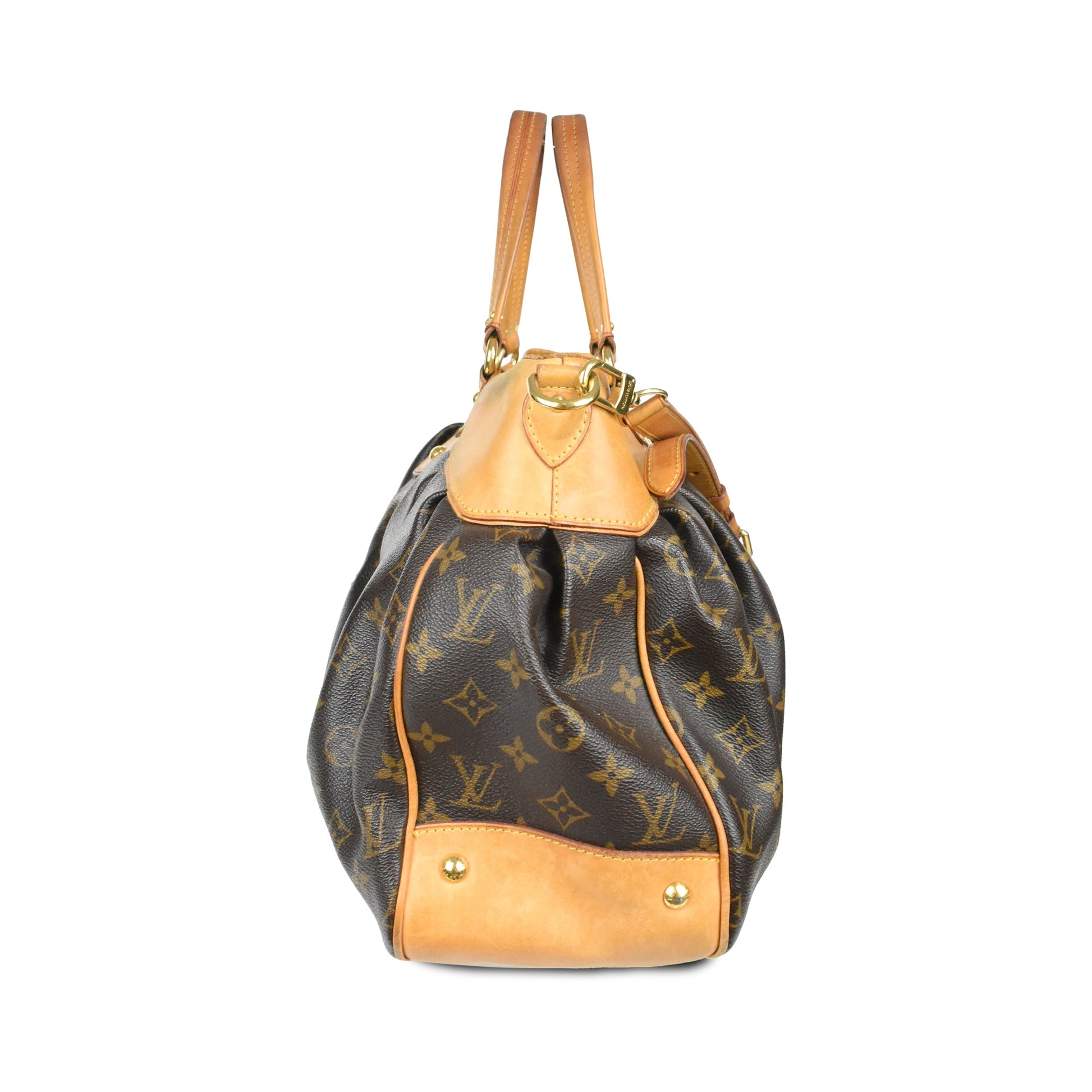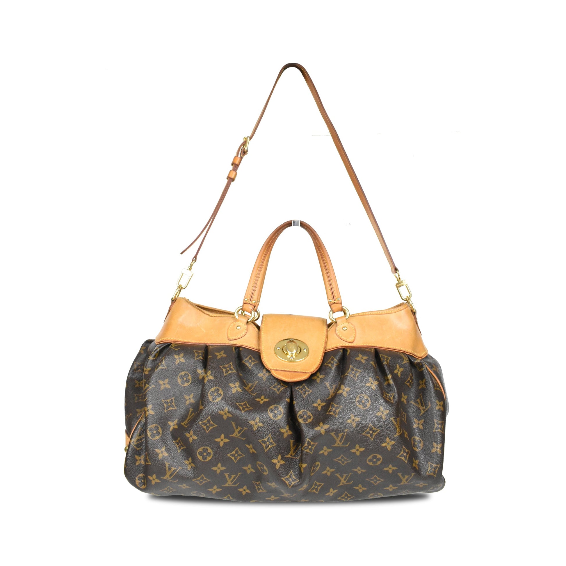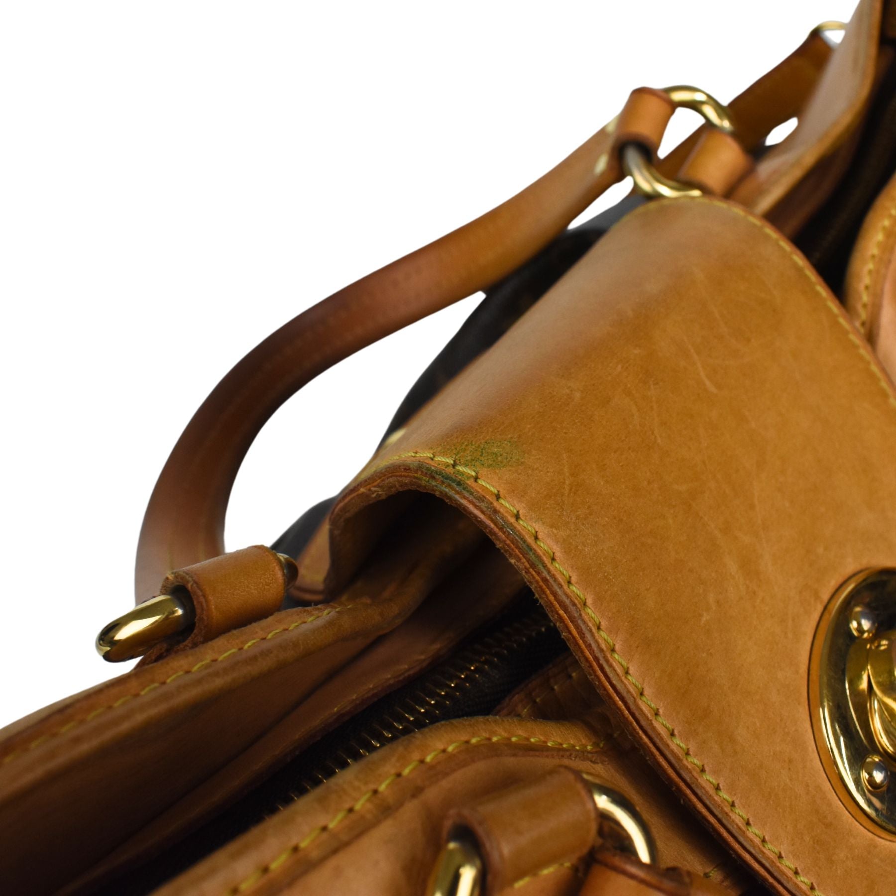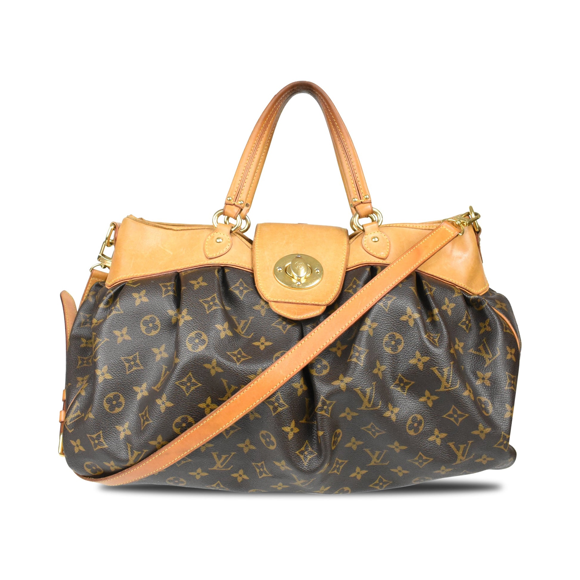 Louis Vuitton 'Boetie' large handbag in brown logo monogram coated canvas with tan vachetta leather. trim. Features a removable and adjustable leather shoulder strap, two flat top handles, a top flap with turn-lock closure, a top zip closure, and leather corners at the base with metal feet. Circa 2009.