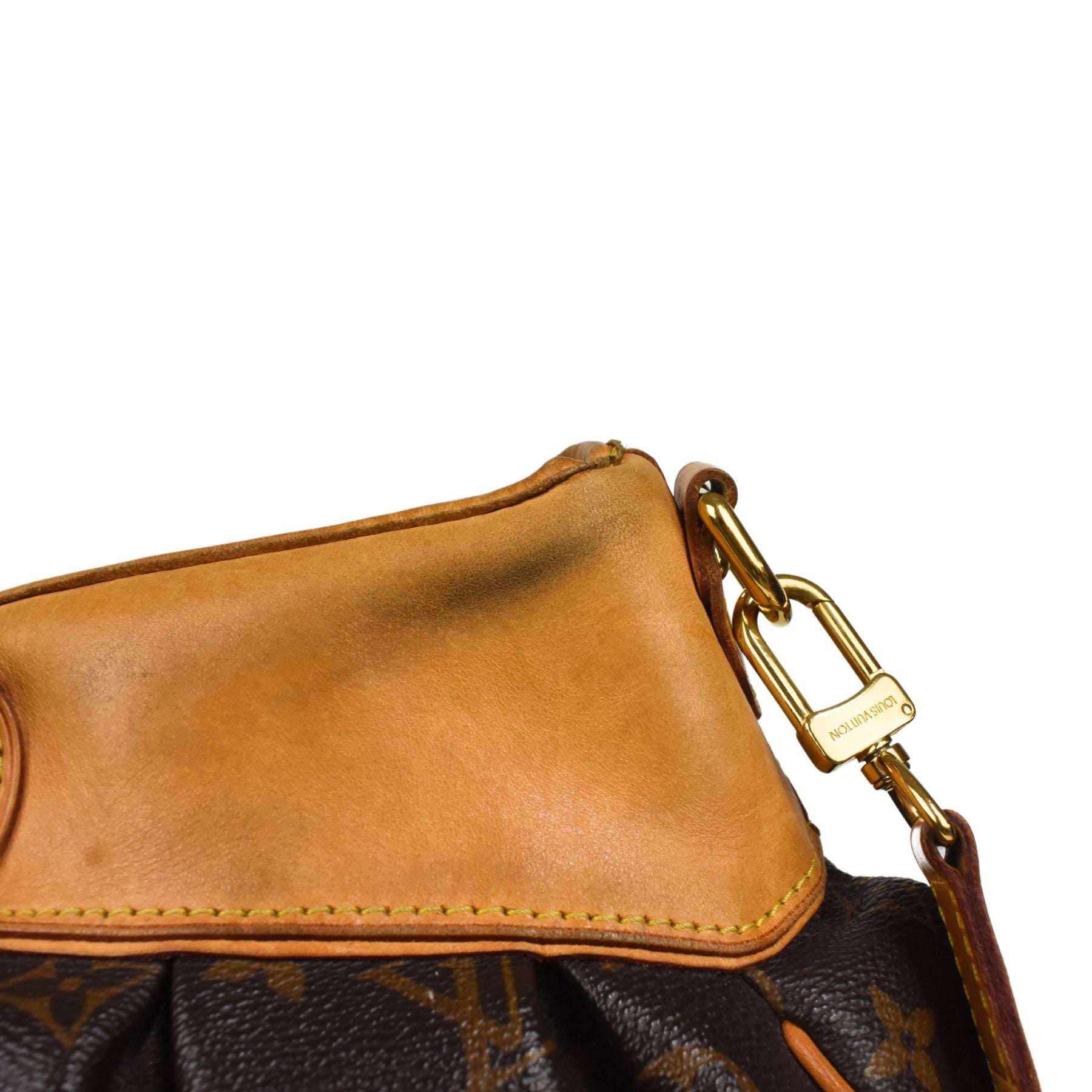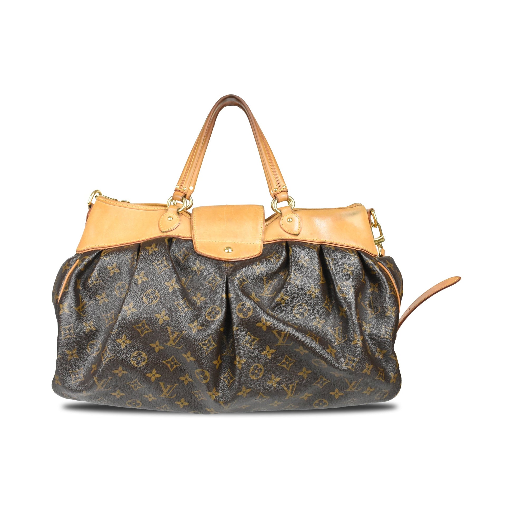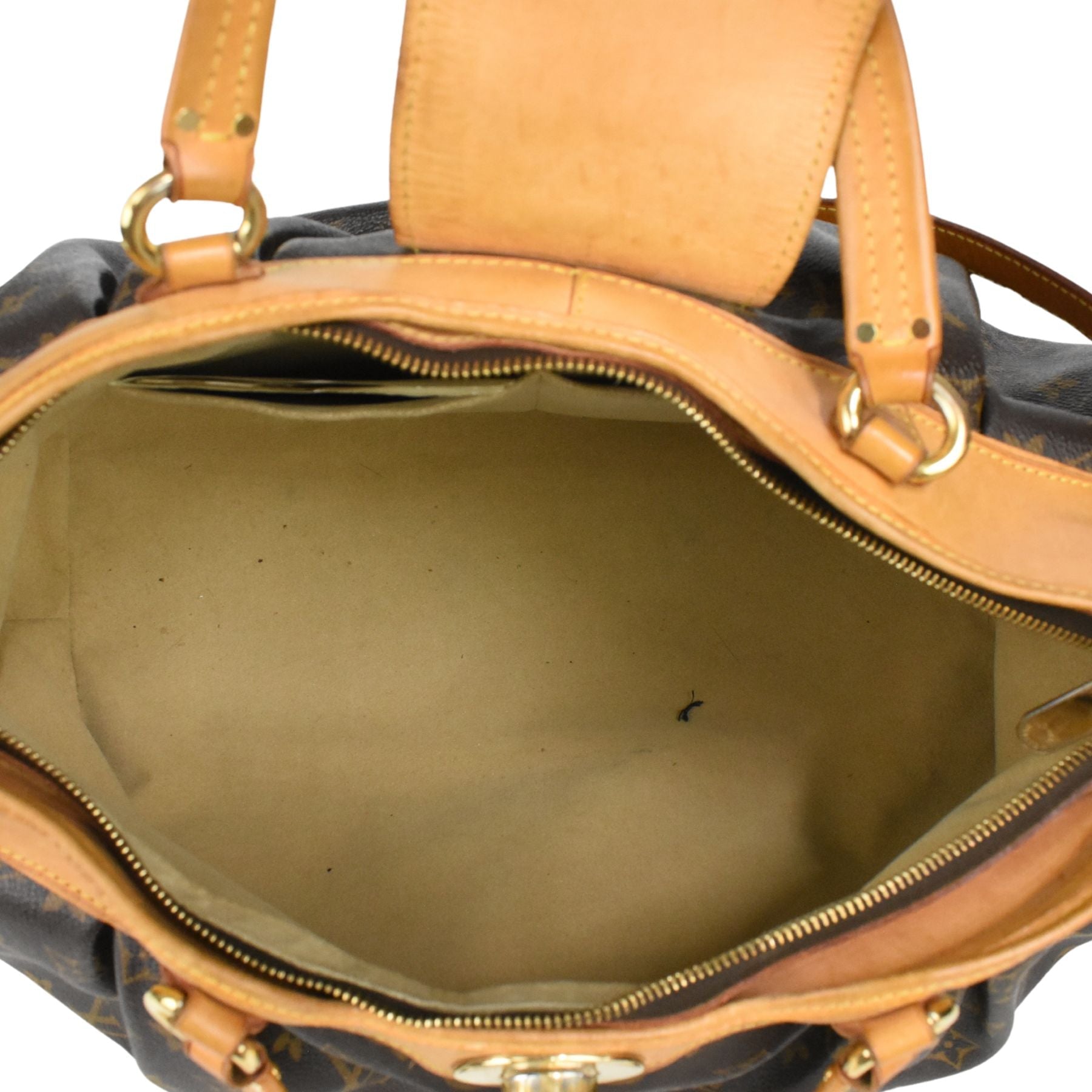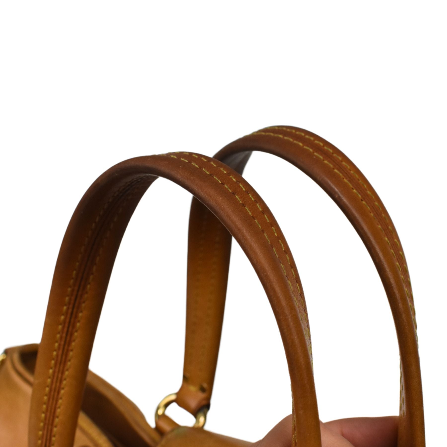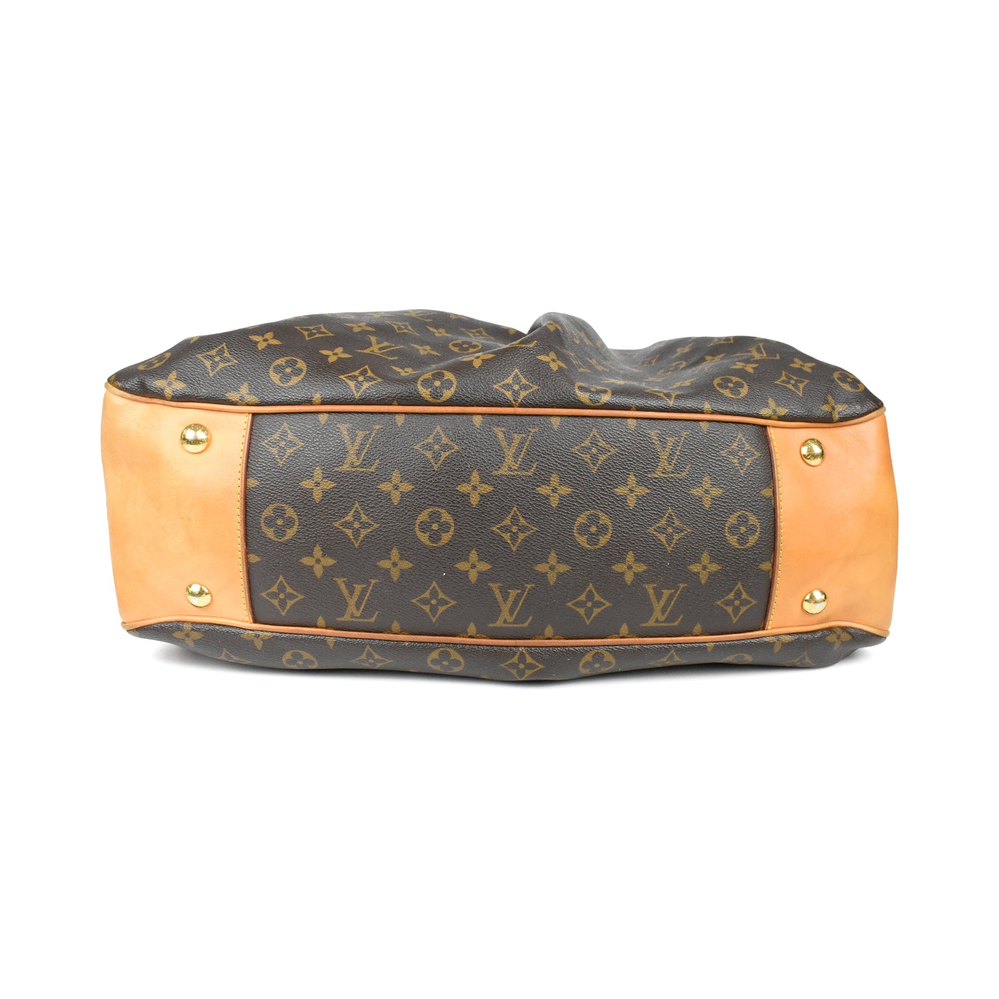 Louis Vuitton 'Boetie' large handbag in brown logo monogram coated canvas with tan vachetta leather. trim. Features a removable and adjustable leather shoulder strap, two flat top handles, a top flap with turn-lock closure, a top zip closure, and leather corners at the base with metal feet. Circa 2009.