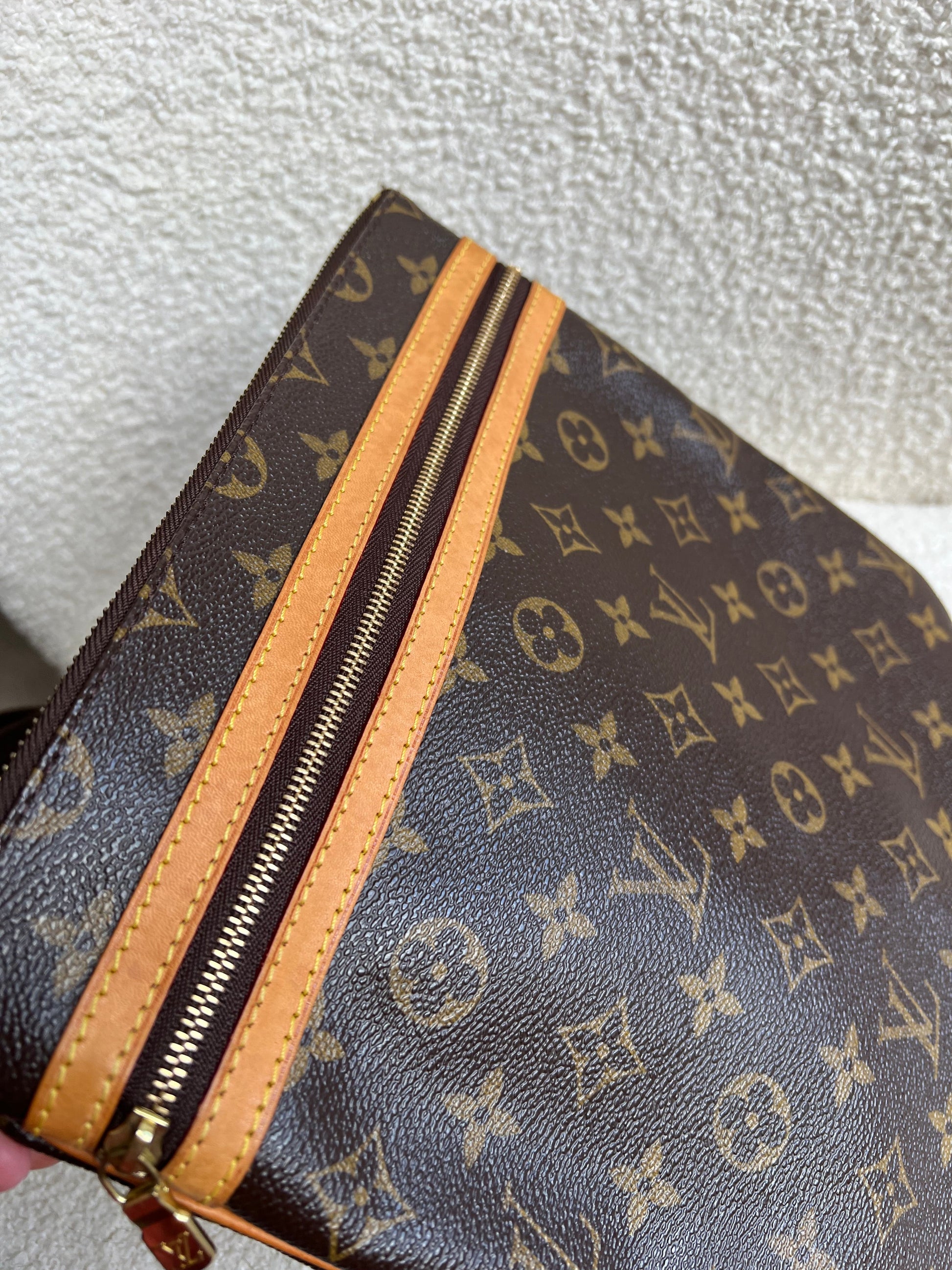 Louis Vuitton Bosphore Messenger Bag in monogram canvas and gold hardware. This slim messenger style is ideal for day to day use for those who prefer slim line hands free bags. Crafted in the iconic canvas, this lower priced LV is ideal for a starter bag or one you don’t have to baby. Can be worn over shoulder or cross body. Image 2 shows Damier Azur version for size reference.