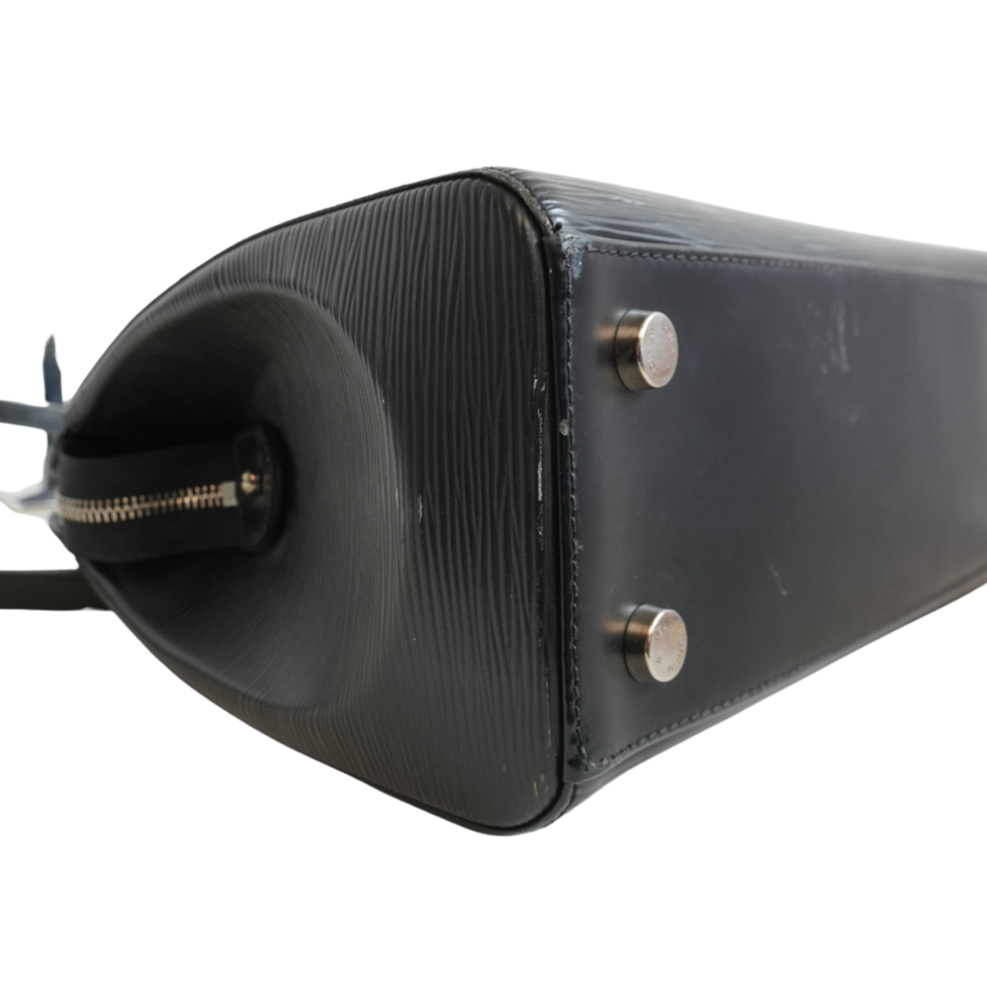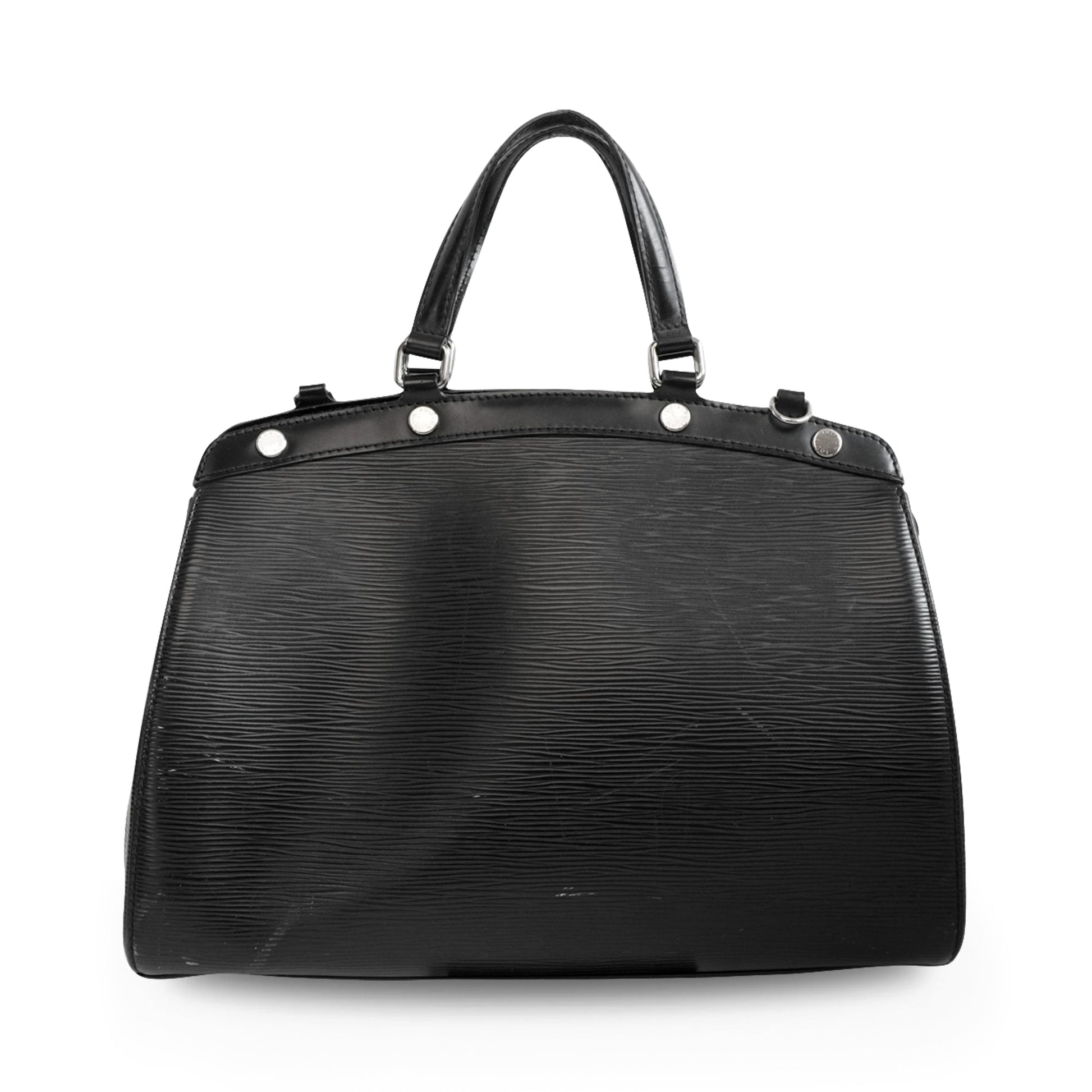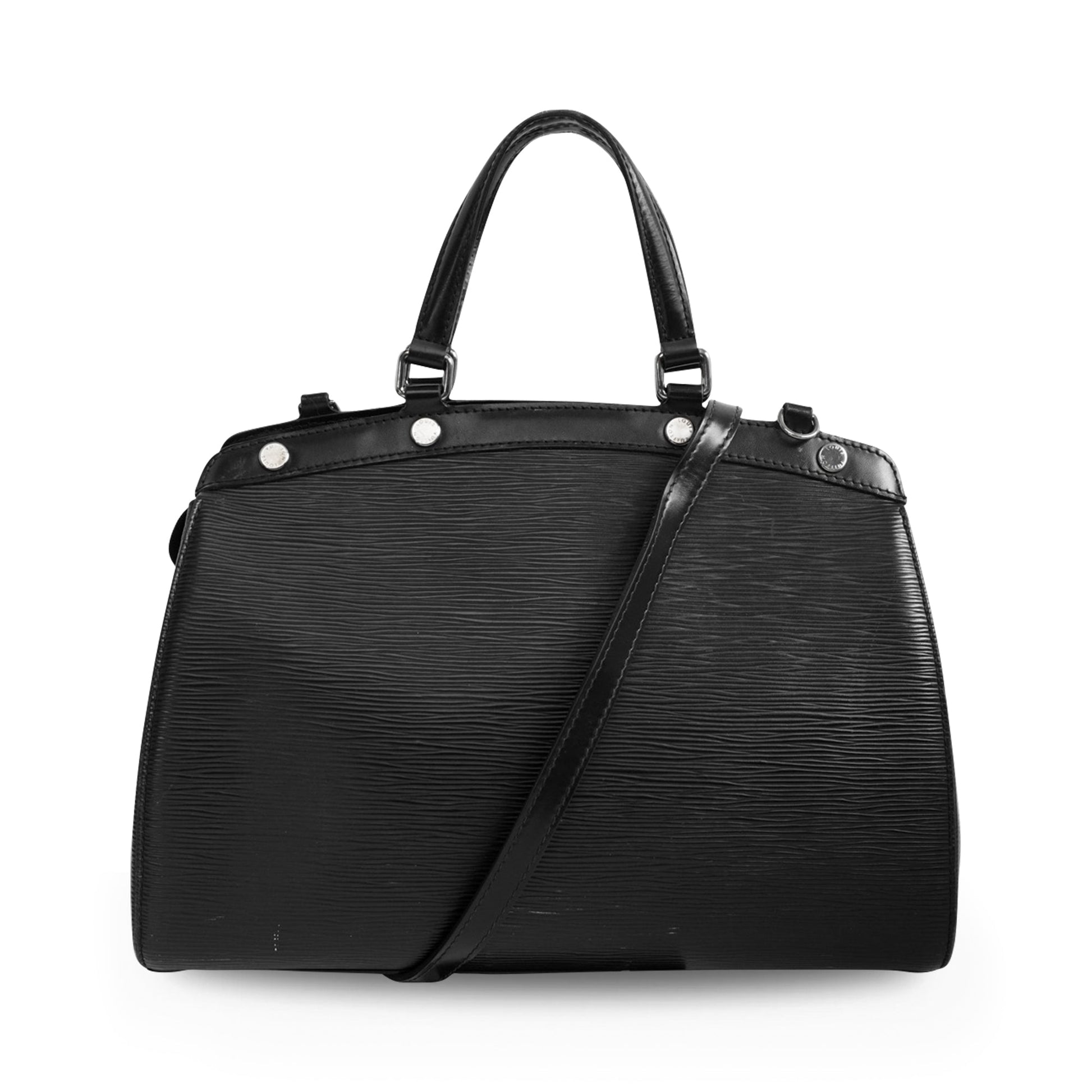 Louis Vuitton 'Brea MM' handbag in black epi leather with smooth leather trim, dual top handles, and a removable and adjustable shoulder strap. The bag has a top zip opening in silver hardware, revealing a black canvas interior lining with zip and slip pockets.