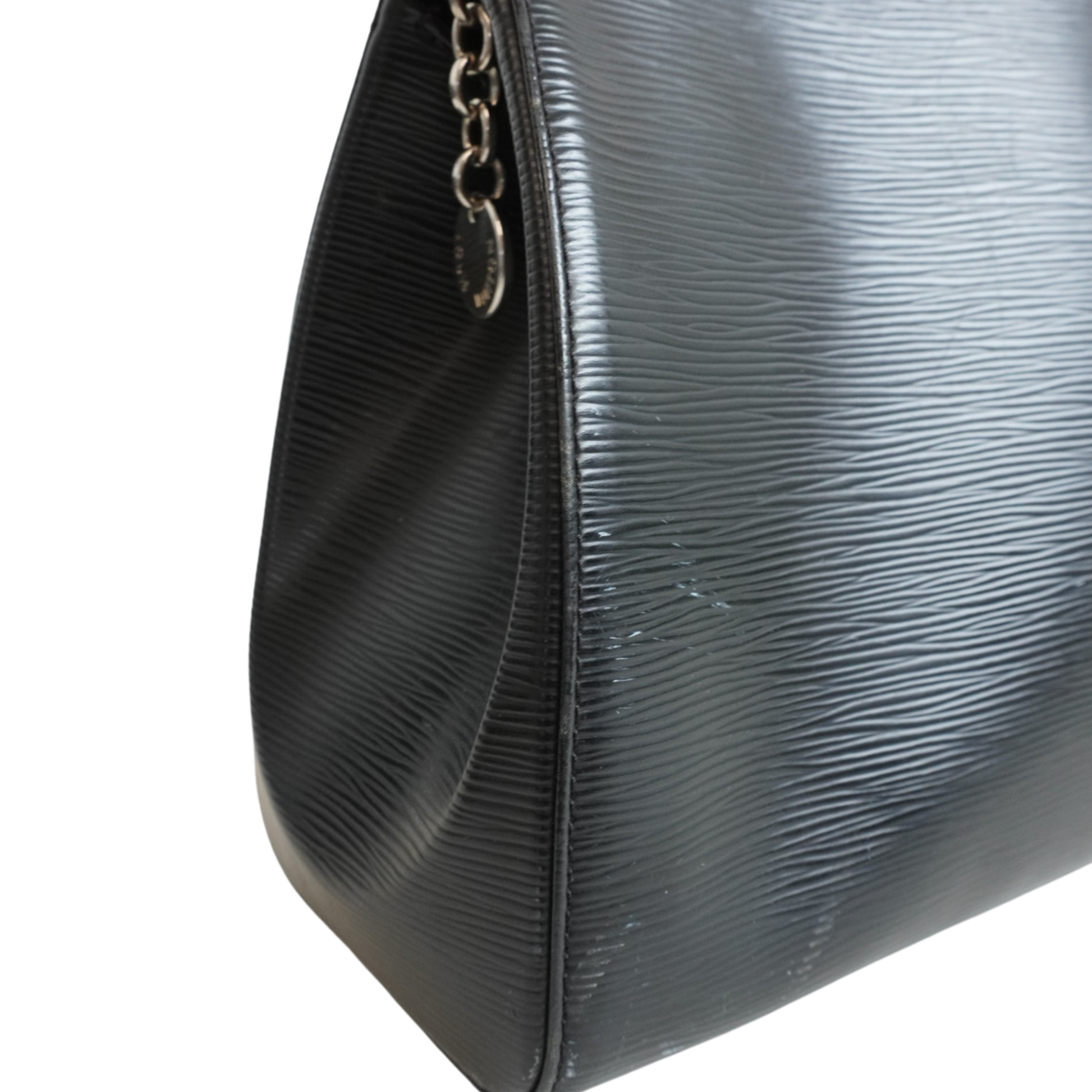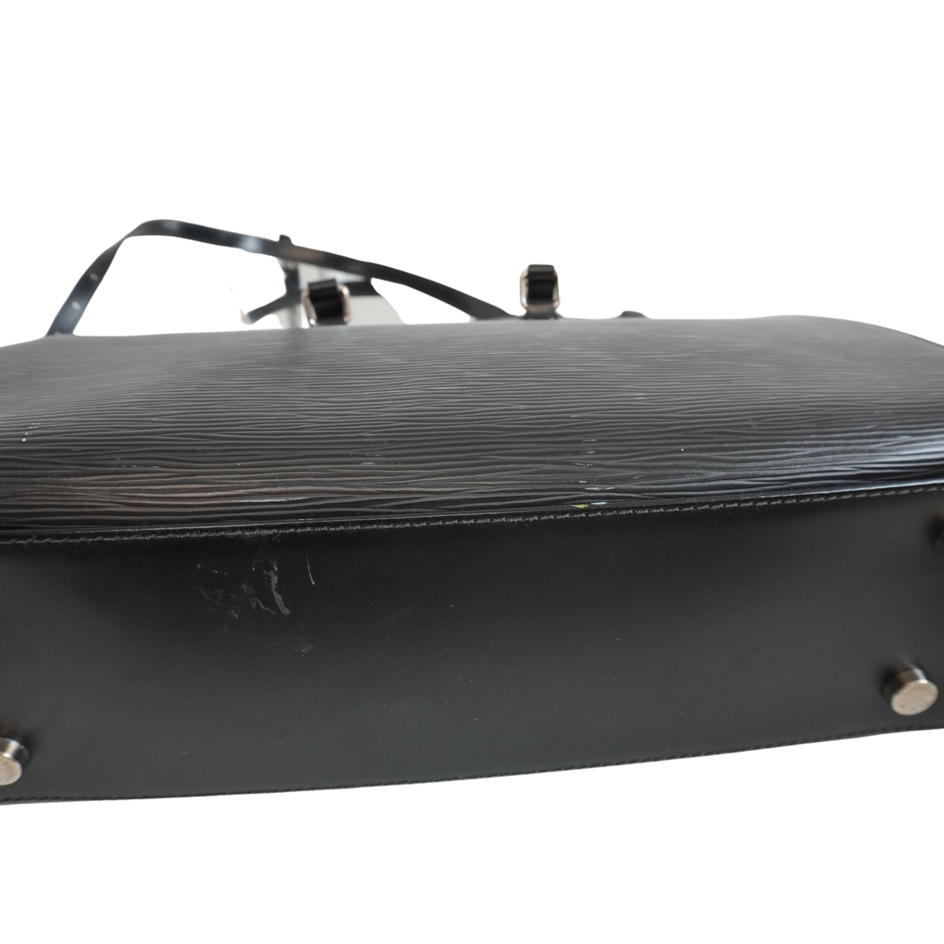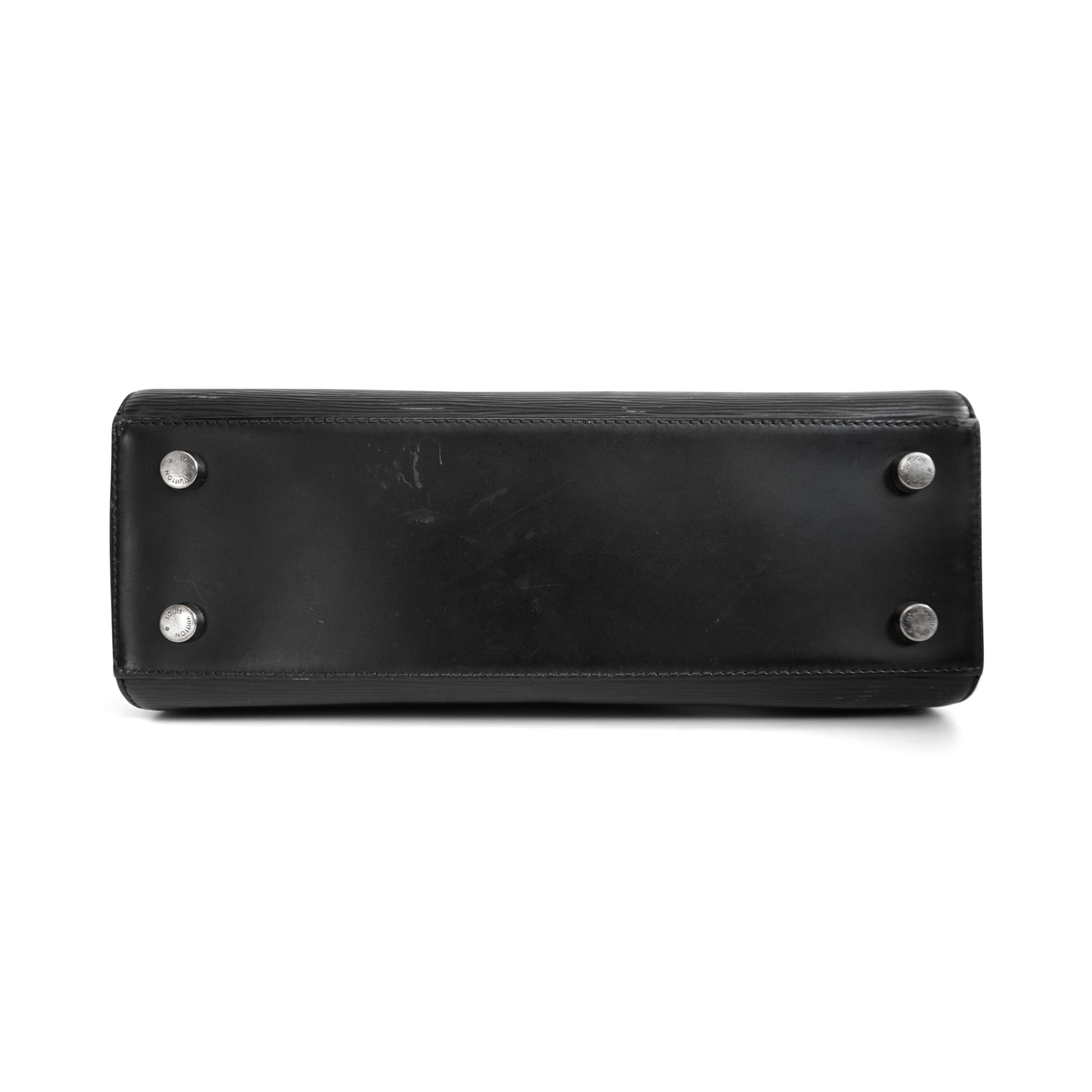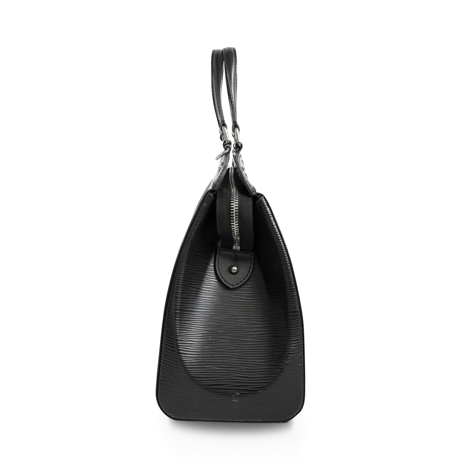 Louis Vuitton 'Brea MM' handbag in black epi leather with smooth leather trim, dual top handles, and a removable and adjustable shoulder strap. The bag has a top zip opening in silver hardware, revealing a black canvas interior lining with zip and slip pockets.