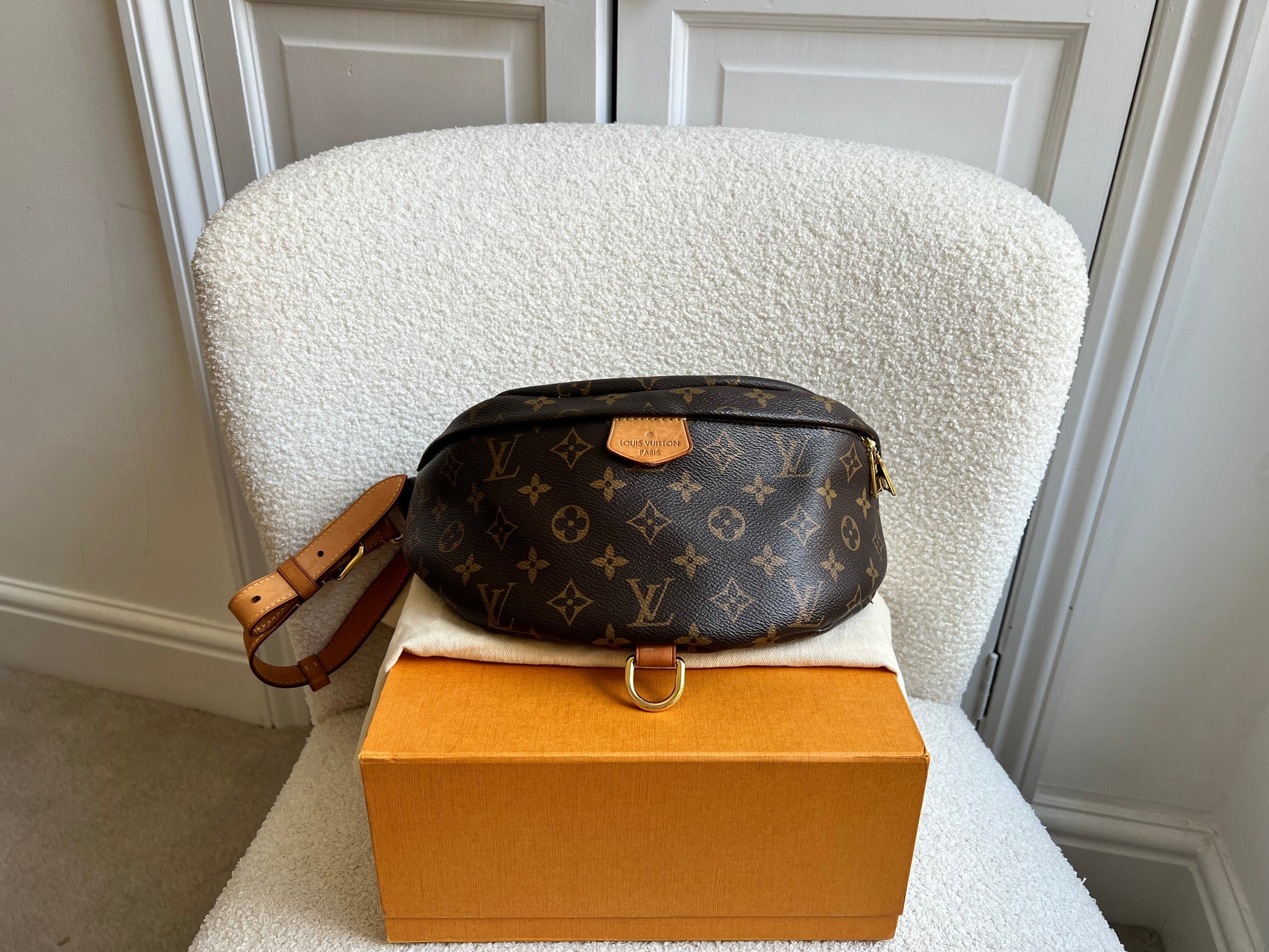 Louis Vuitton Bum Bag in Canvas Monogram with gold hardware. Fashioned in classic Monogram canvas and signed with a “Louis Vuitton Paris” leather patch, this uber-functional bumbag transforms sportwear into the very definition of casual chic. Wear it as a belt bag, cross-body or over the shoulder for a jauntier look. This highly sought after style is no longer available at LV and sells at premium usually. 2019 year.