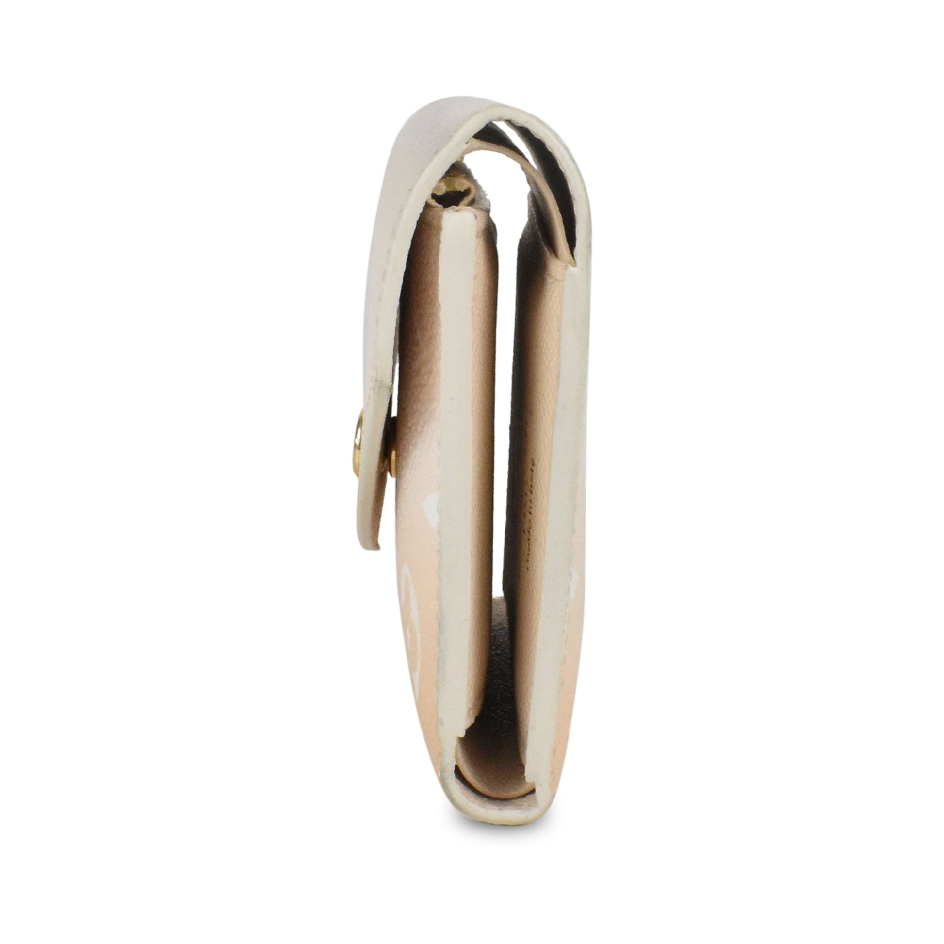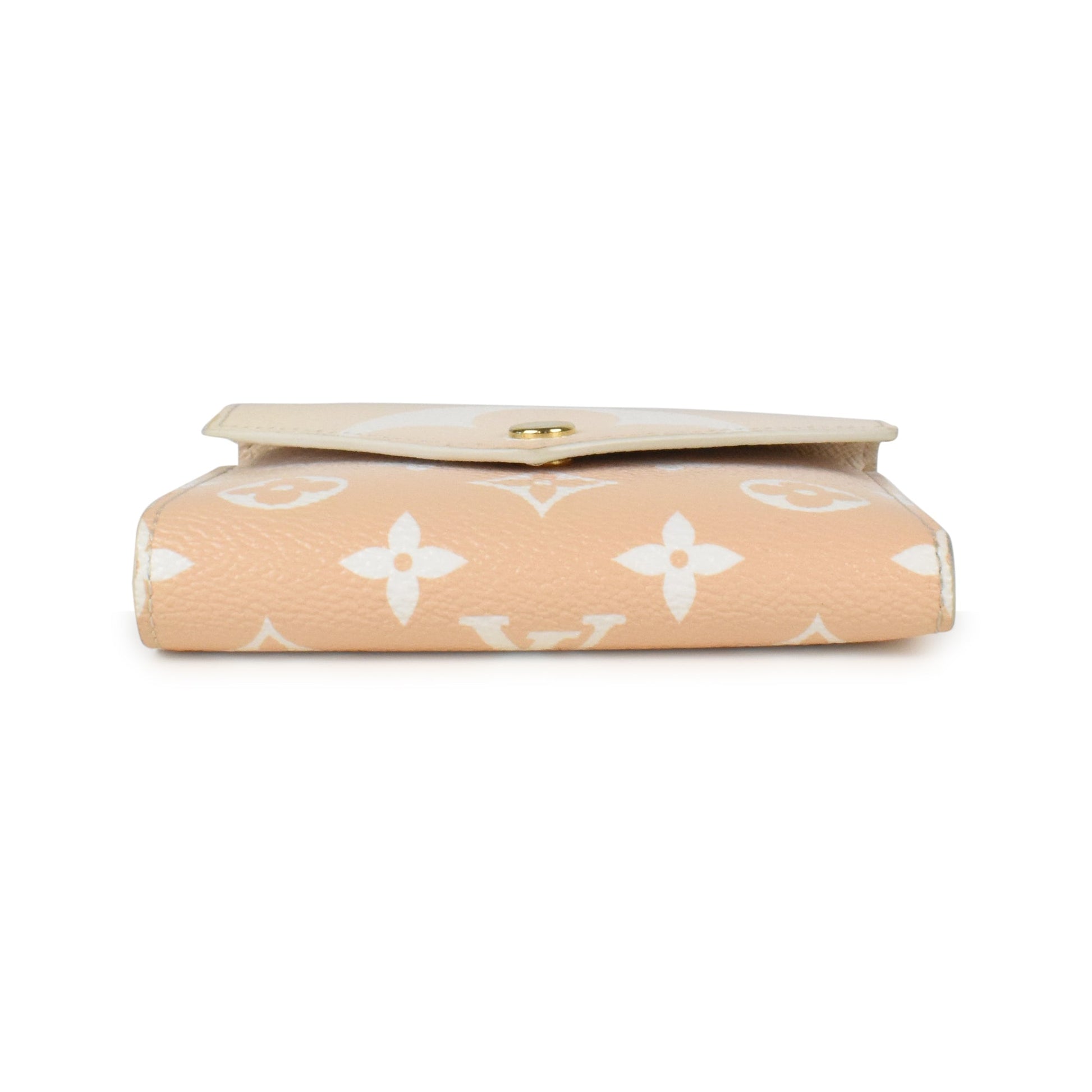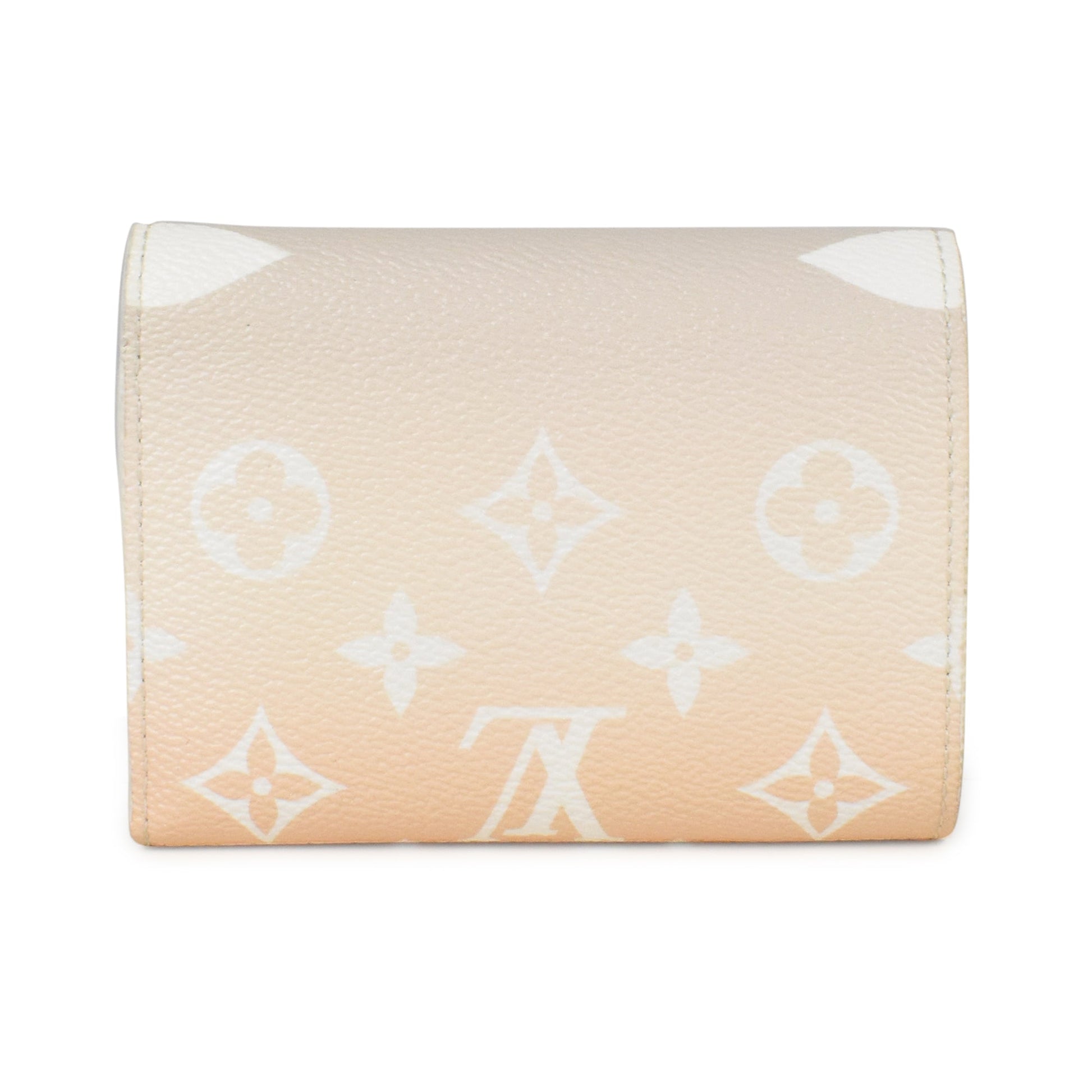 Louis Vuitton 'By the Pool Victorine' snap wallet in a peach to white ombre coated canvas. Features large logo motifs in white and a gold hardware snap closure. The interior features multiple card slots, cash slots, and a zip pocket.