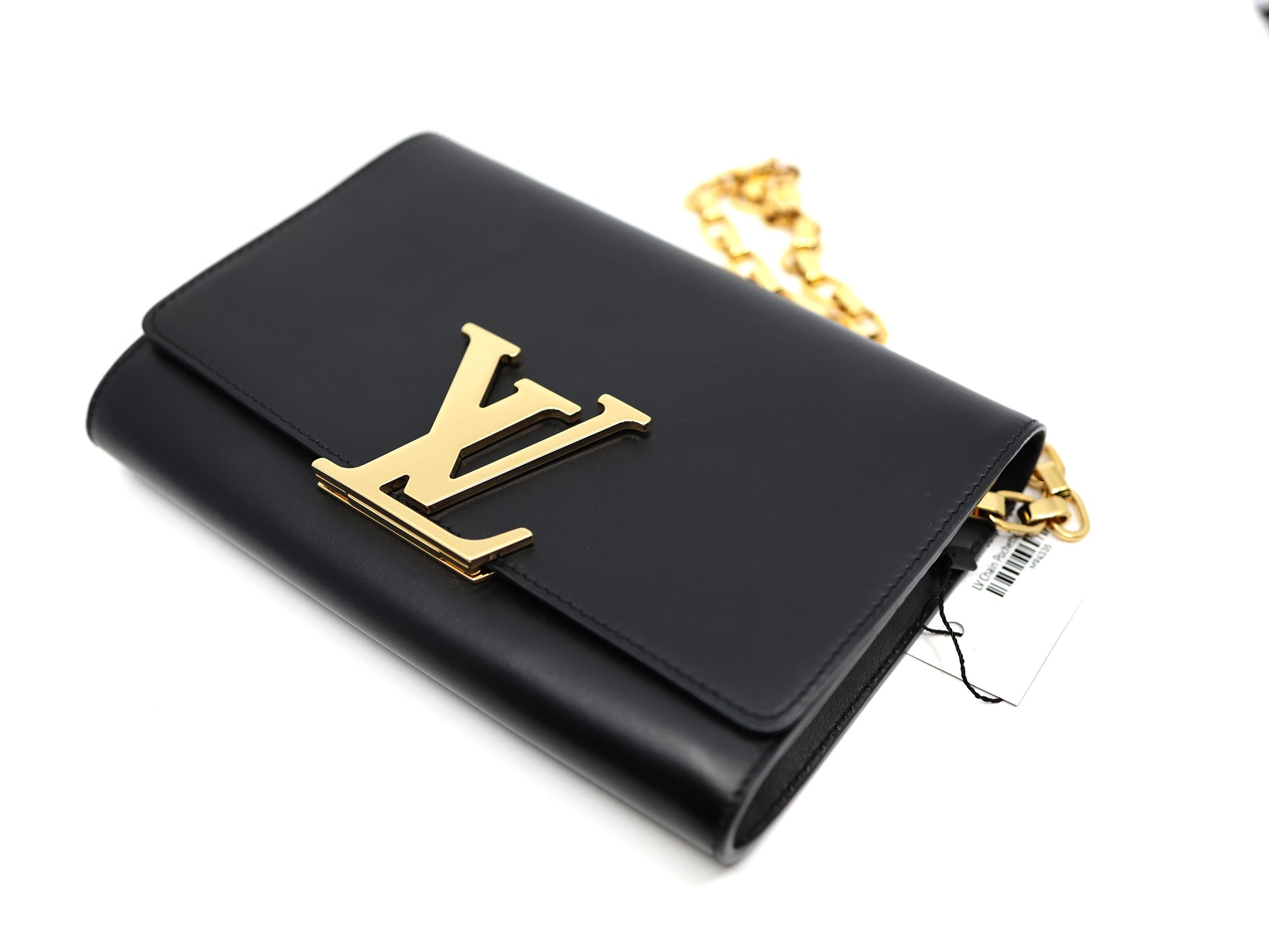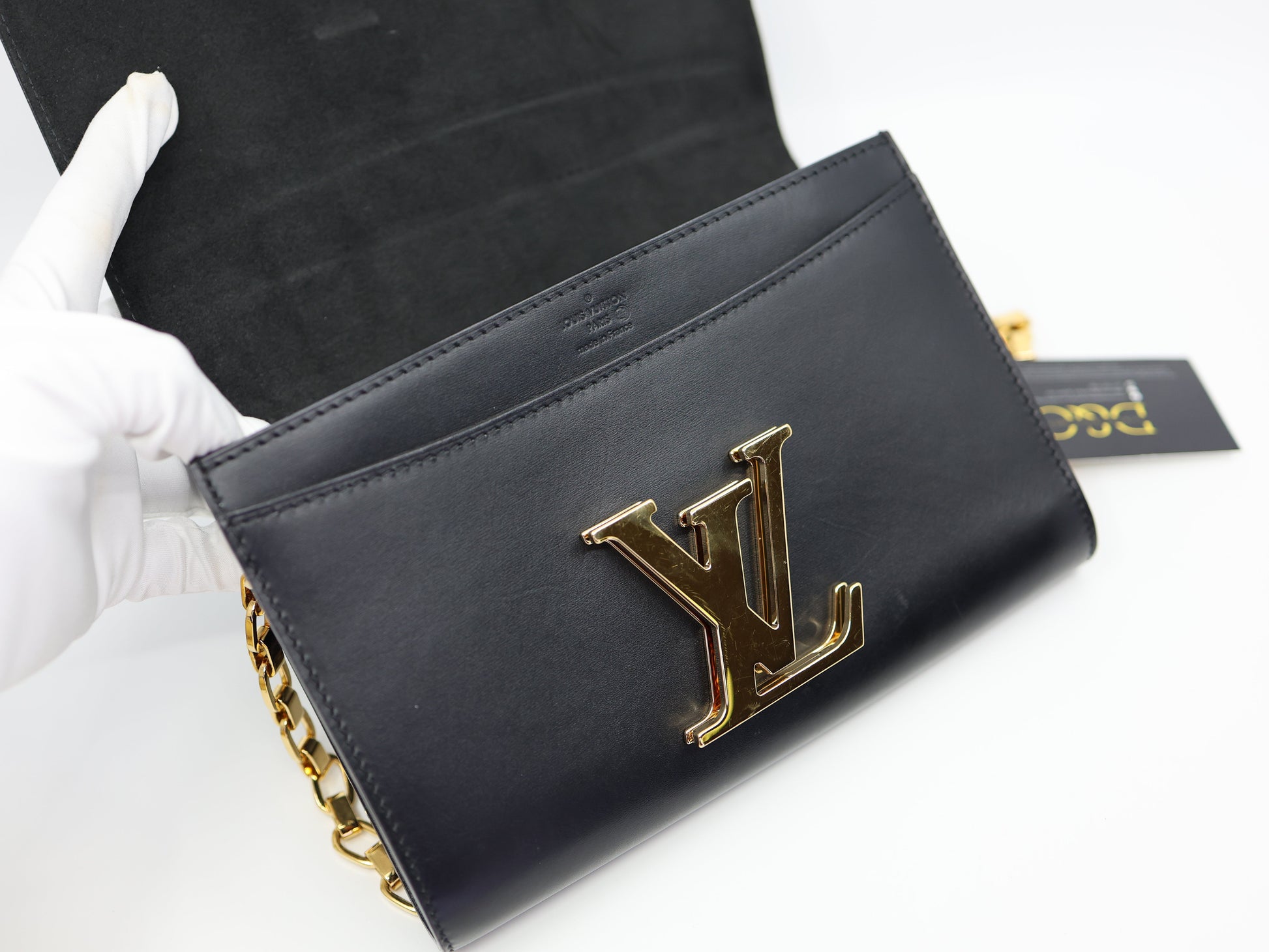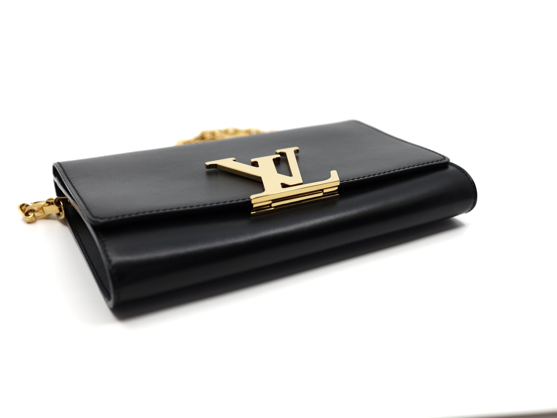 Crafted from premium calfskin in classic black, the LOUIS VUITTON Calfskin Chain Louise MM is an exquisite evening bag featuring a snap closure and LV hardware detail. The interior is lined with black microfiber and offers convenient credit card slots, a zipper pocket, and a flat pocket. An elegant gold chain link strap can be discreetly tucked inside for a sophisticated evening look, showcasing Louis Vuitton's signature style.
