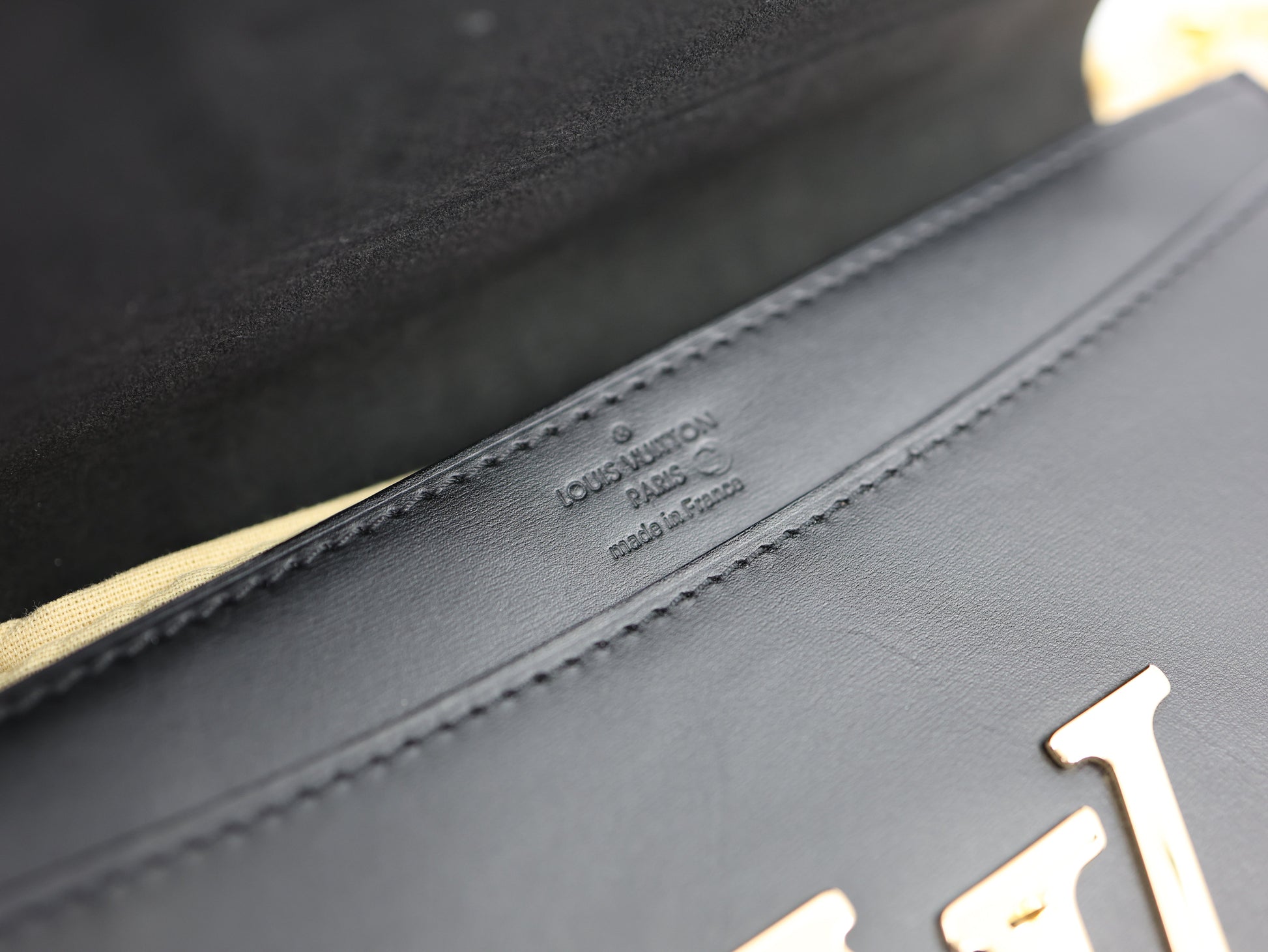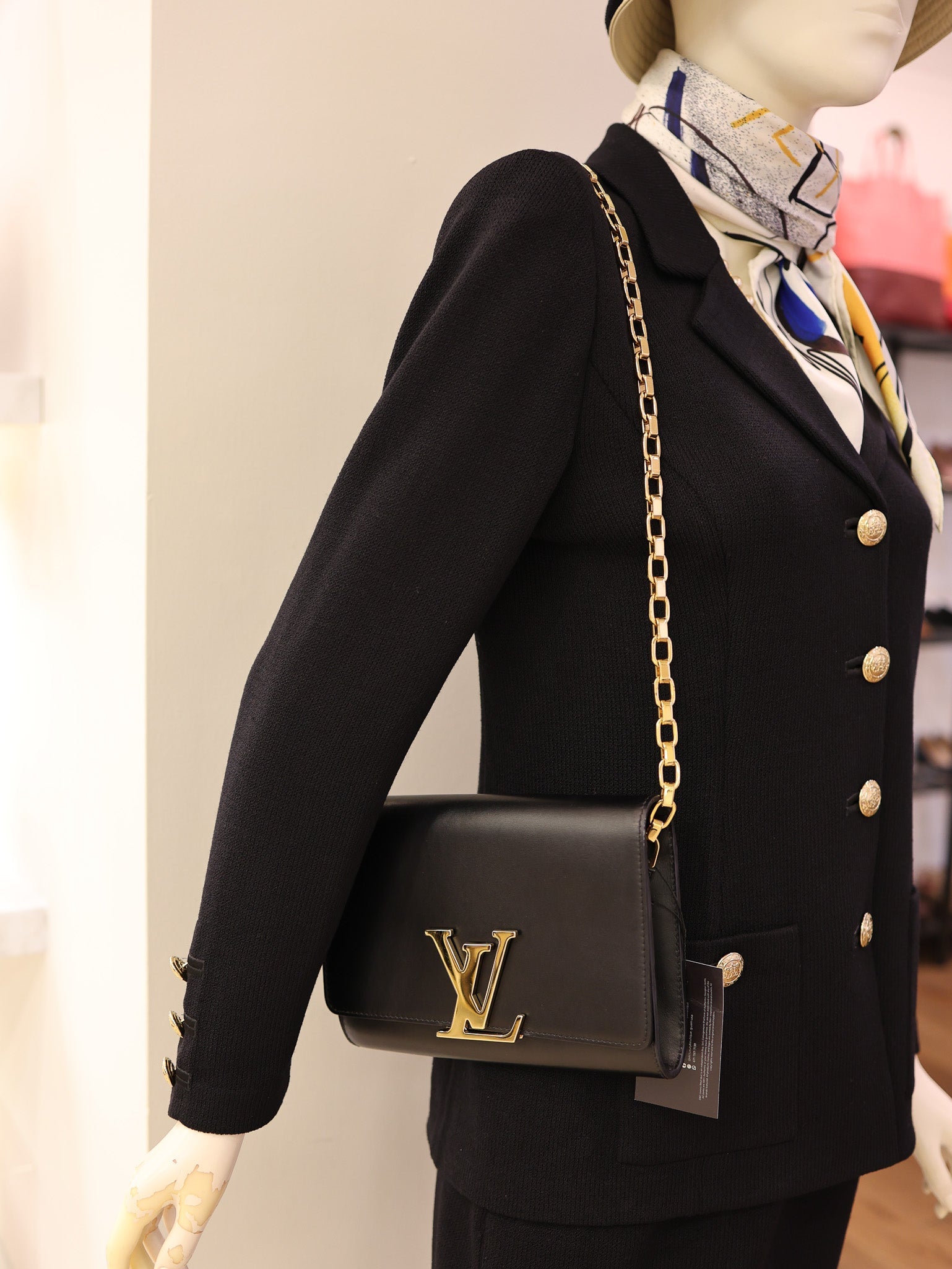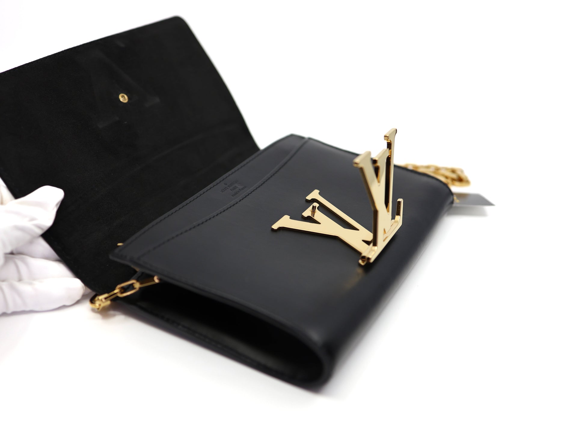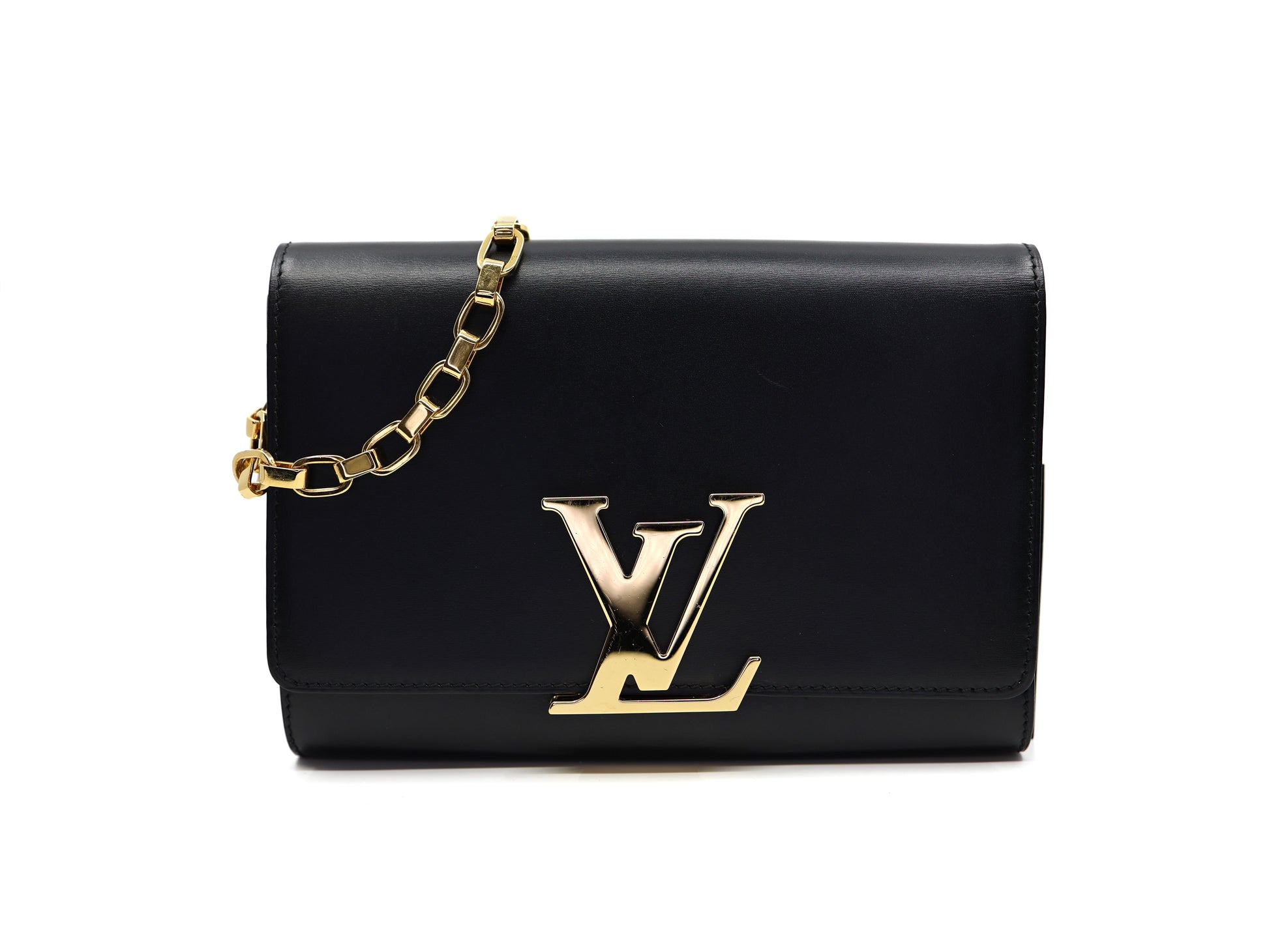 Crafted from premium calfskin in classic black, the LOUIS VUITTON Calfskin Chain Louise MM is an exquisite evening bag featuring a snap closure and LV hardware detail. The interior is lined with black microfiber and offers convenient credit card slots, a zipper pocket, and a flat pocket. An elegant gold chain link strap can be discreetly tucked inside for a sophisticated evening look, showcasing Louis Vuitton's signature style.