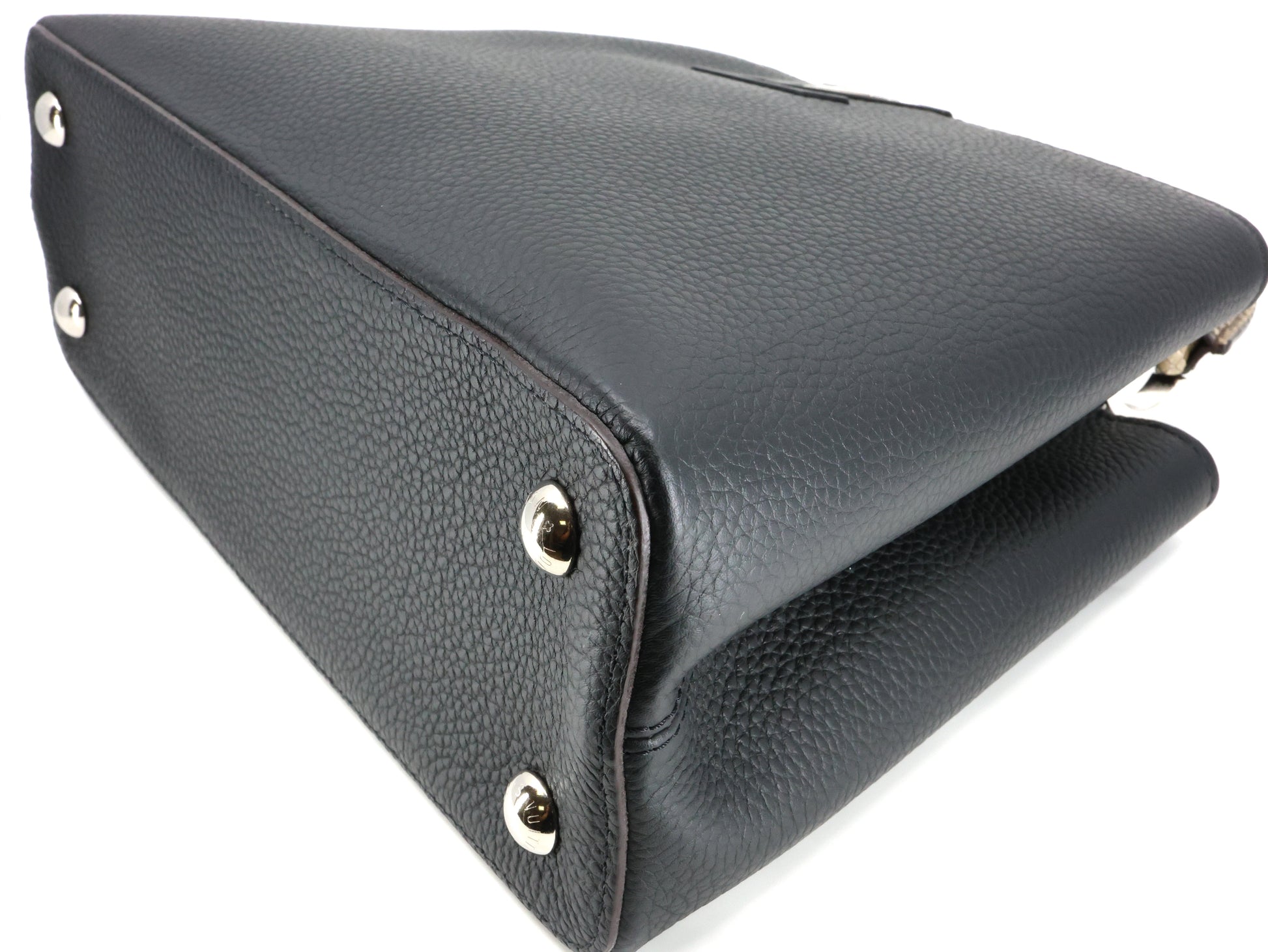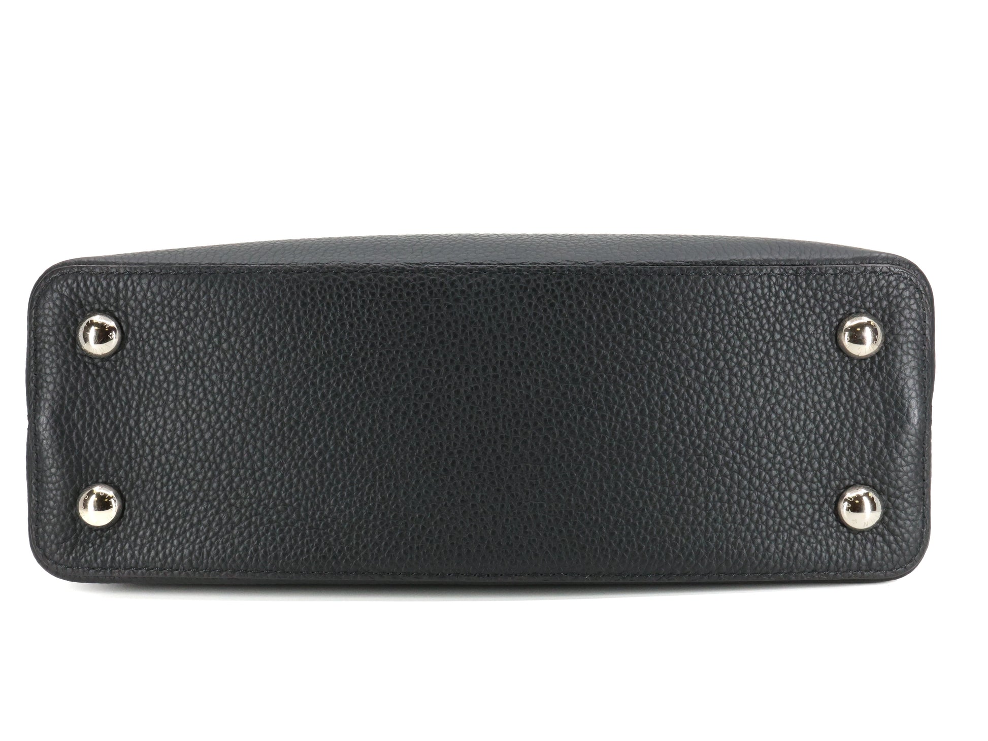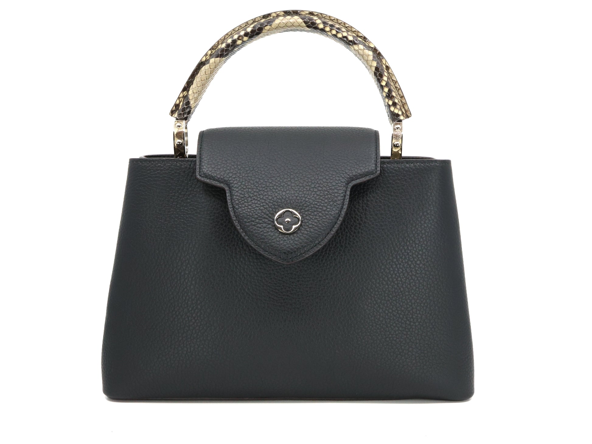Expertly crafted from luxurious Taurillon leather and Python handle, this genuine pre-owned Louis Vuitton Capucines Black bag features a unique flap that can be styled in two ways: revealing a delicate Monogram flower outline on the outside, or showcasing the sophisticated Louis Vuitton initials on the inside. Inside, the leather-lined spacious interior boasts two compartments for optimal organization.