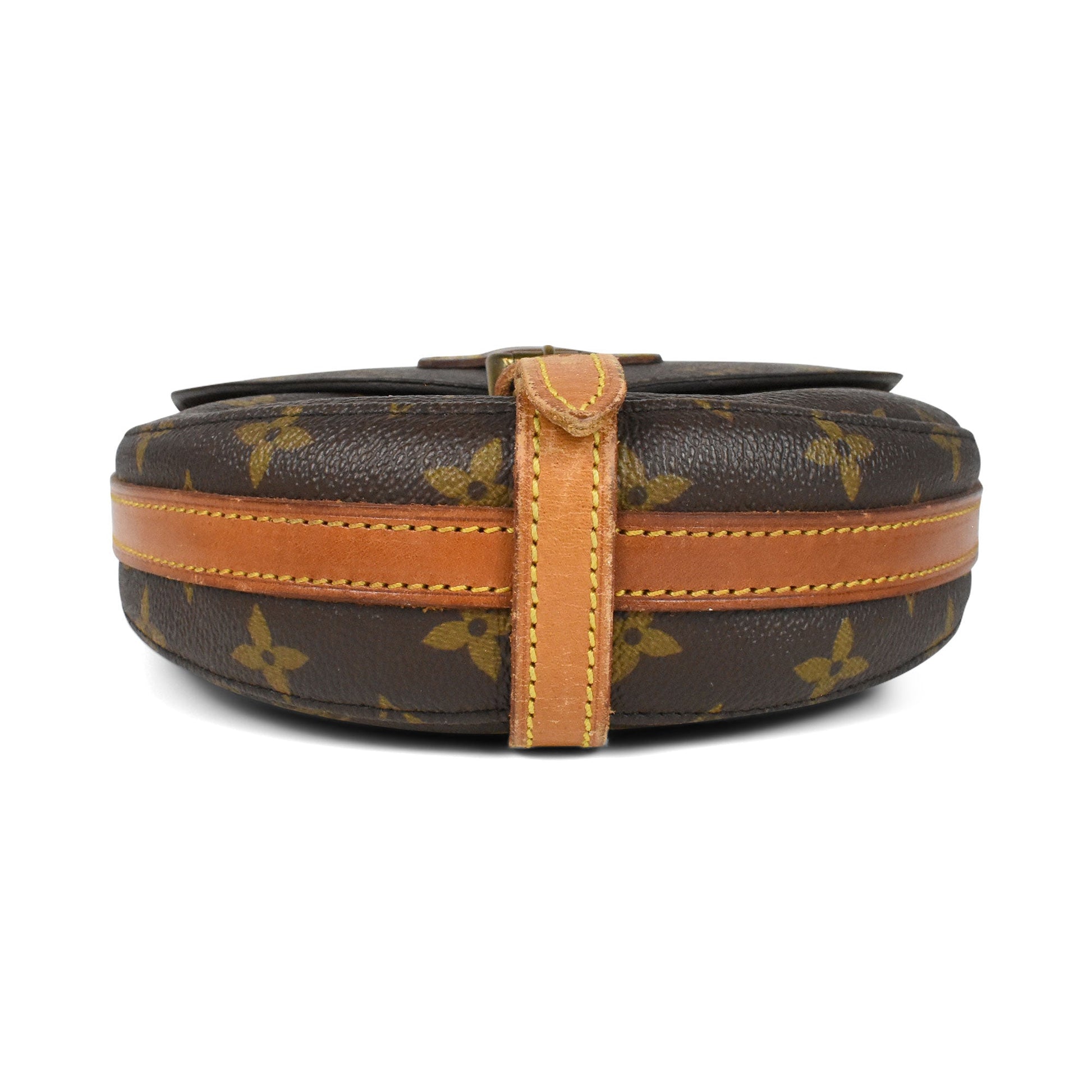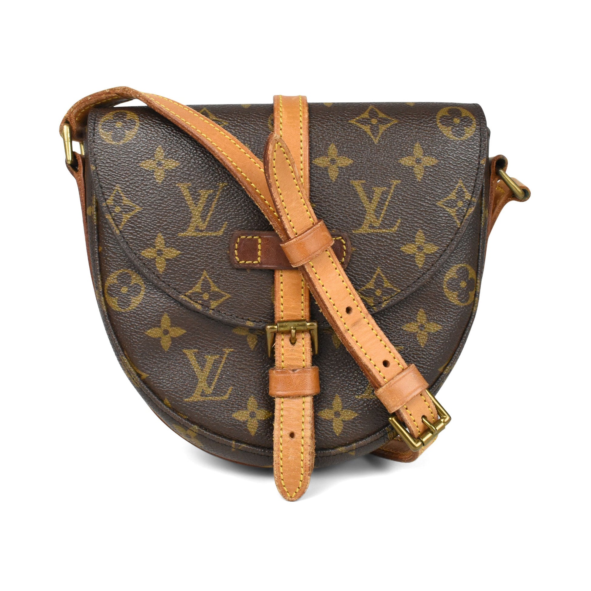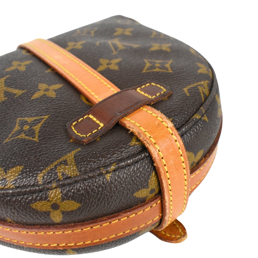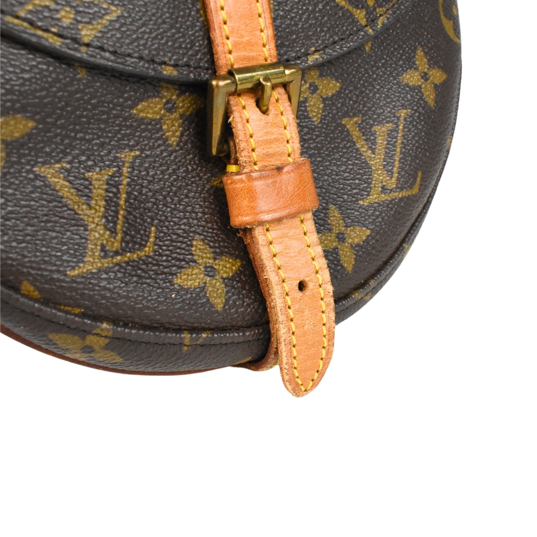 Louis Vuitton 'Chantilly PM' crossbody bag in monogram coated canvas with vachetta leather strap and accents. Features a top flap opening with a leather strap and buckle closure, opening to reveal a coated canvas lining with interior zip pocket. The bag's strap is highly adjustable and can be worn crossbody or on the shoulder.