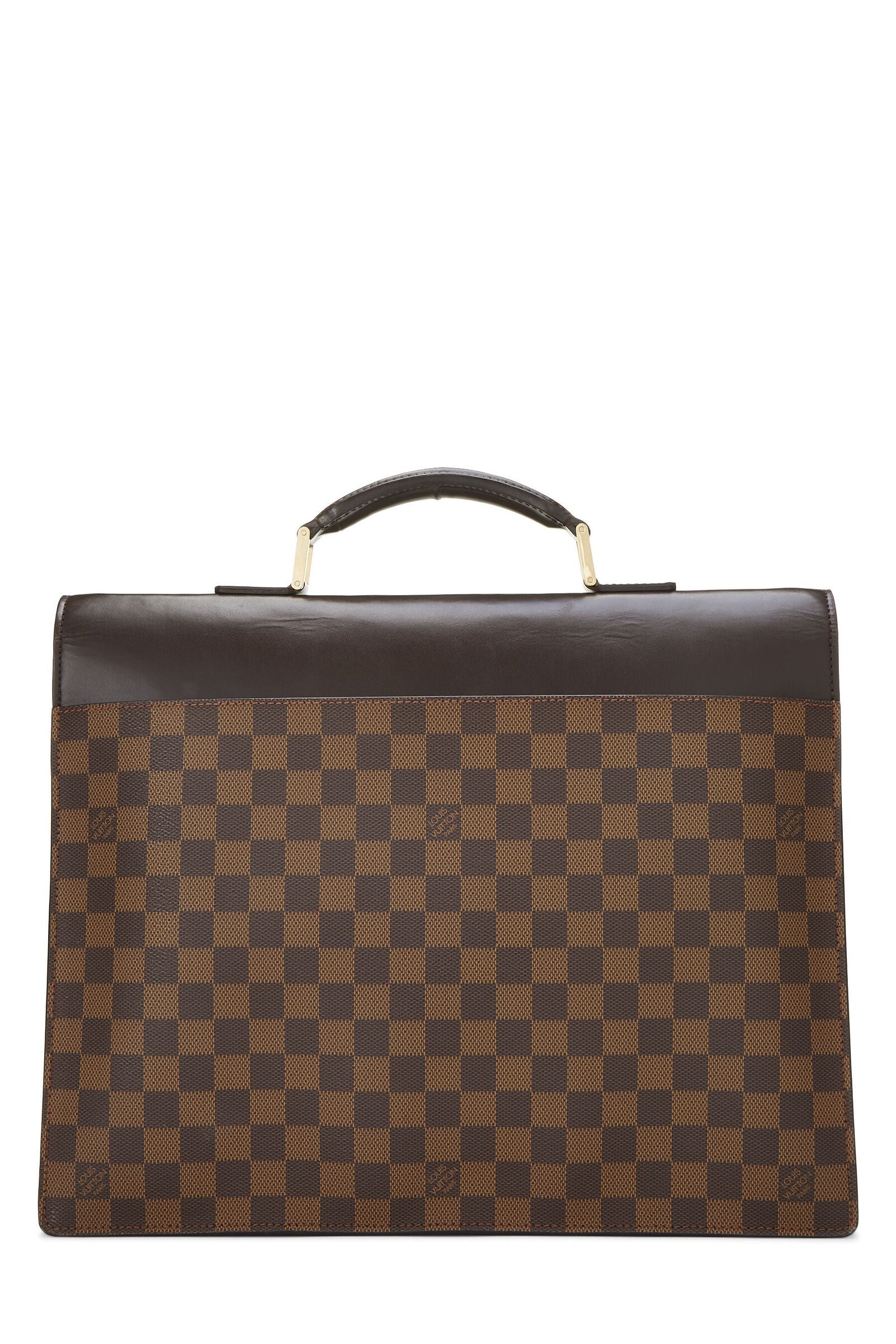 Structured Altona briefcase rendered in Louis Vuitton's signature Damier Ebene check print coated canvas, accented with brown smooth leather trim and finished with gold-tone brass hardware.