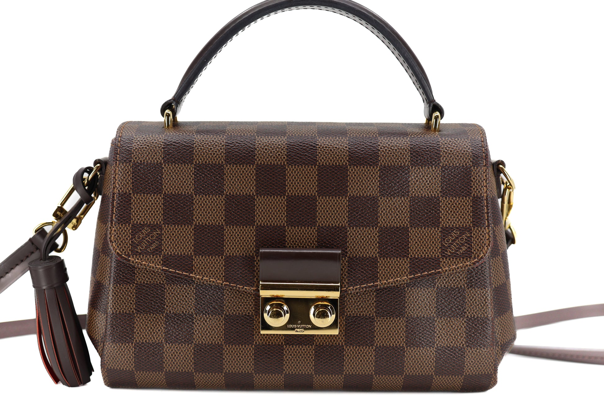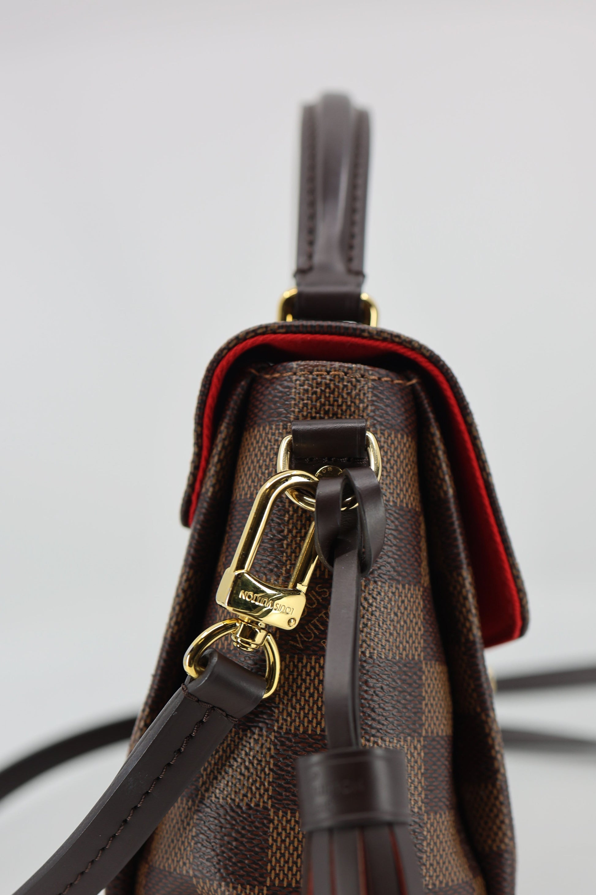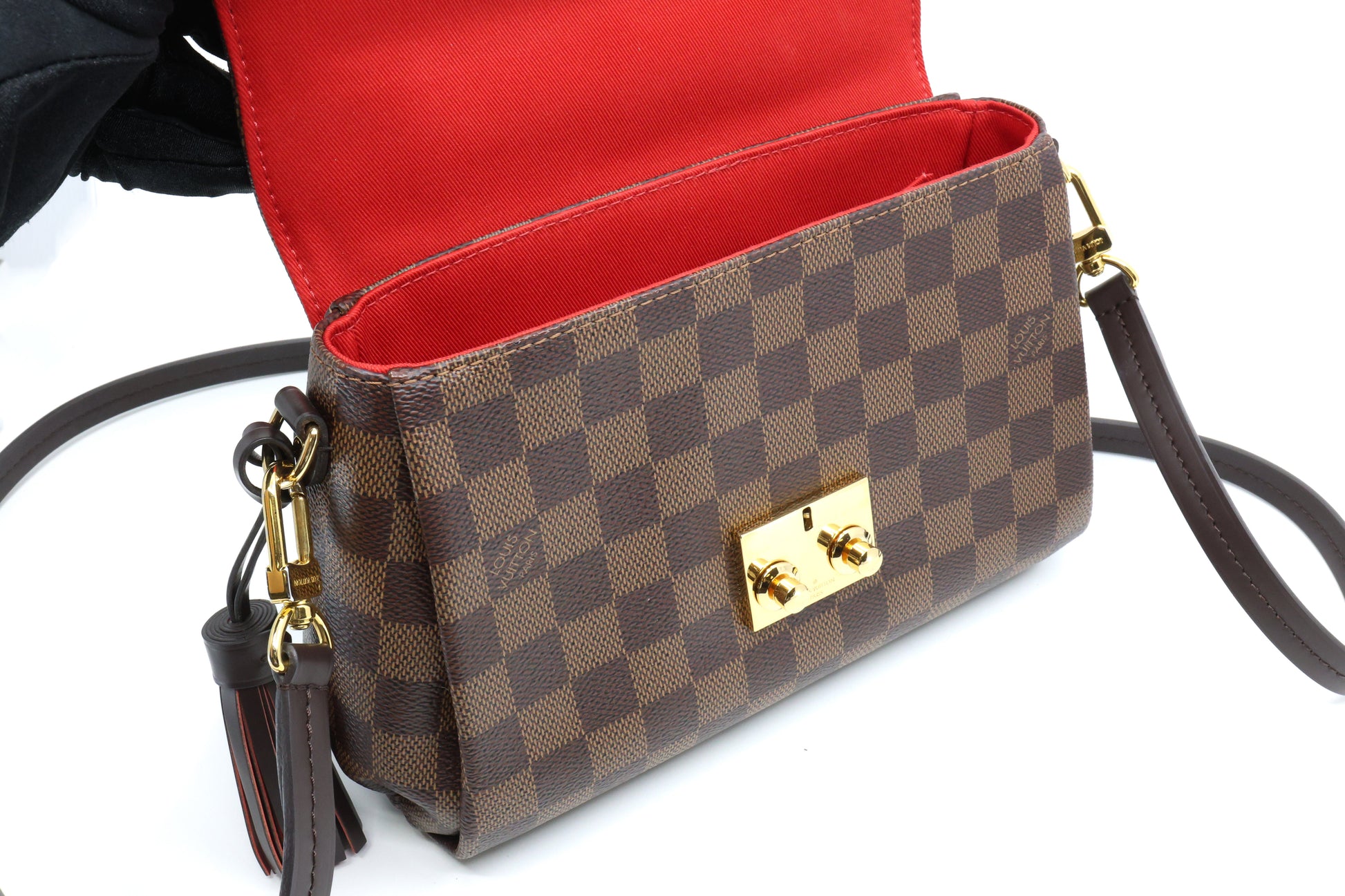 Crafted with Louis Vuitton's iconic Damier checkered canvas in brown, this pre-owned Damier Ebene Croisette features a detachable tassel and accents of ebene cowhide leather. It boasts a top handle and an optional shoulder strap, secured by a gold S-lock. The interior boasts rouge red fabric and a flat pocket for added convenience.