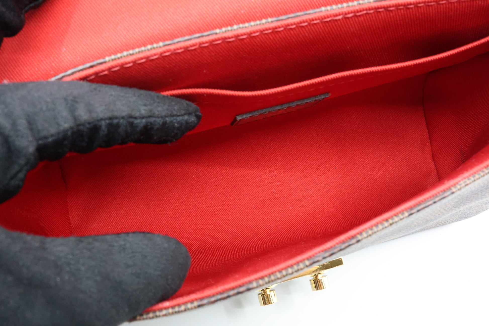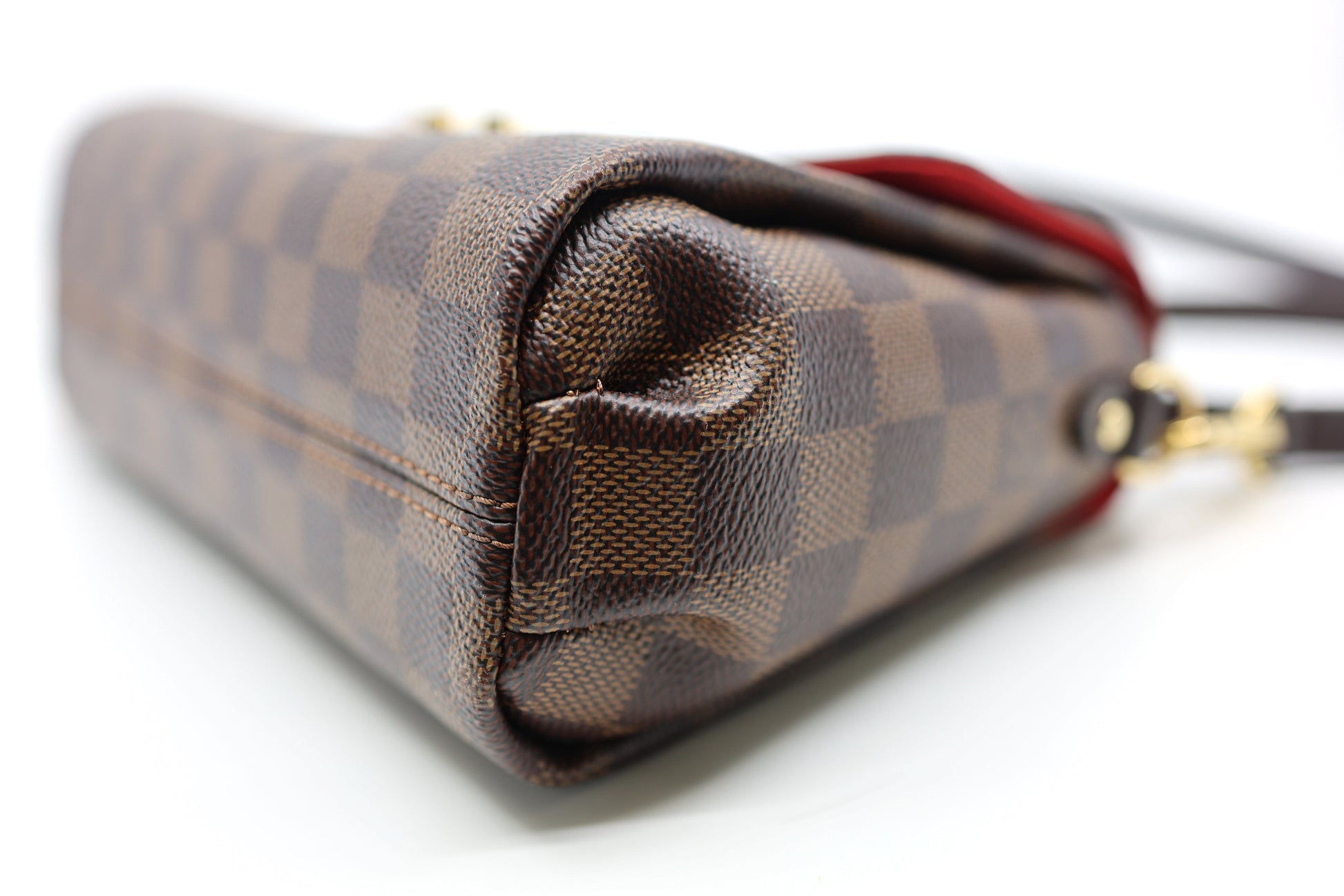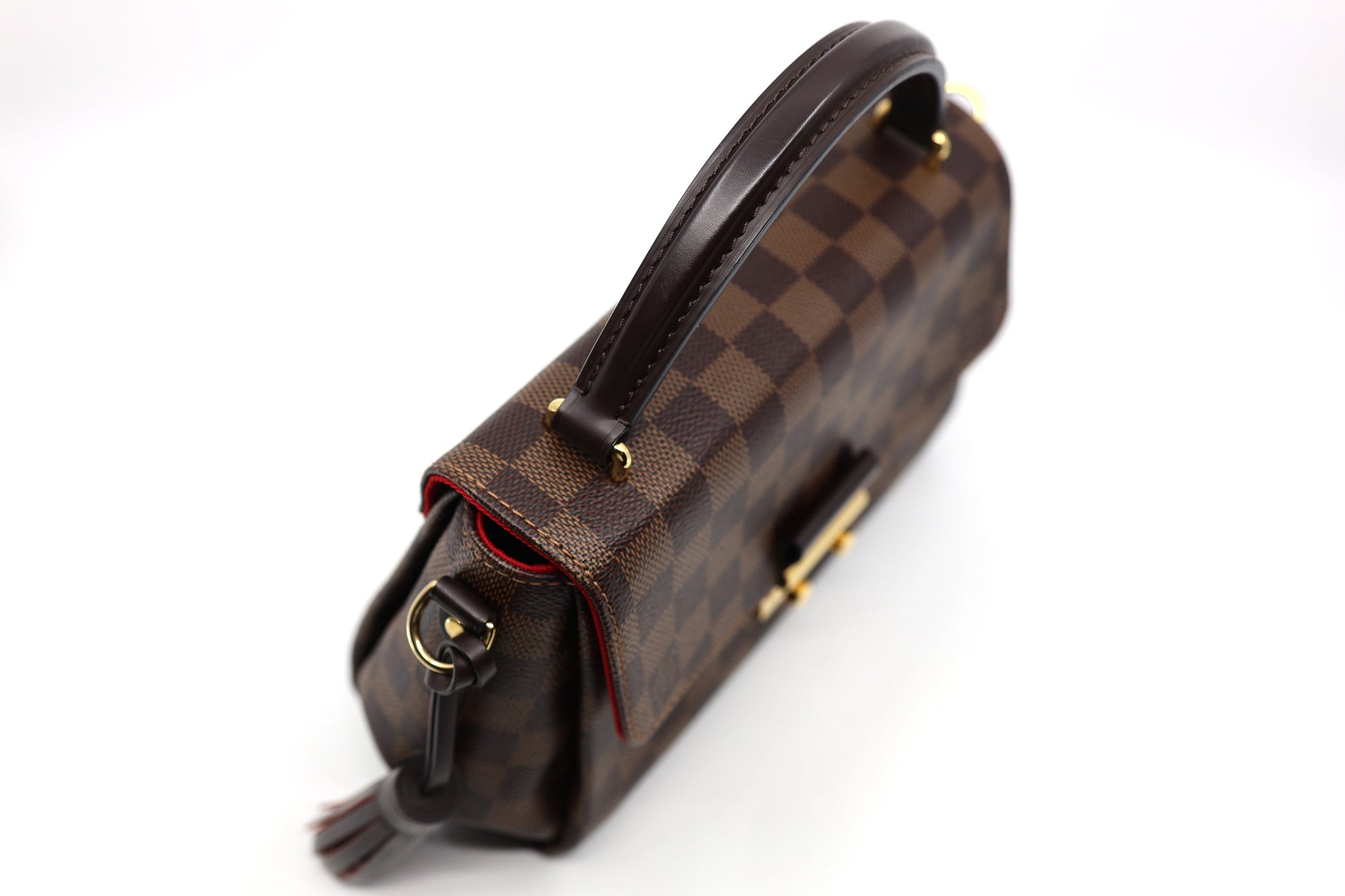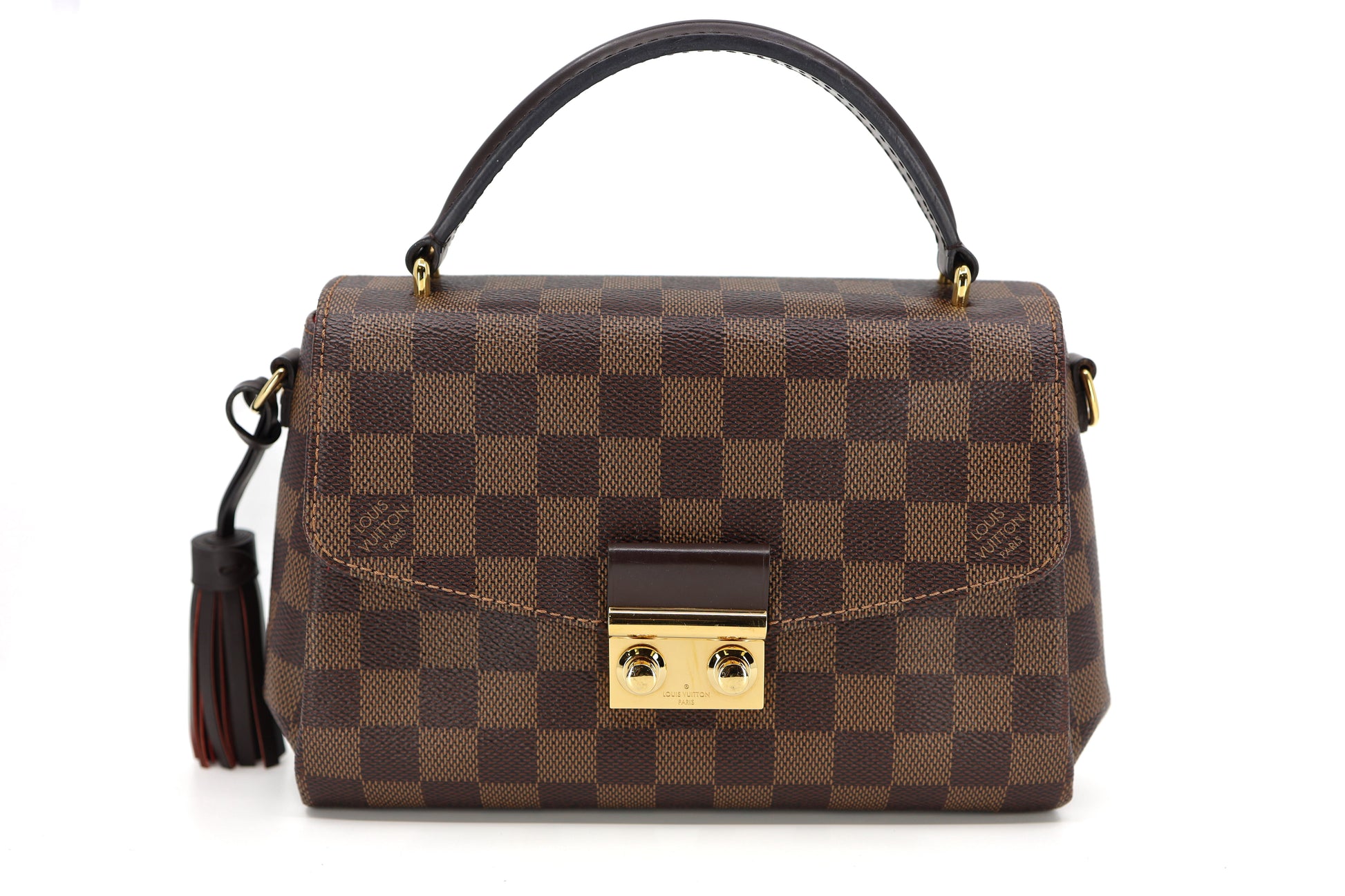 Crafted with Louis Vuitton's iconic Damier checkered canvas in brown, this pre-owned Damier Ebene Croisette features a detachable tassel and accents of ebene cowhide leather. It boasts a top handle and an optional shoulder strap, secured by a gold S-lock. The interior boasts rouge red fabric and a flat pocket for added convenience.