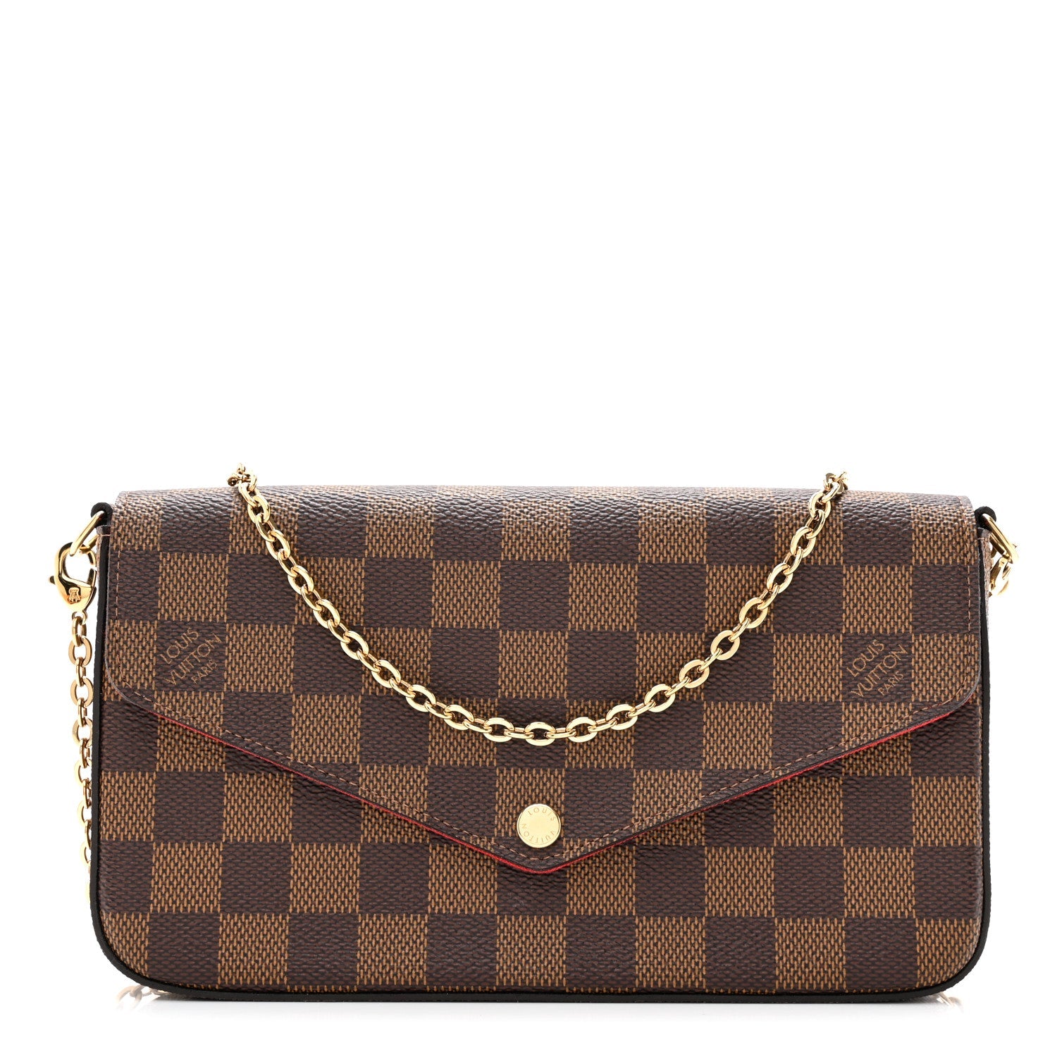 This Stylish Crossbody Pochette is crafted of classic Louis Vuitton Damier coated canvas in brown. The wallet features an optional polished brass chain-link shoulder strap and an envelope-style crossover flap with a matching brass snap that opens to a red fabric interior with a patch pocket and 2 removable inserts.