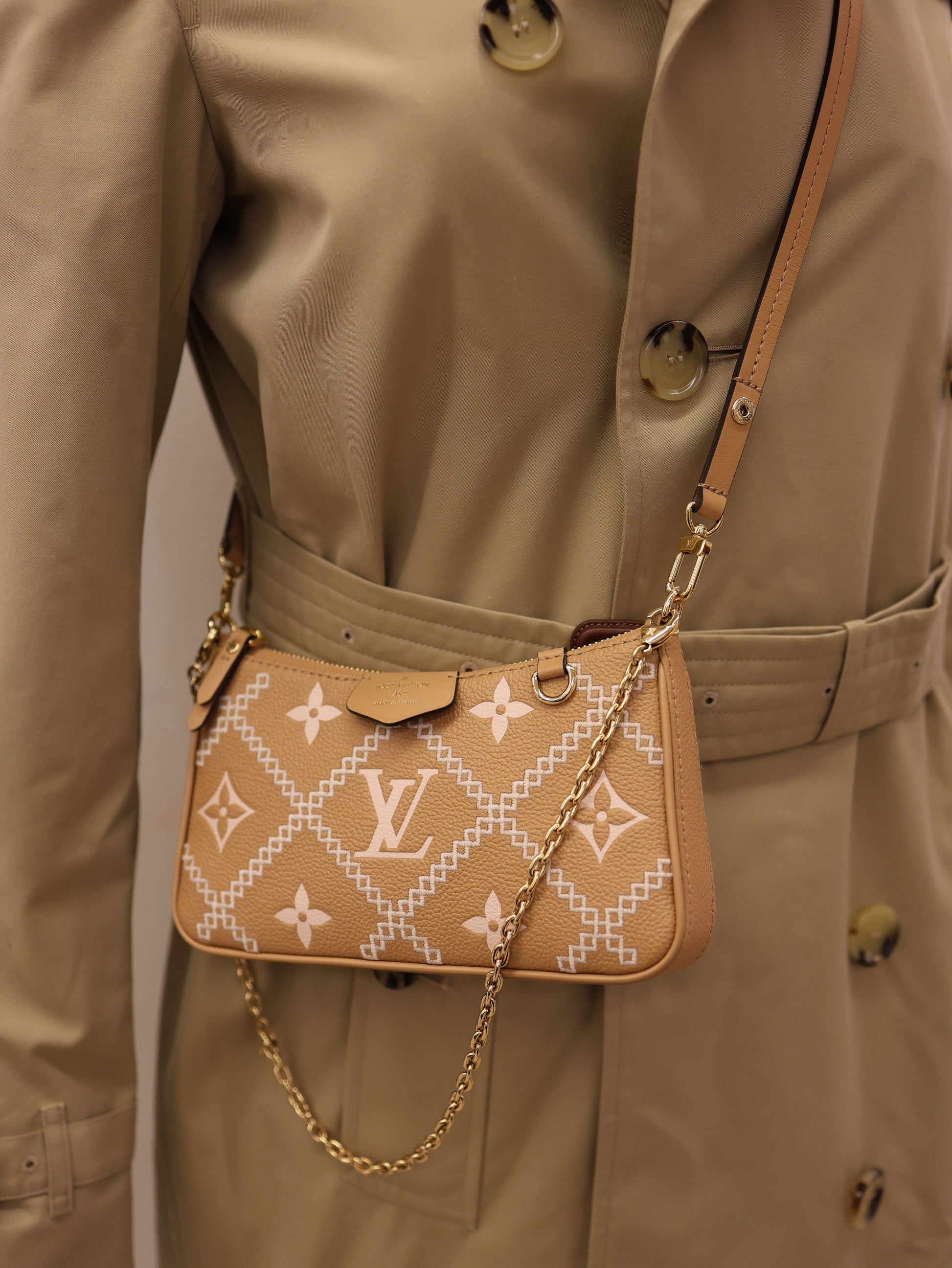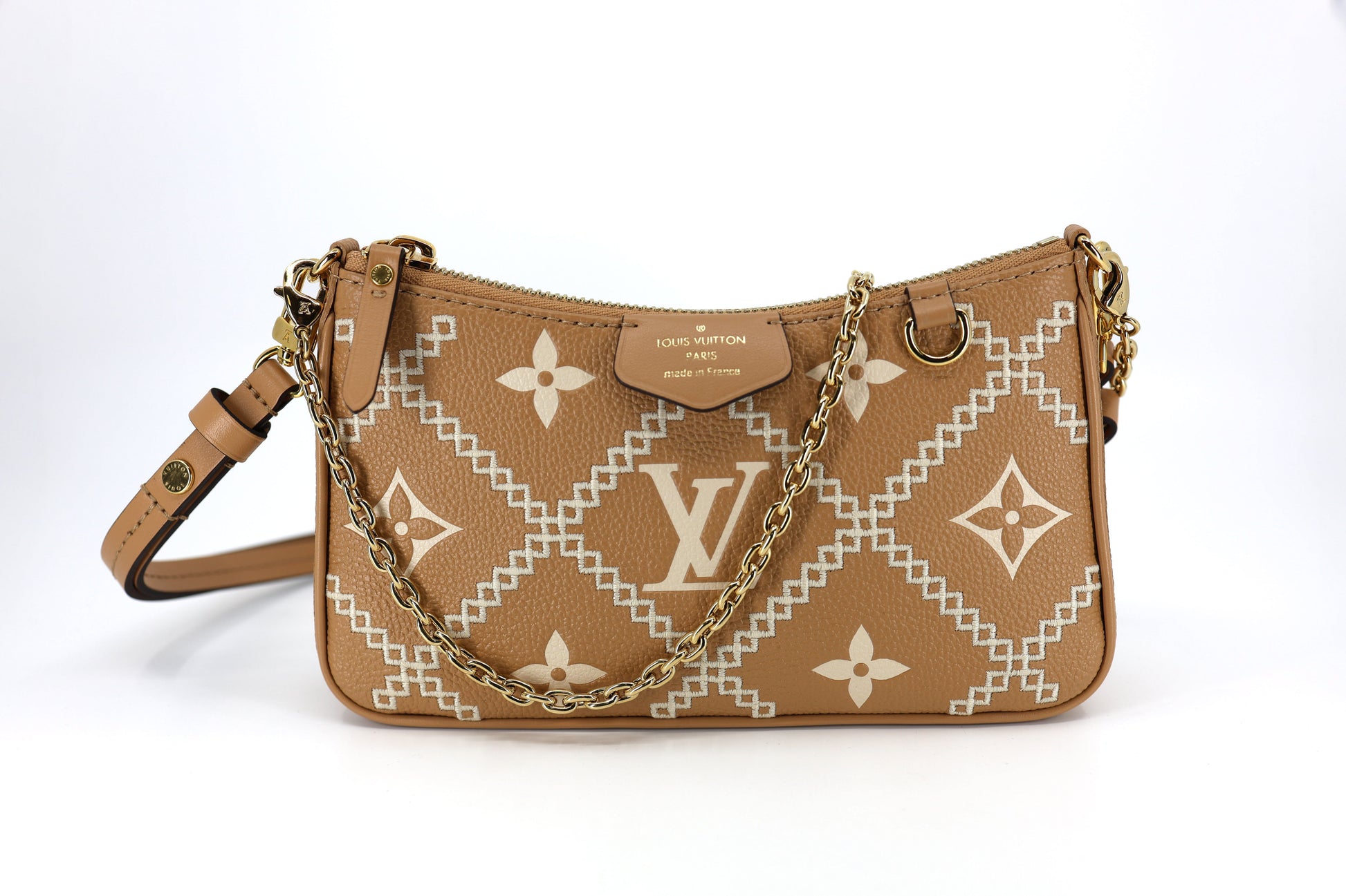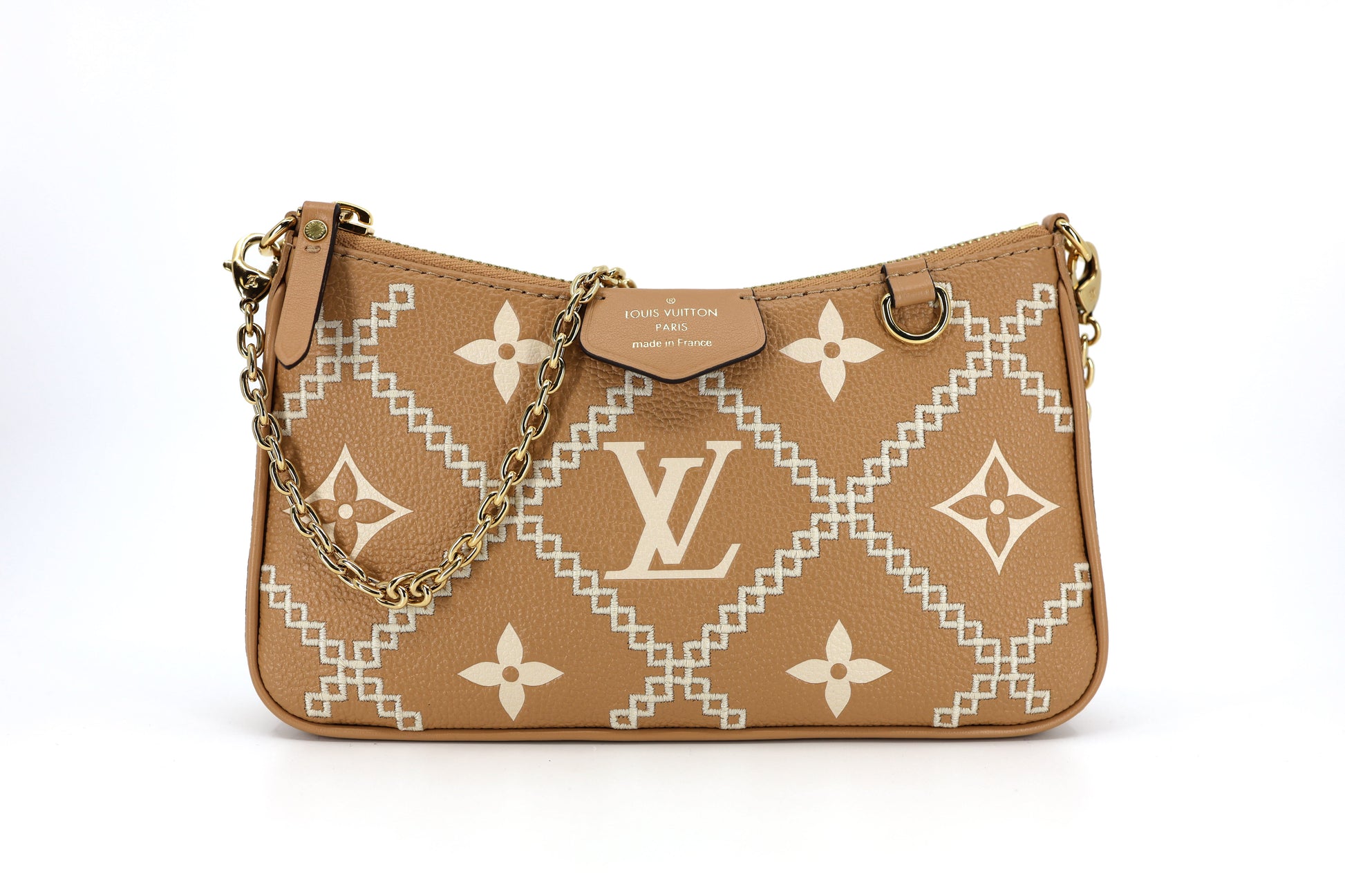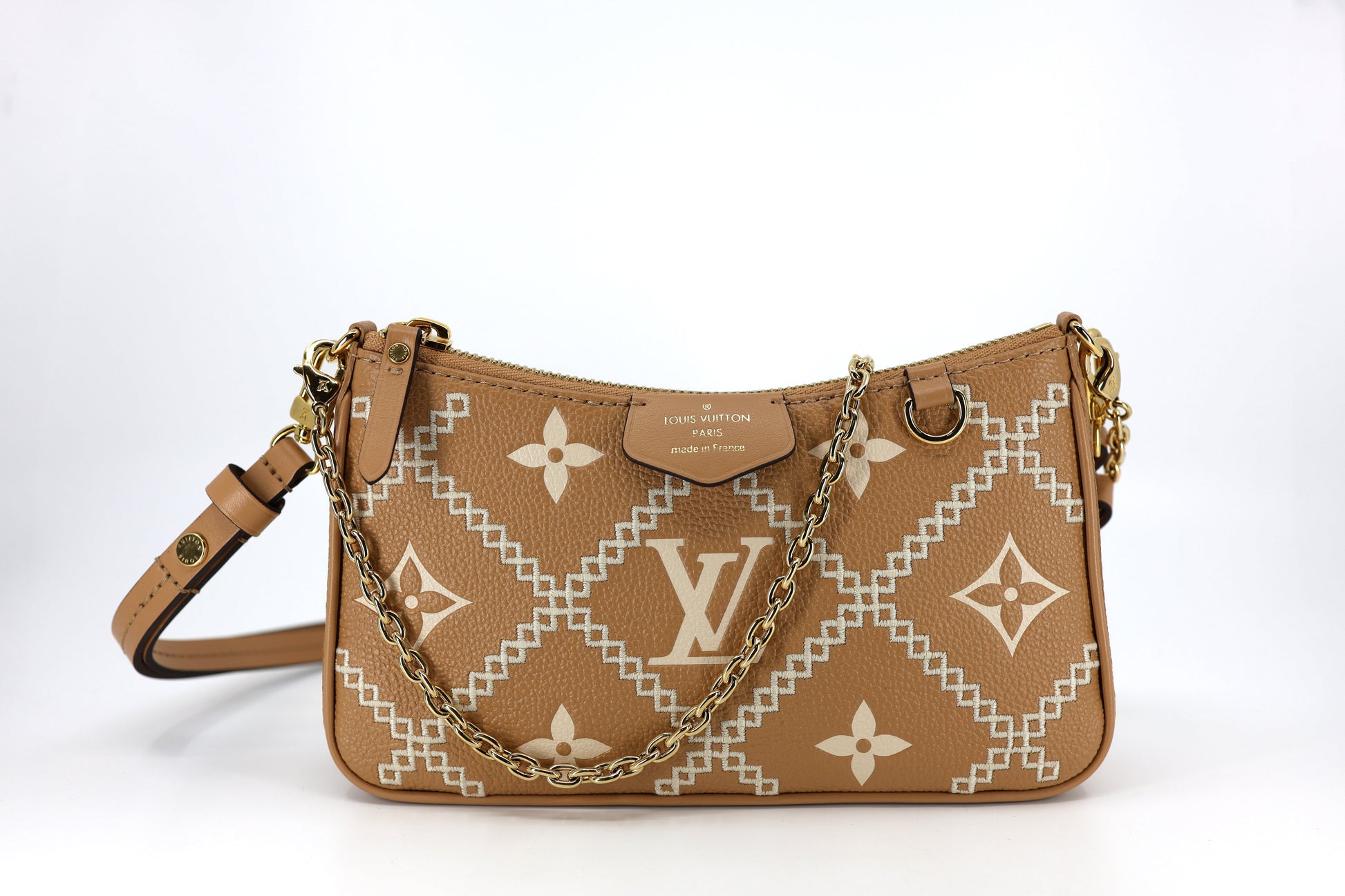 Introducing the luxurious Louis Vuitton Easy Pouch On Strap Arizona, crafted with monogram Empreinte Giant Broderies material. This highly sought-after handbag is made with calfskin leather and showcases a stylish Louis Vuitton monogram in beige along with exquisite diamond stitching. With an adjustable leather strap and removable gold chain strap, this handbag offers versatility and convenience. The elegant design opens to reveal a soft beige microfiber interior.