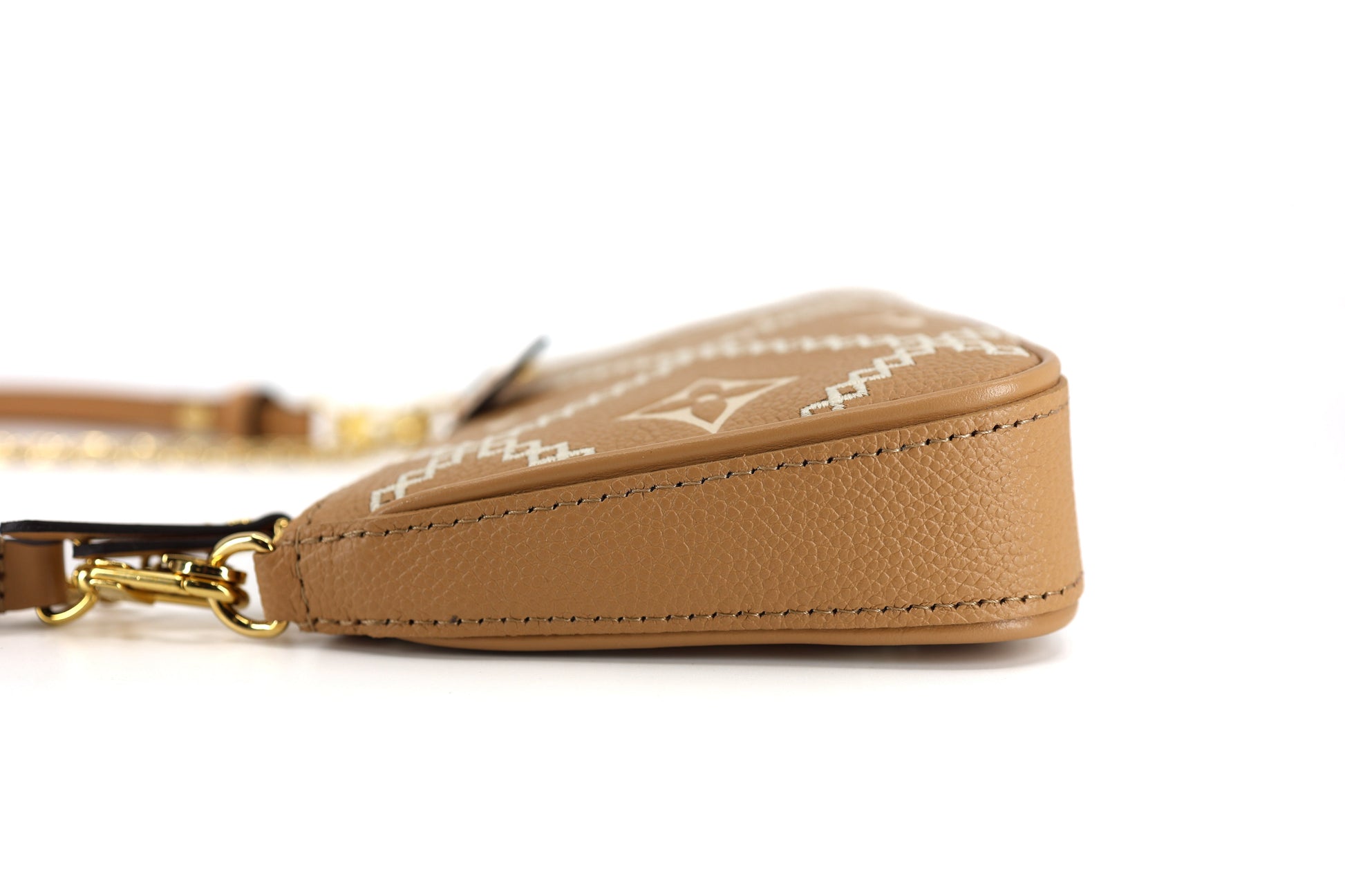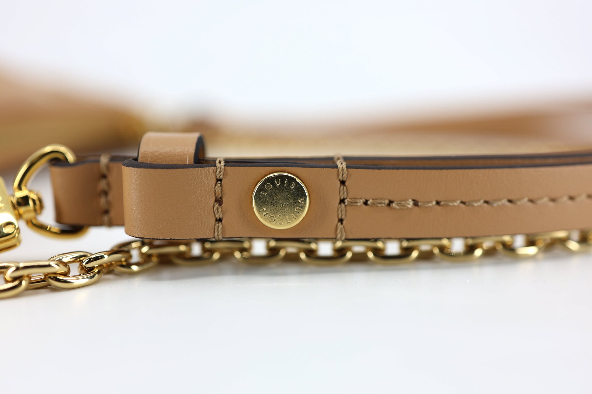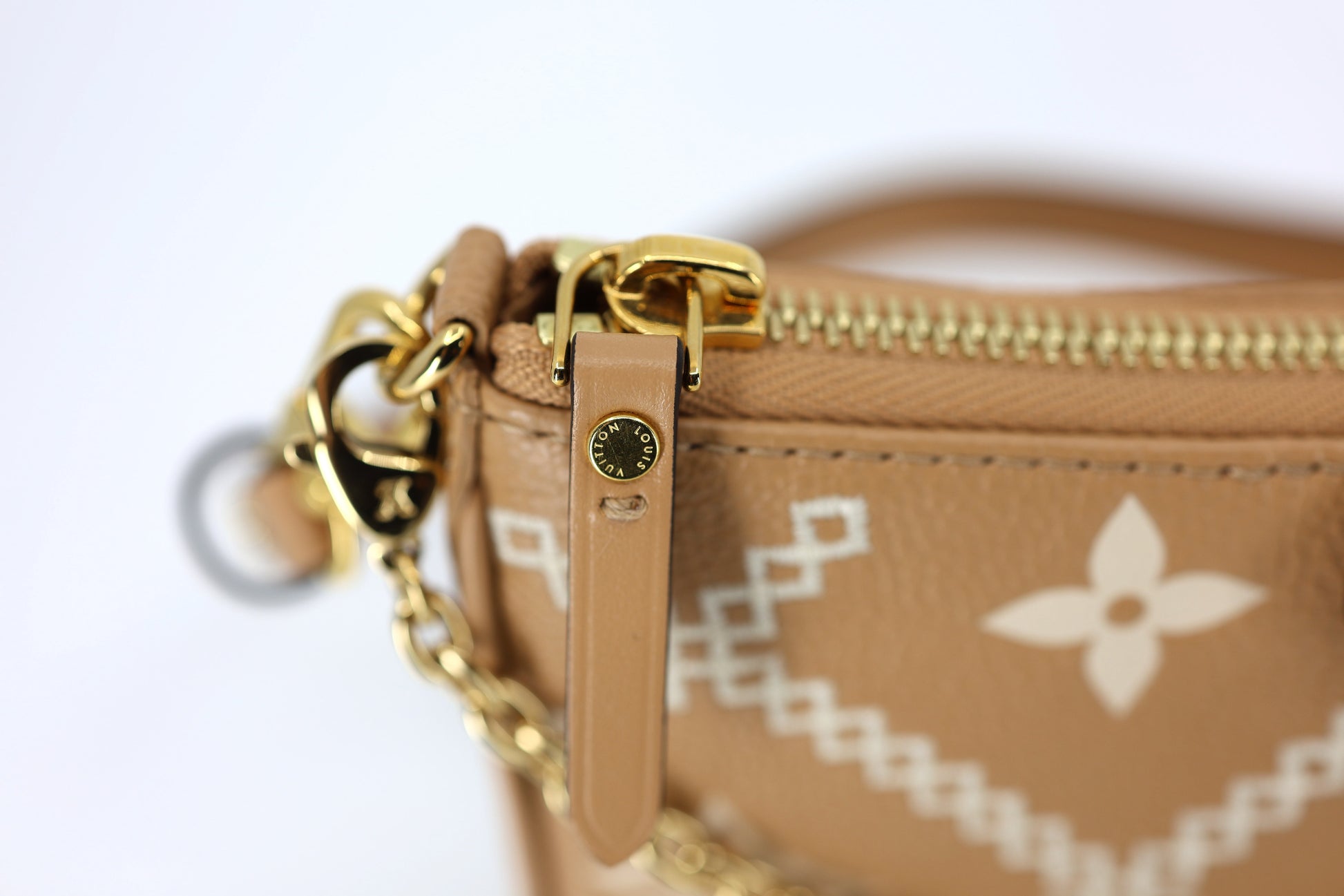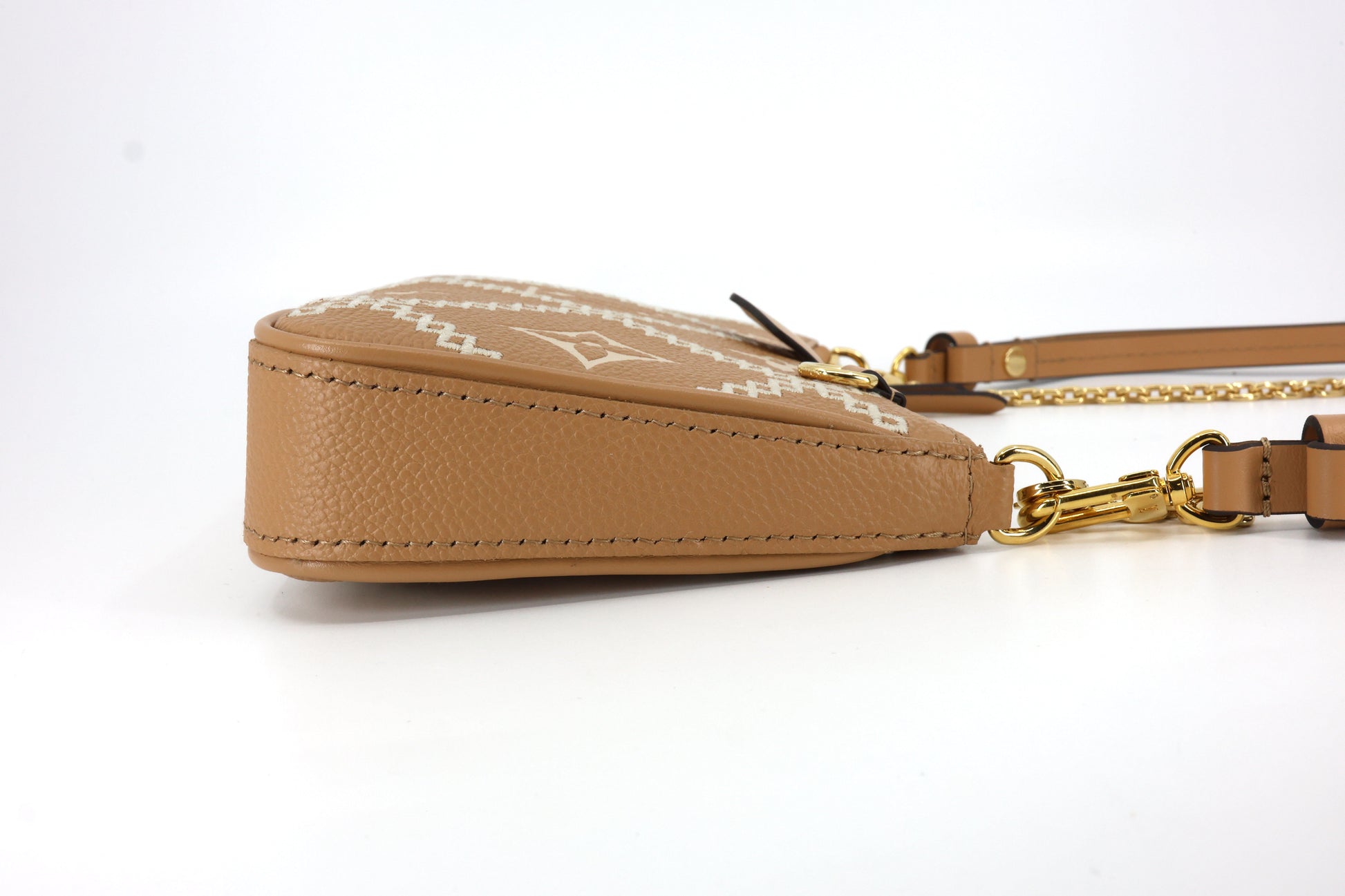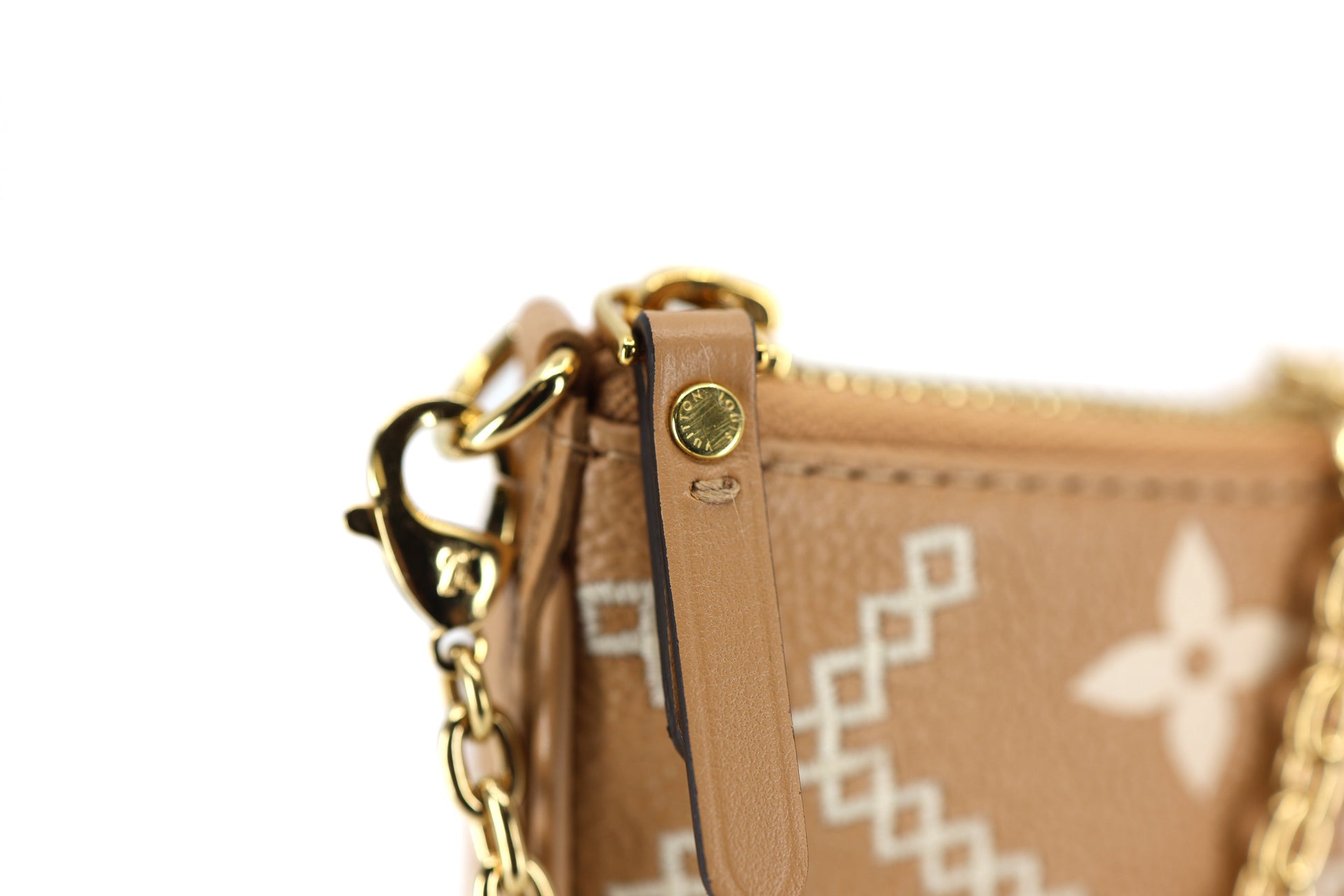 Introducing the luxurious Louis Vuitton Easy Pouch On Strap Arizona, crafted with monogram Empreinte Giant Broderies material. This highly sought-after handbag is made with calfskin leather and showcases a stylish Louis Vuitton monogram in beige along with exquisite diamond stitching. With an adjustable leather strap and removable gold chain strap, this handbag offers versatility and convenience. The elegant design opens to reveal a soft beige microfiber interior.