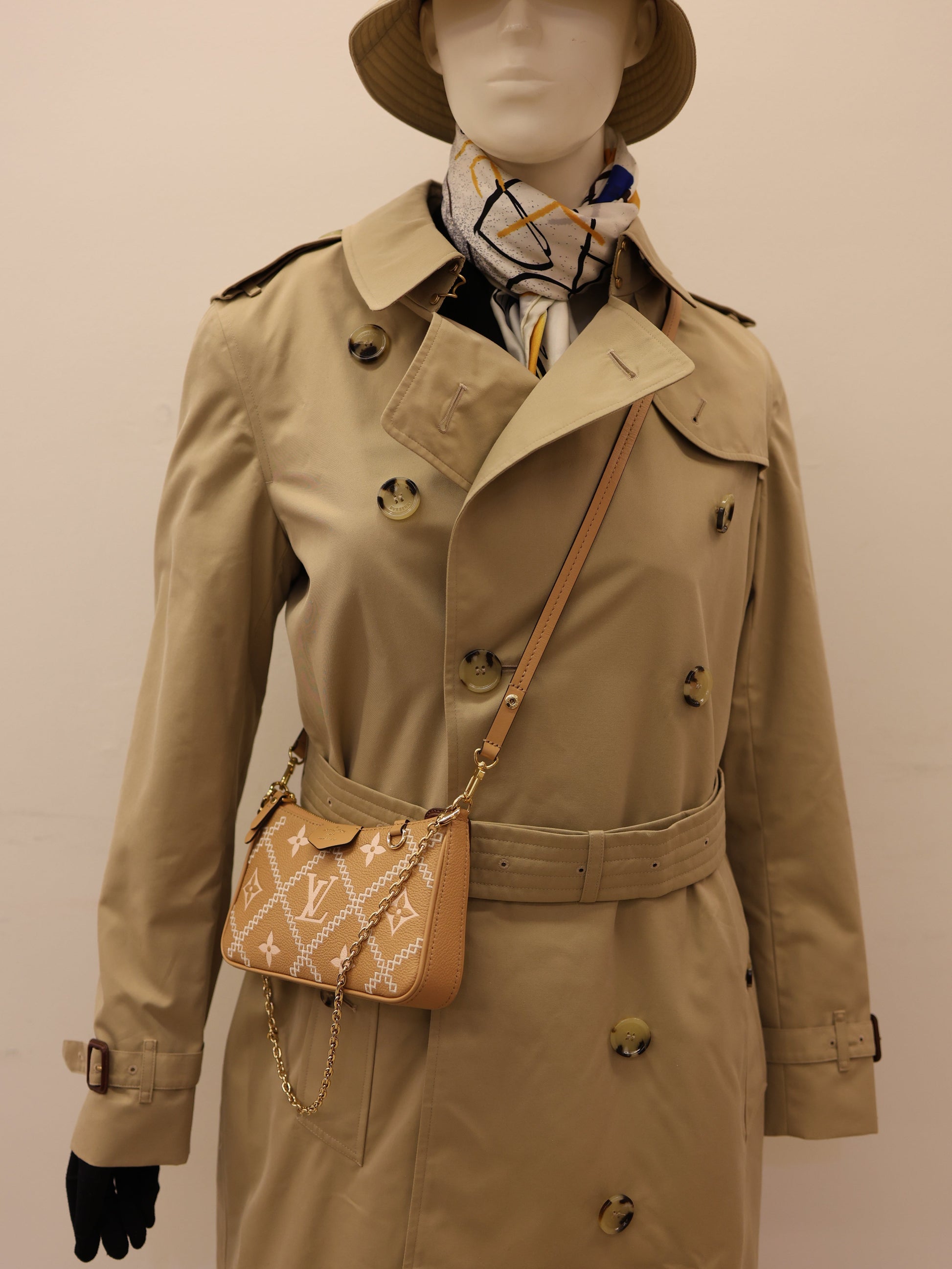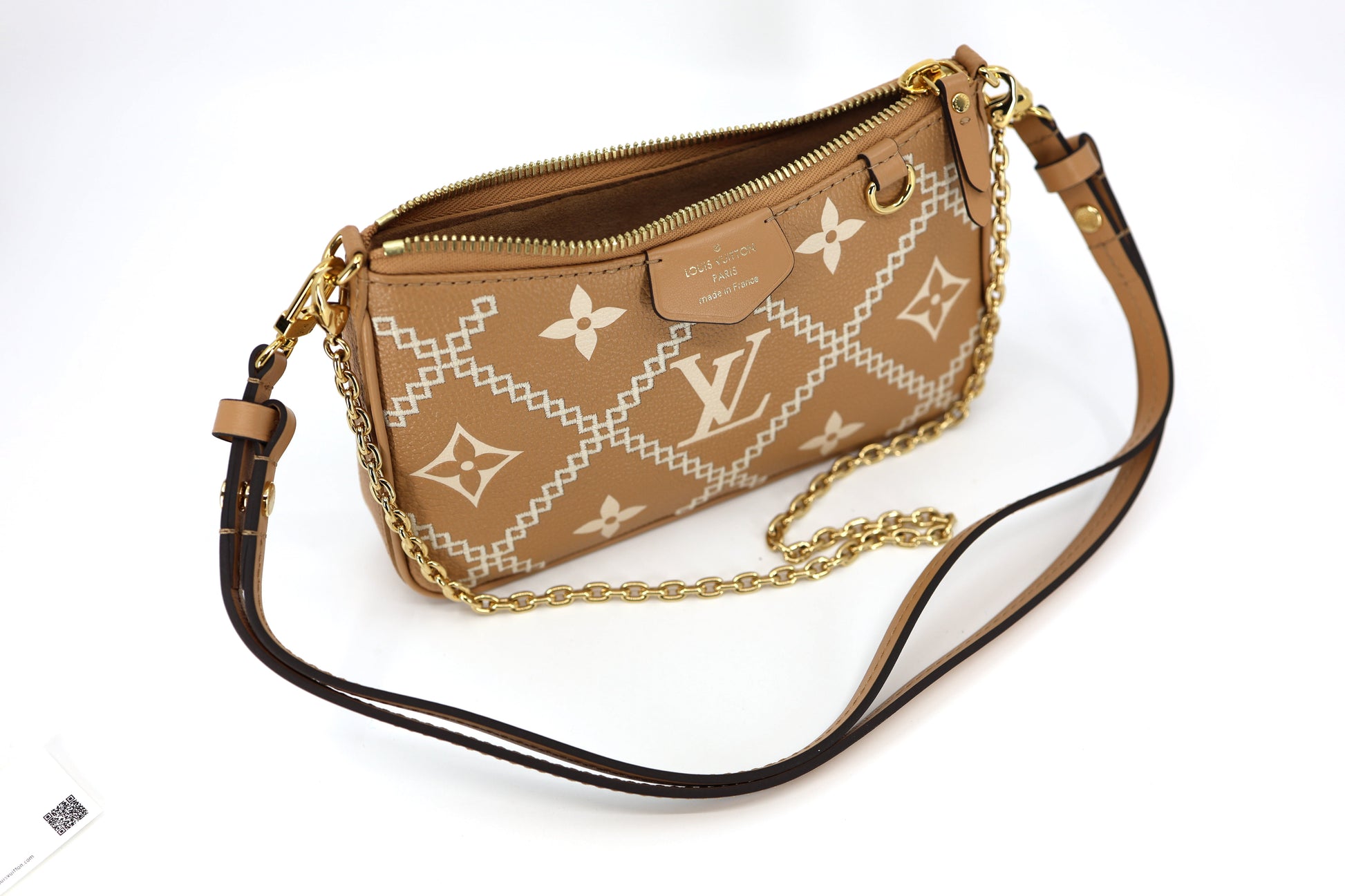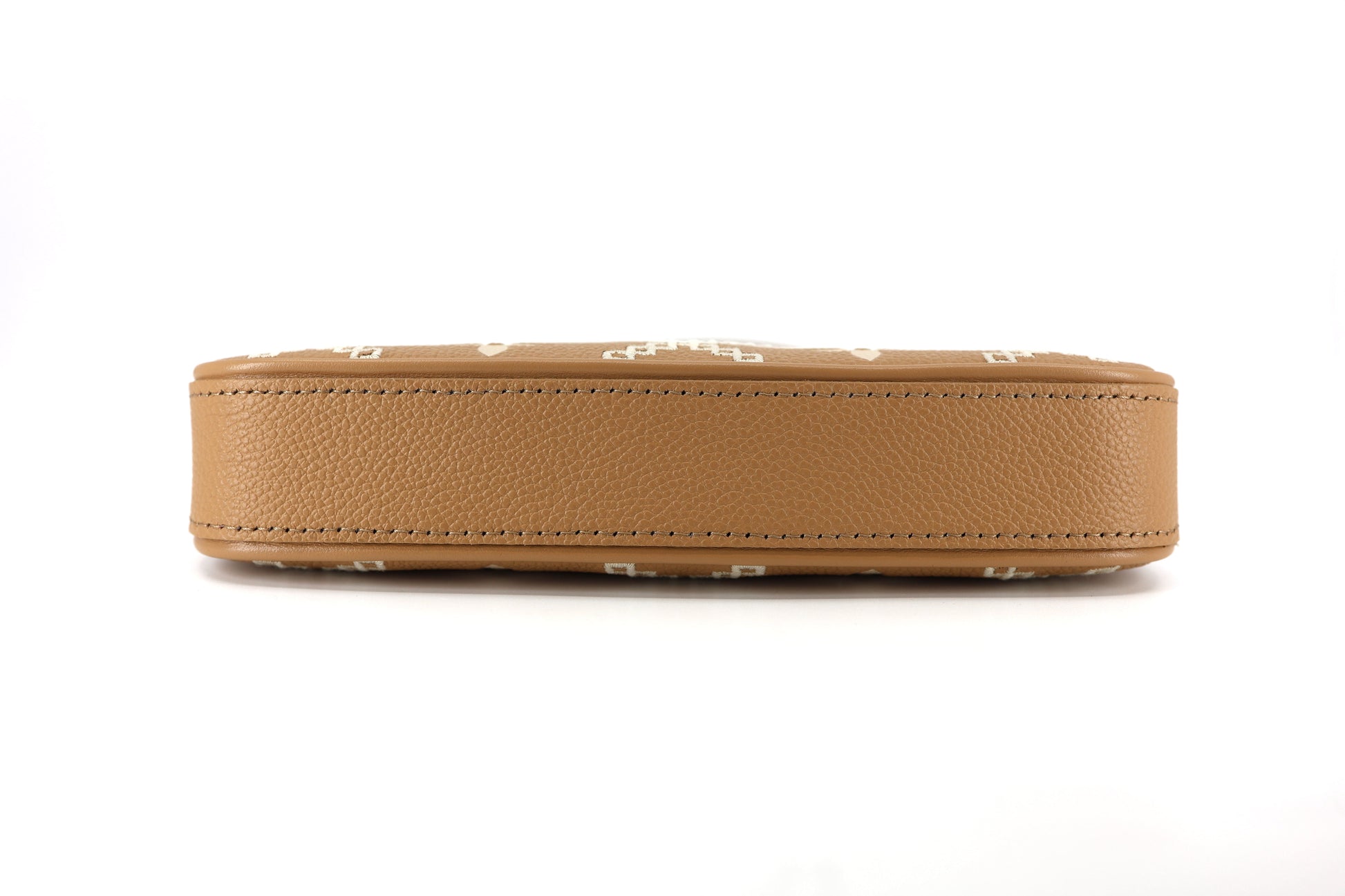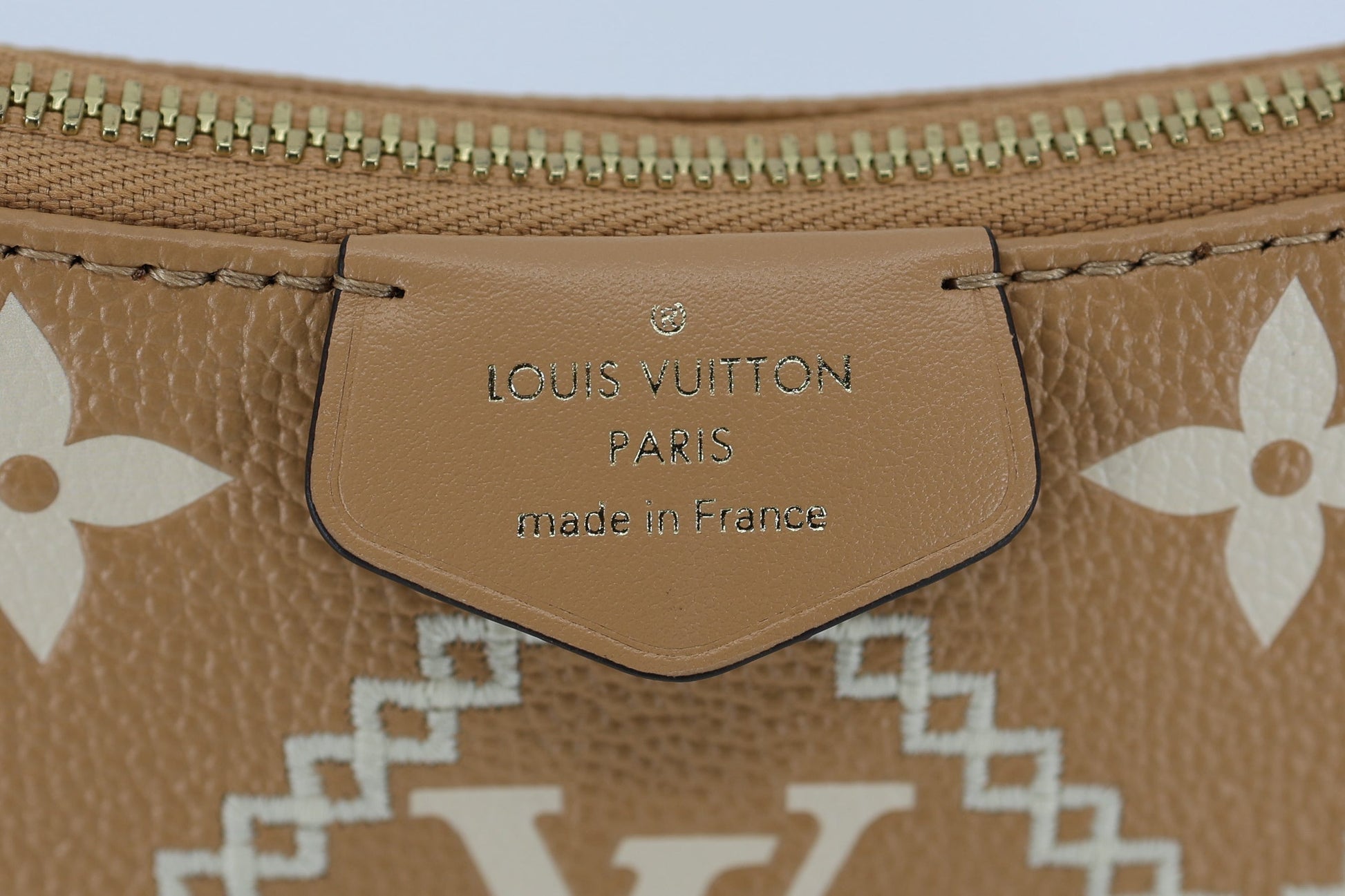 Introducing the luxurious Louis Vuitton Easy Pouch On Strap Arizona, crafted with monogram Empreinte Giant Broderies material. This highly sought-after handbag is made with calfskin leather and showcases a stylish Louis Vuitton monogram in beige along with exquisite diamond stitching. With an adjustable leather strap and removable gold chain strap, this handbag offers versatility and convenience. The elegant design opens to reveal a soft beige microfiber interior.