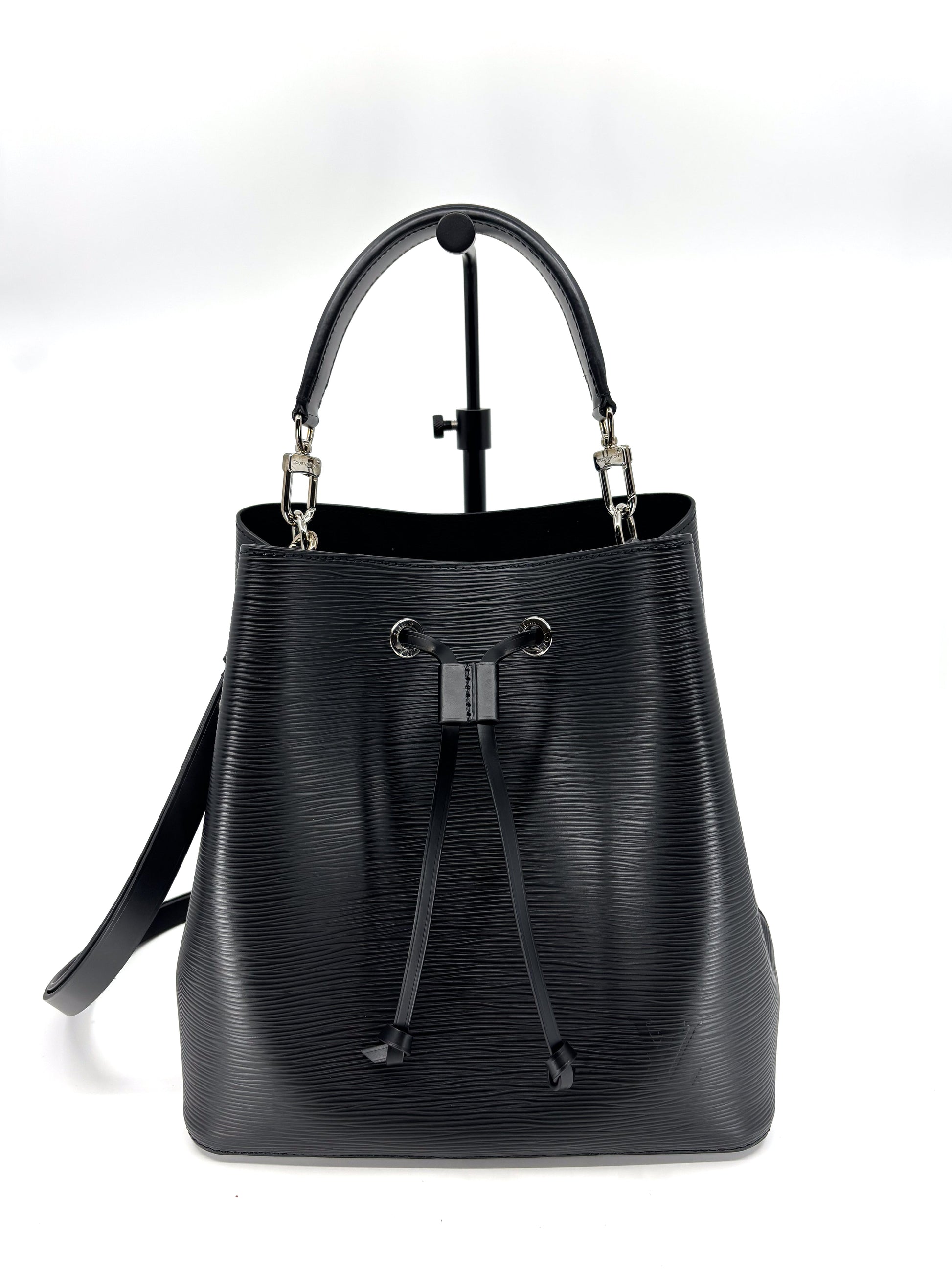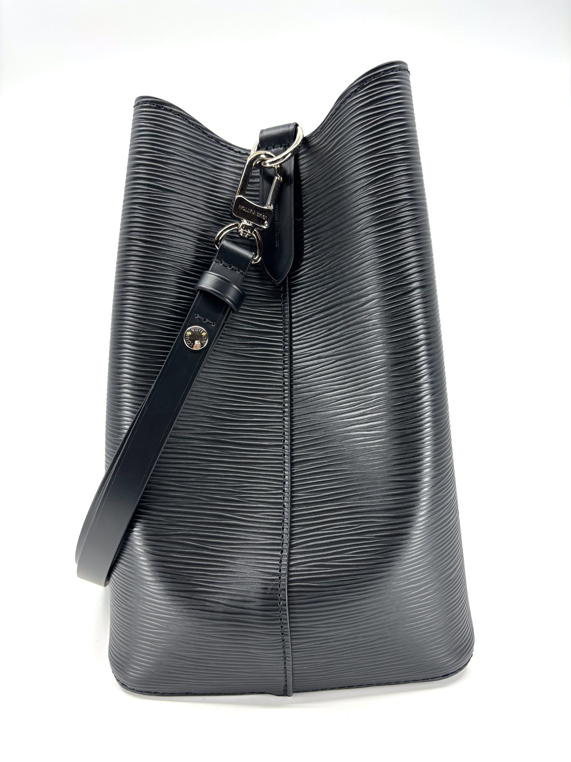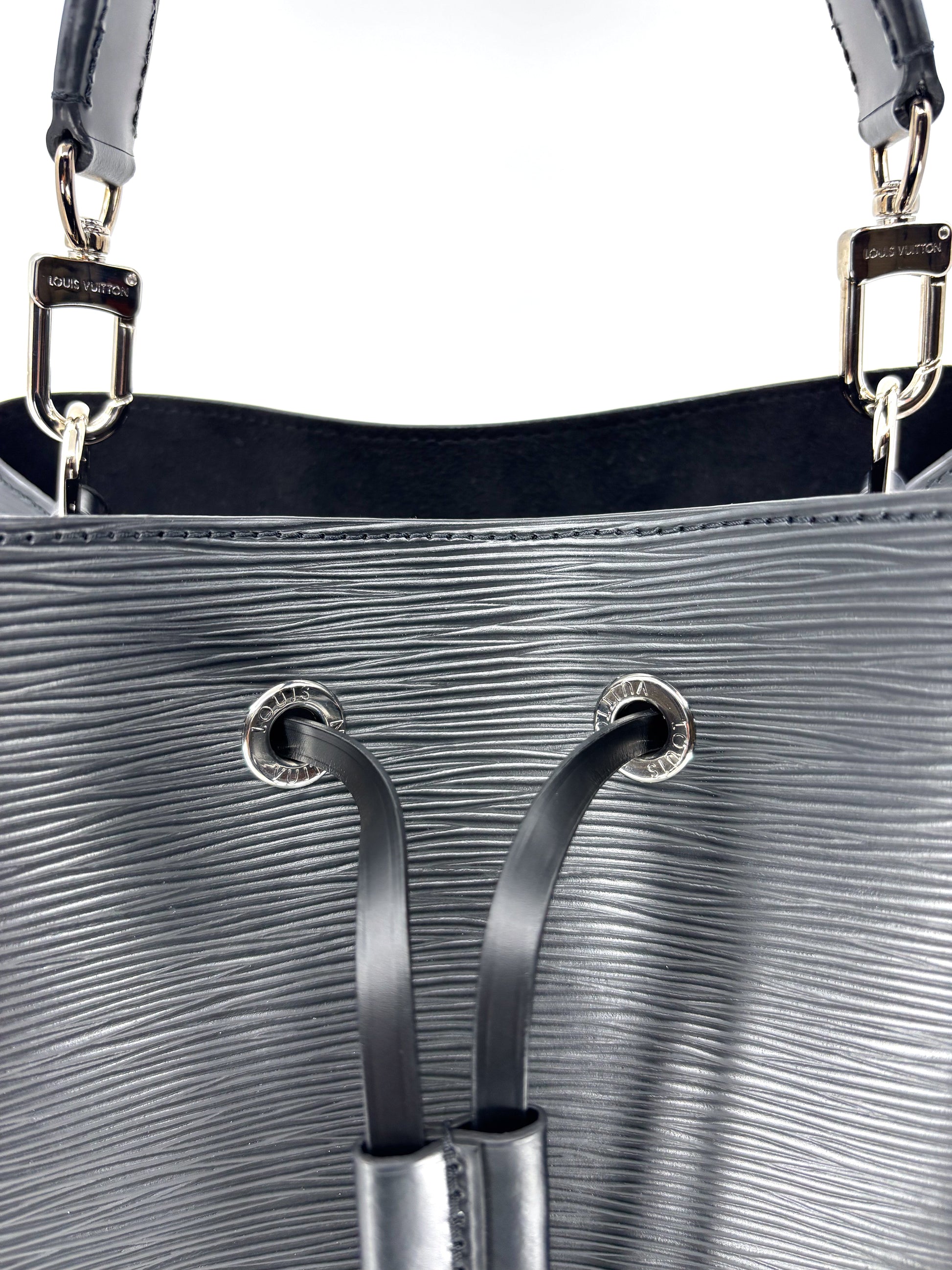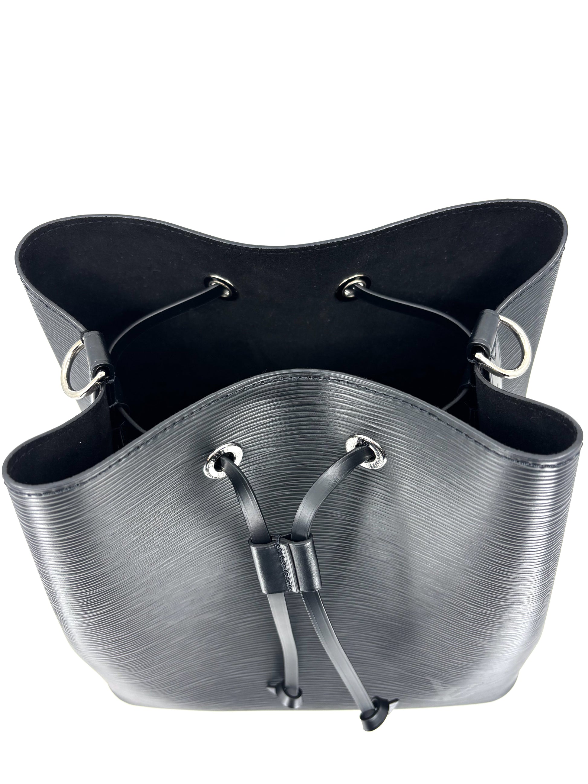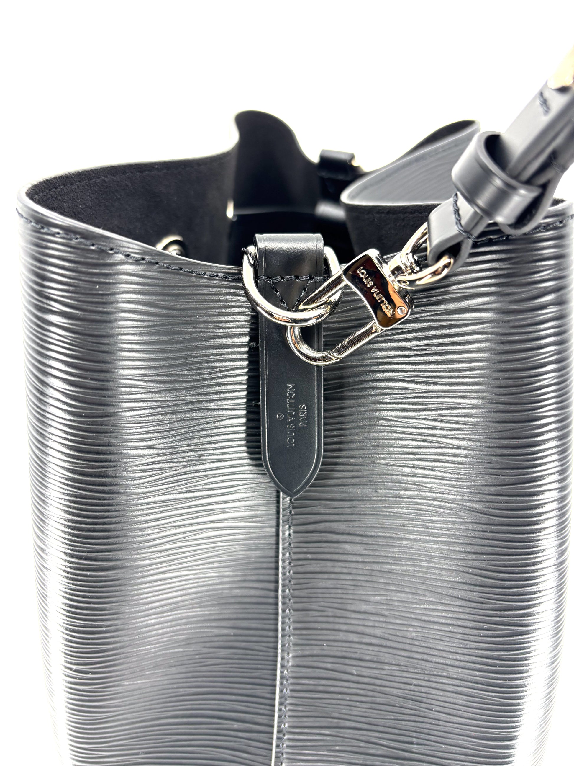 This is an pre-loved Louis Vuitton Epi Neonoe Black. Crafted from luxurious black Louis Vuitton epi leather, this shoulder bag boasts a classic bucket style design. Equipped with a removable shoulder strap, an optional top handle, and top cinch strap, it is finished with sleek silver hardware. The soft black microfiber interior includes a central zipper compartment.