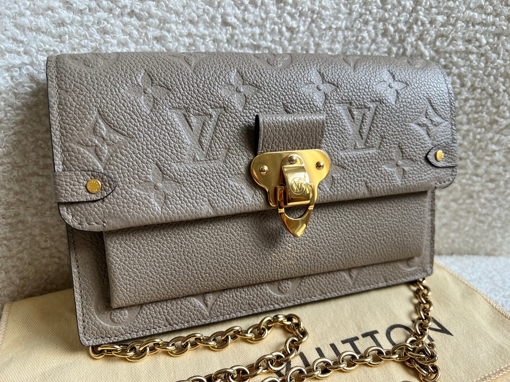 Louis Vuitton Vavin Wallet on Chain in Grey Monogram Empreinte with gold hardware. Reasonable in size for a WOC and both sophisticated and classy. Perfect for evening or event wear. The front pocket, fits a phone, while the inside pockets hold all the essentials. Featuring LV trunk inspired lock closure. Can be worn over shoulder or cross body.