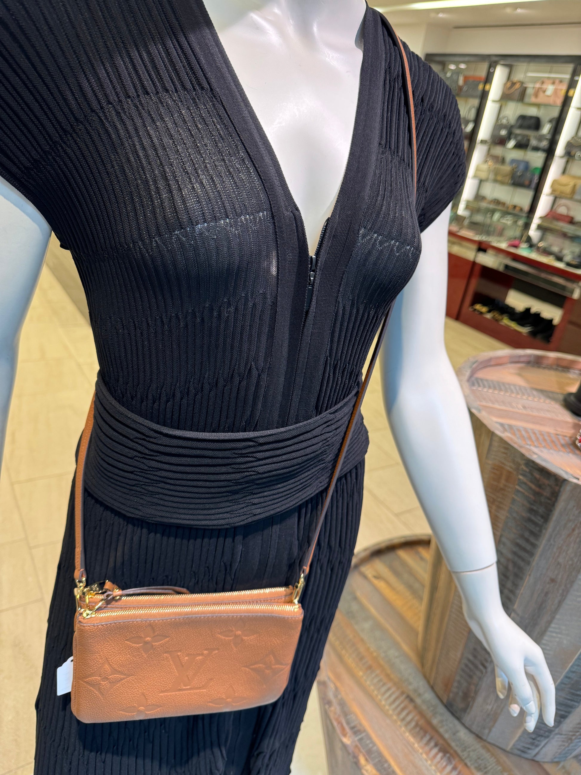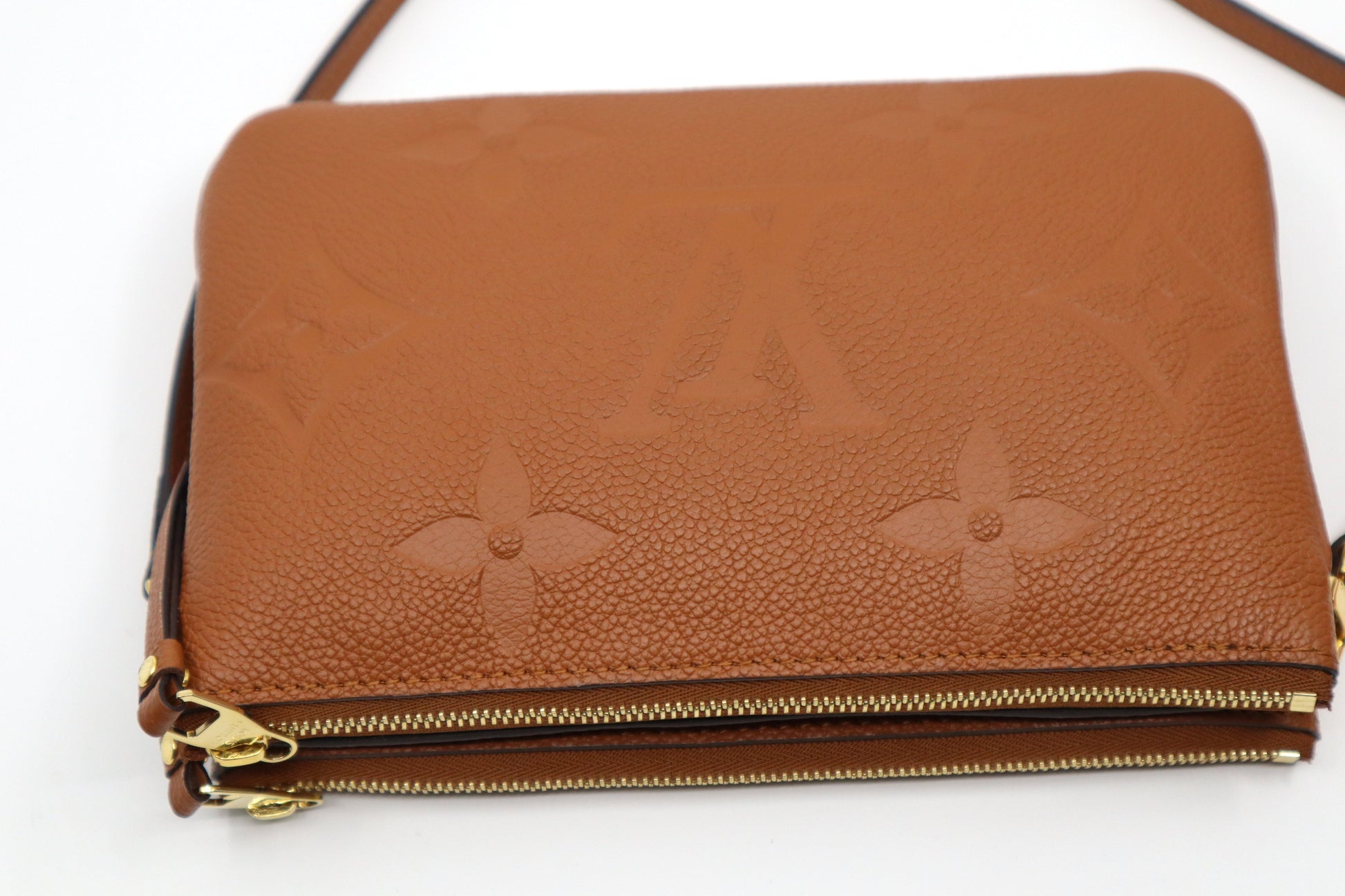 This is an pre-loved Louis Vuitton Empreinte Monogram Giant Double Zip Pochette in Caramel.