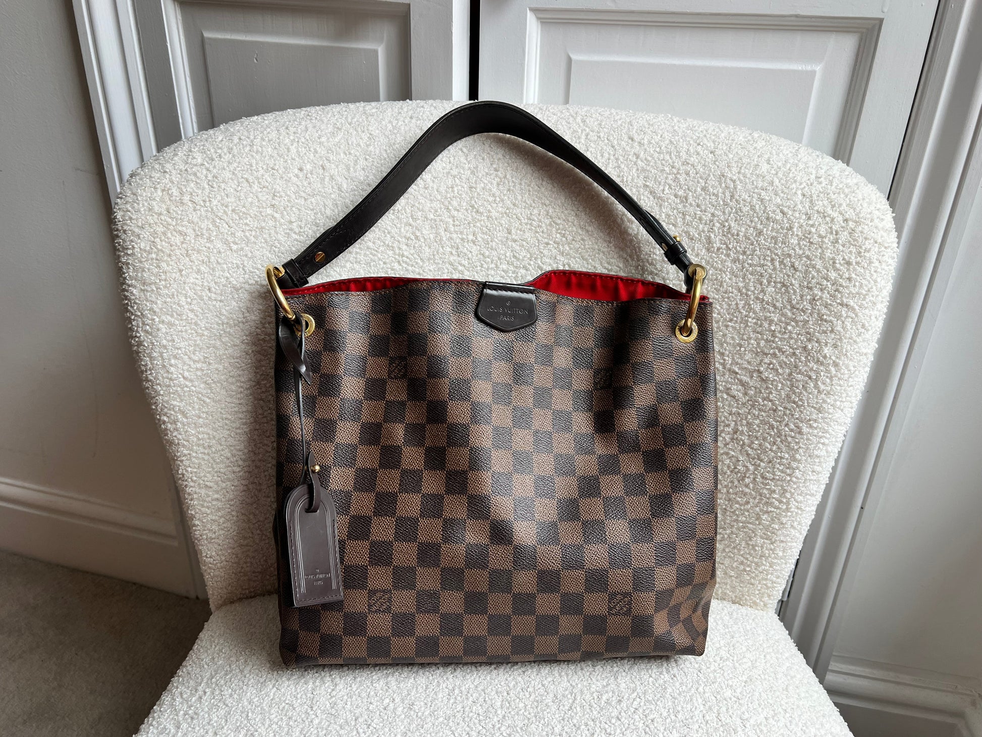 Louis Vuitton Graceful PM in Damier Ebene canvas with gold hardware. This classic Damier ebene hobo style shoulder bag has a slouchy slightly shape and is reasonable in size. Perfect for day to day use as it is also very lightweight for its size. This highly sought after style is often sold out online and in store. Can be worn in the crook of the arm or over the shoulder comfortably using the flat handle. Closure by magnetic tab at the opening.