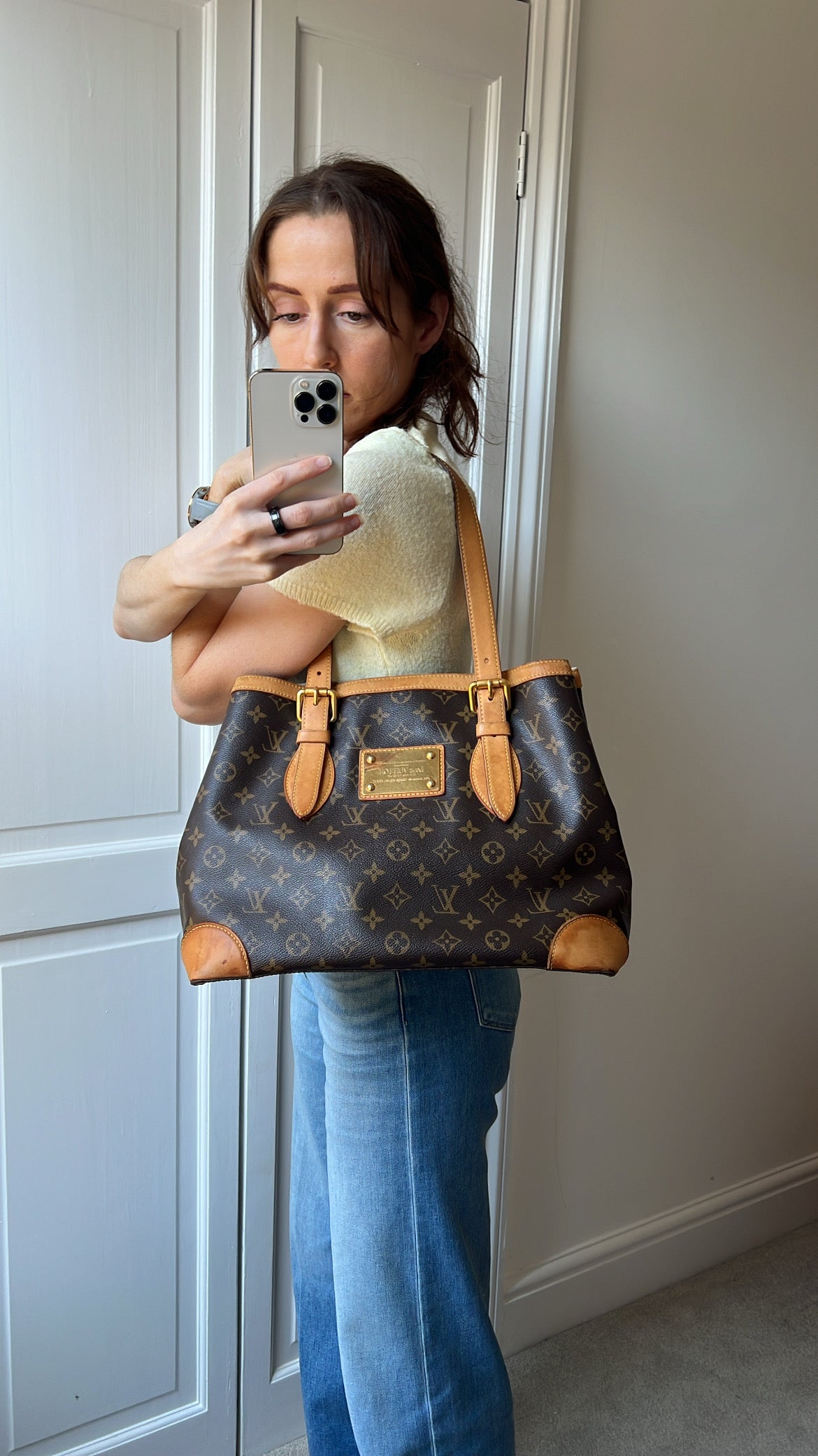Louis Vuitton Hampstead MM in Monogram with gold hardware. This roomy, slightly slouchy tote style is ideal for day to day use and has clip closure. Can be carried over shoulder or in the crook of the arm with two leather adjustable leather straps. This style is now discontinued.