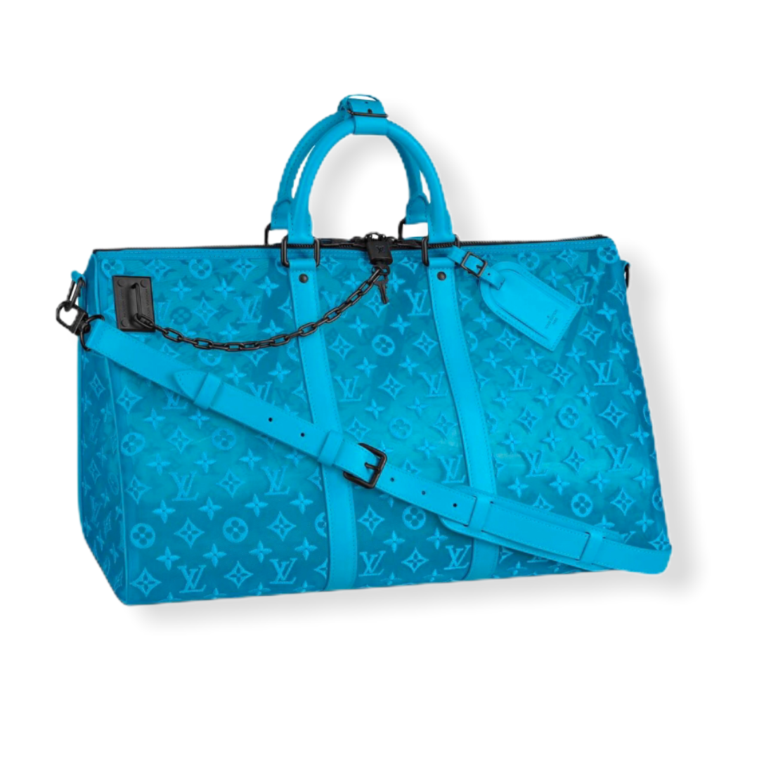 Part of the mens SS2020 Louis Vuitton show, this triangle shaped Keepall is inspired by the Sac Tricot bag, introduced in 1934. It's modern counterpart is made from turquoise mesh, embroidered with the iconic Louis Vuitton monogram.