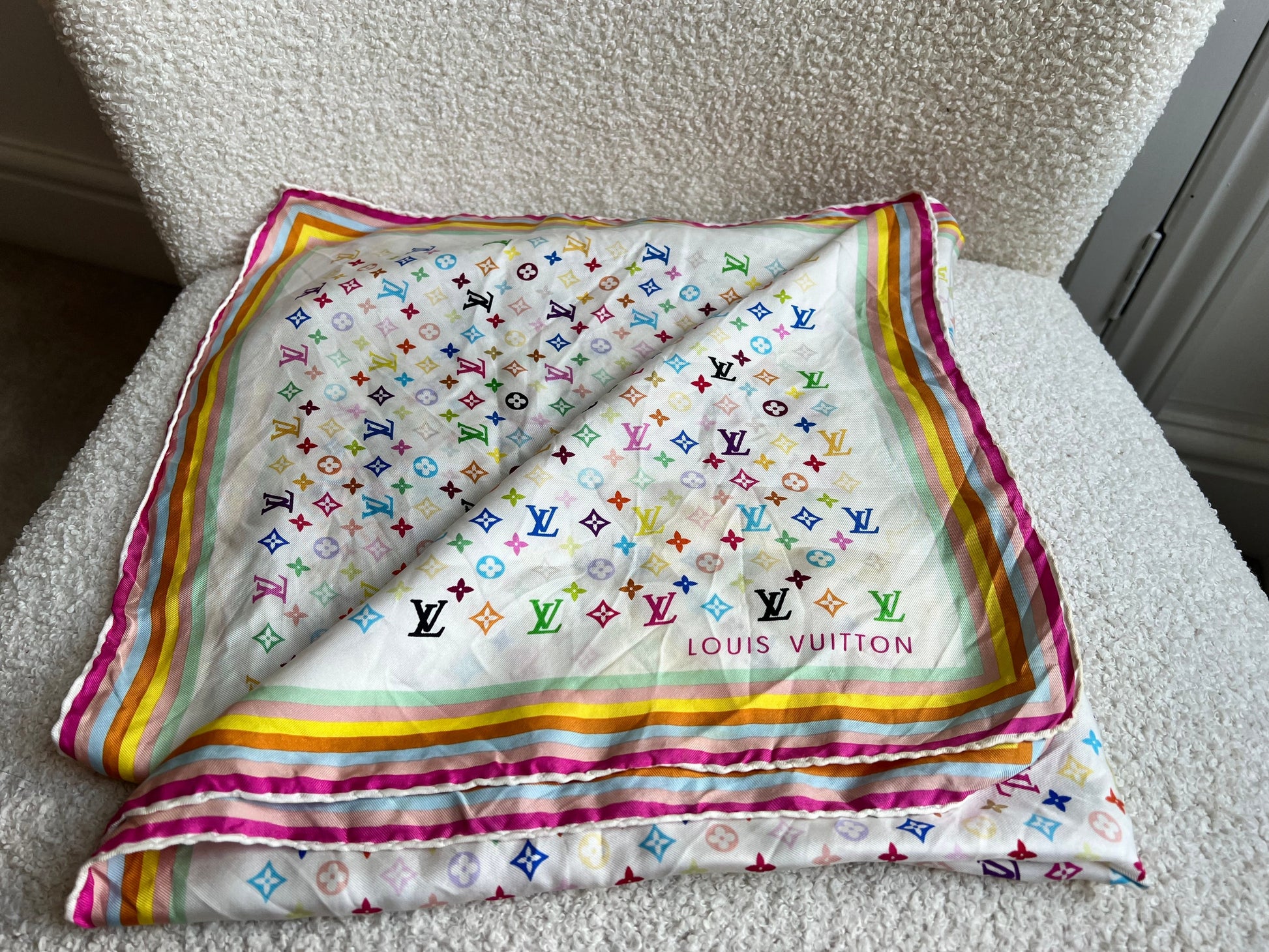 Louis Vuitton Takashi Murakami Silk square. This sumptuous accessory is spun from lustrous pure silk and is printed with Murakami’s reinterpretation of the signature LV pattern. Rendered in a vibrant palette of 33 high-definition hues, the motifs stand out brilliantly against a pristine white background.This stylish accessory can be worn around the neck, or hair.
