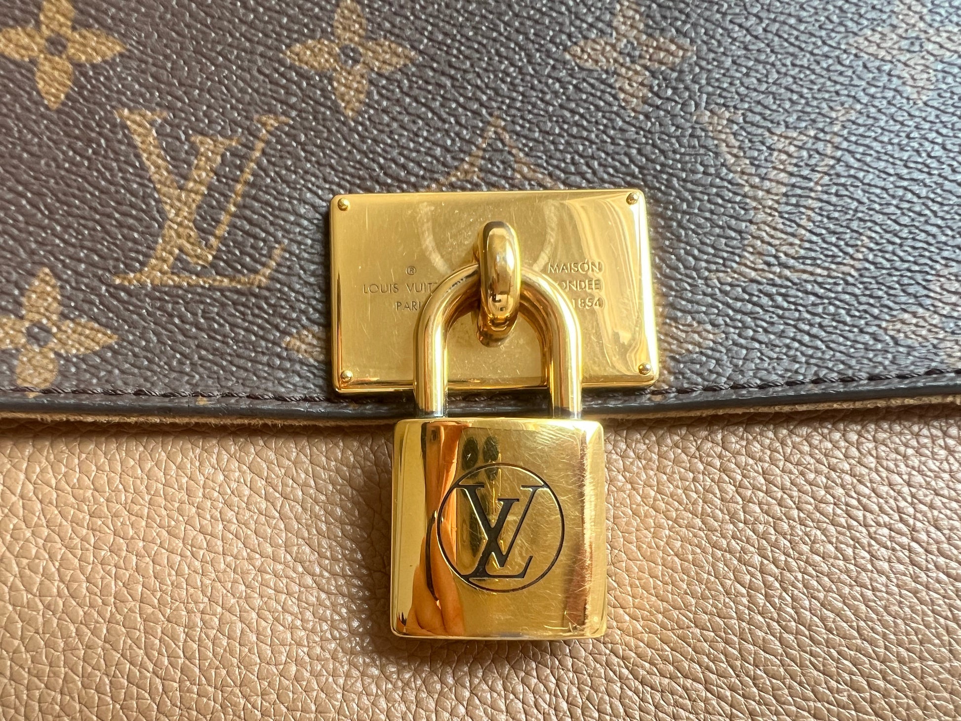 Louis Vuitton Marignan Bag in Monogram canvas and Sesame grained leather with gold hardware. This practical and stylish satchel is ideal for day to day wear with its multiple carry options. Crafted from a mix of grained leather and monogram canvas, featuring a magnetic lock to secure the flap. Can be carried by hand or worn cross body or over shoulder. 2019 year.