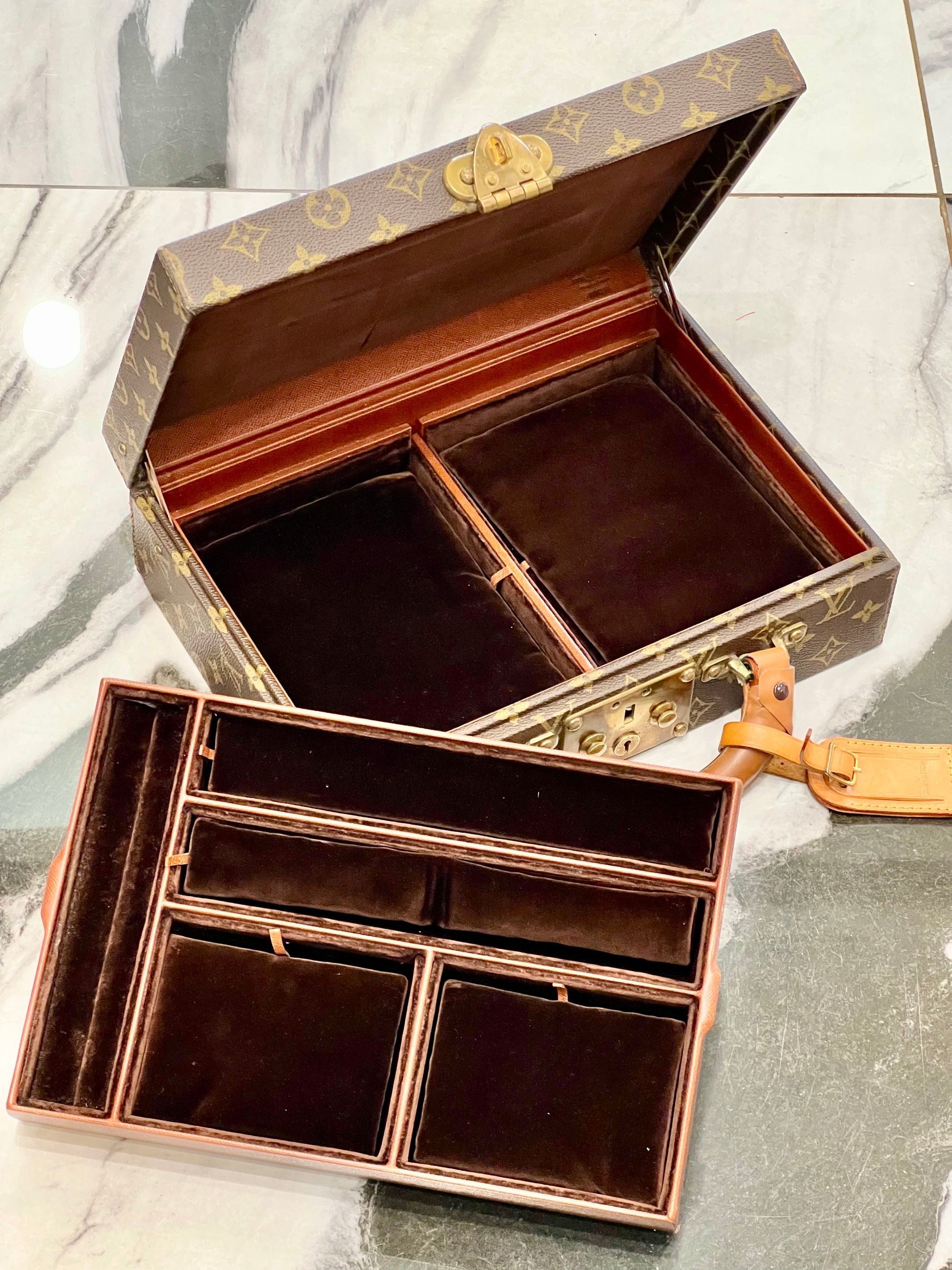 This stylish trunk is crafted of Louis Vuitton monogram on toile canvas. The case features a sturdy reinforced rolled Vachetta cowhide rolled leather top handle with brass clasps and a press lock and these open to a compartmentalized interior lined with microfiber fabric for all jewelry needs. This is an excellent jewelry case for the home or for luxury travel.