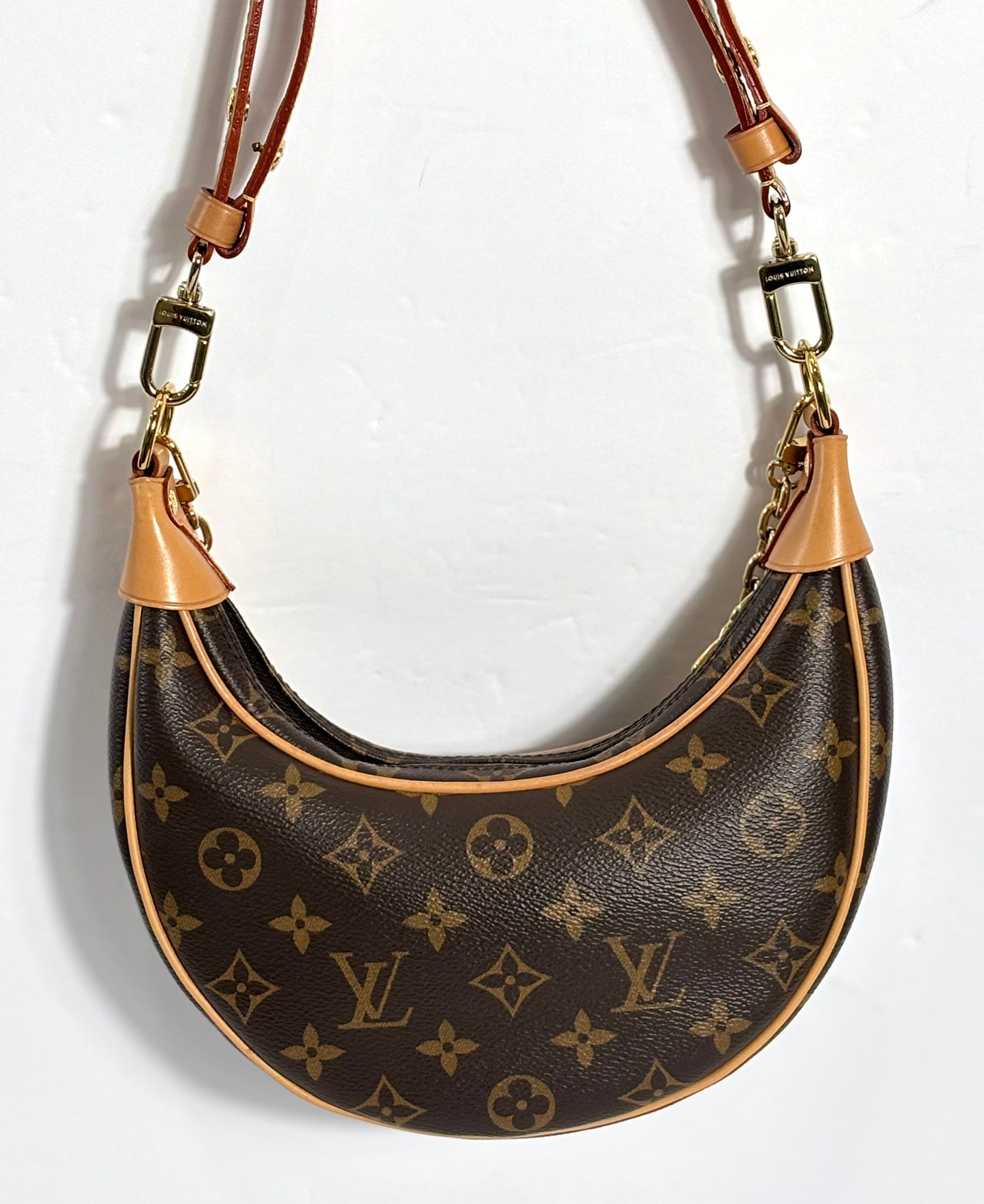 Designed by Nicolas Ghesquière for the Cruise 2022 Collection, the Loop bag is a modern reinterpretation of Louis Vuitton’s archival Croissant bag. Its compact, body-hugging half-moon silhouette is both stylish and functional, crafted from signature Monogram coated canvas with aged natural cowhide leather trim. This chic piece features a removable gold-tone chain for shoulder carry, as well as an adjustable leather strap for hands-free, crossbody wear.