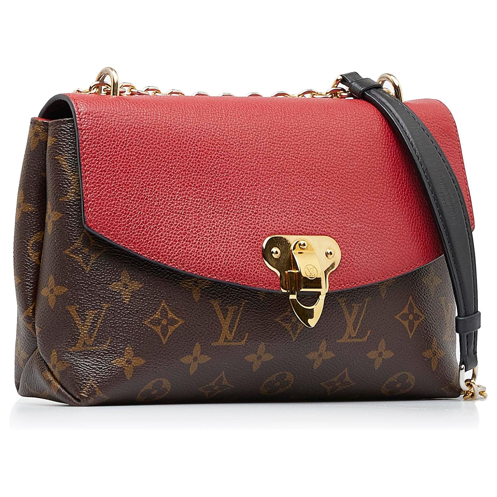 This Stylish Louis Vuitton Saint Placide Shoulder Bag is crafted from Classic Monogram canvas in brown, complemented by a vibrant Red Grained leather front flap.