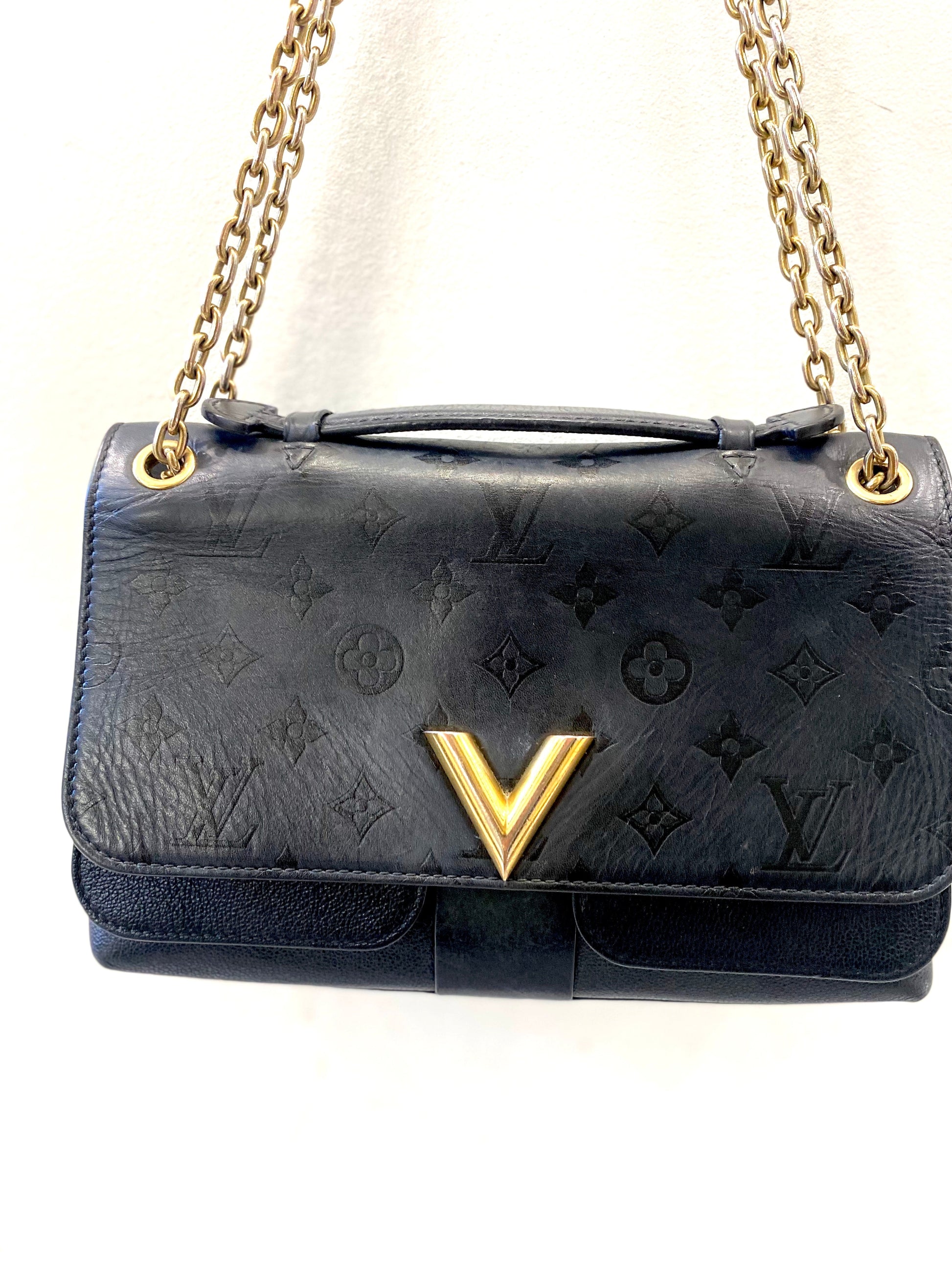 This Stylish shoulder bag is crafted of soft calfskin leather in black with a discreet LV monogram. The bag features a polished gold chain link shoulder strap and a polished gold Louis Vuitton V signature logo on the front flap. This opens to a partitioned black microfiber interior.
